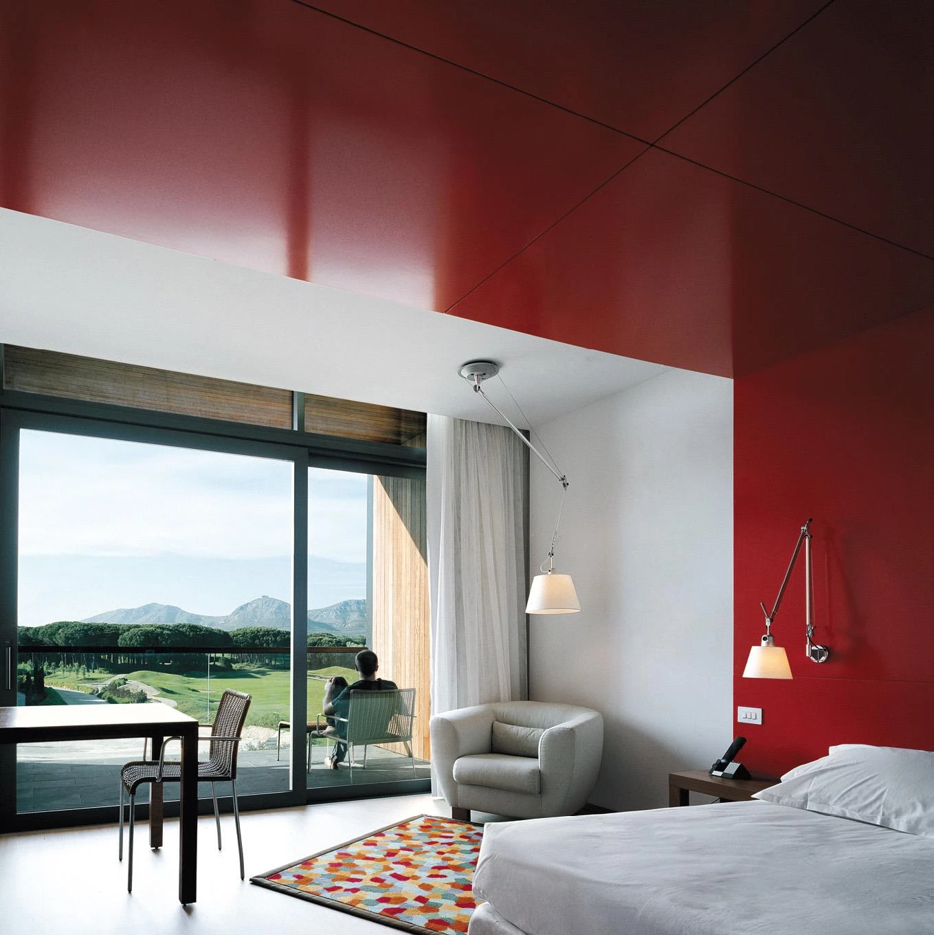 Un baldaquino de madera lacada en las habitaciones forma un primer marco dentro de una sucesión de filtros que complementa la acción de la carpintería y la terraza para encajar el entorno, incorporándolo al interior como un lienzo.