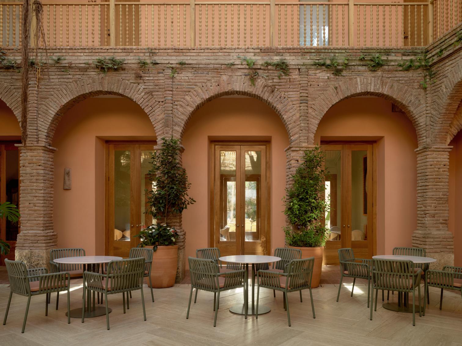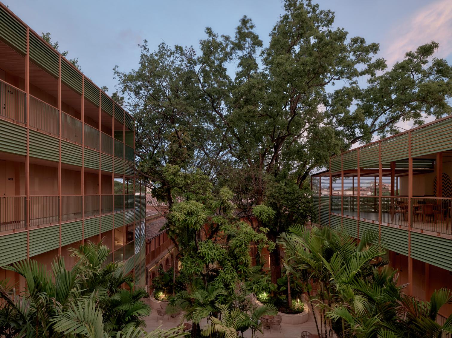 The heart of the hotel is its central courtyard, a fundamental element of the original construction that has been painstakingly preserved to conserve the existing vegetation. Accessible to guests and city residents alike, this space has also been enlarged, doubling its size on an upper level.