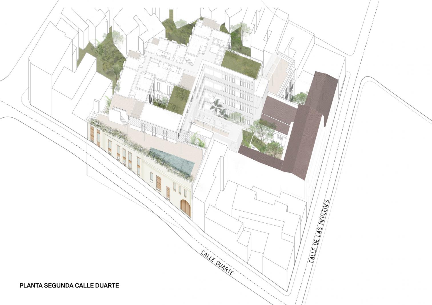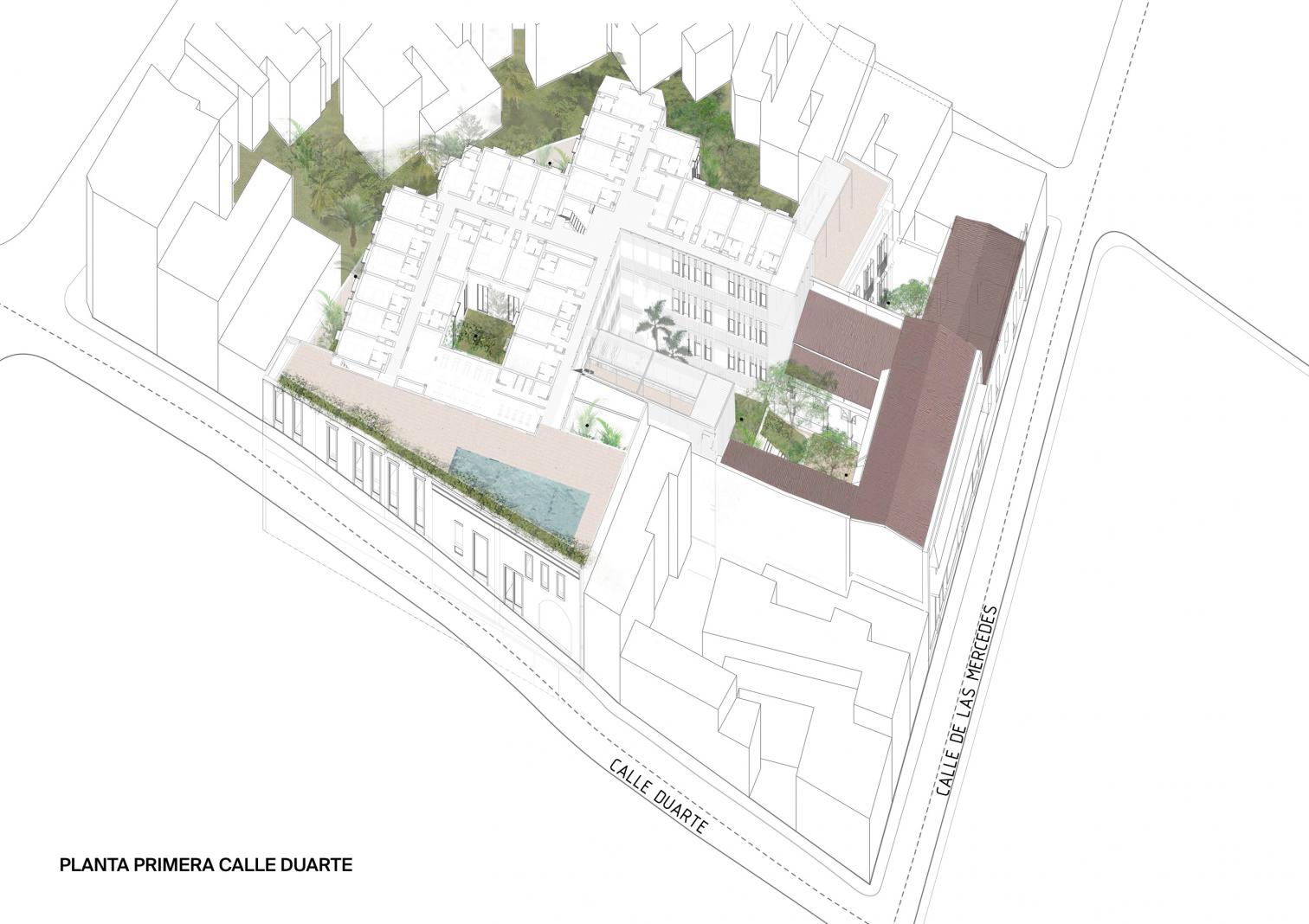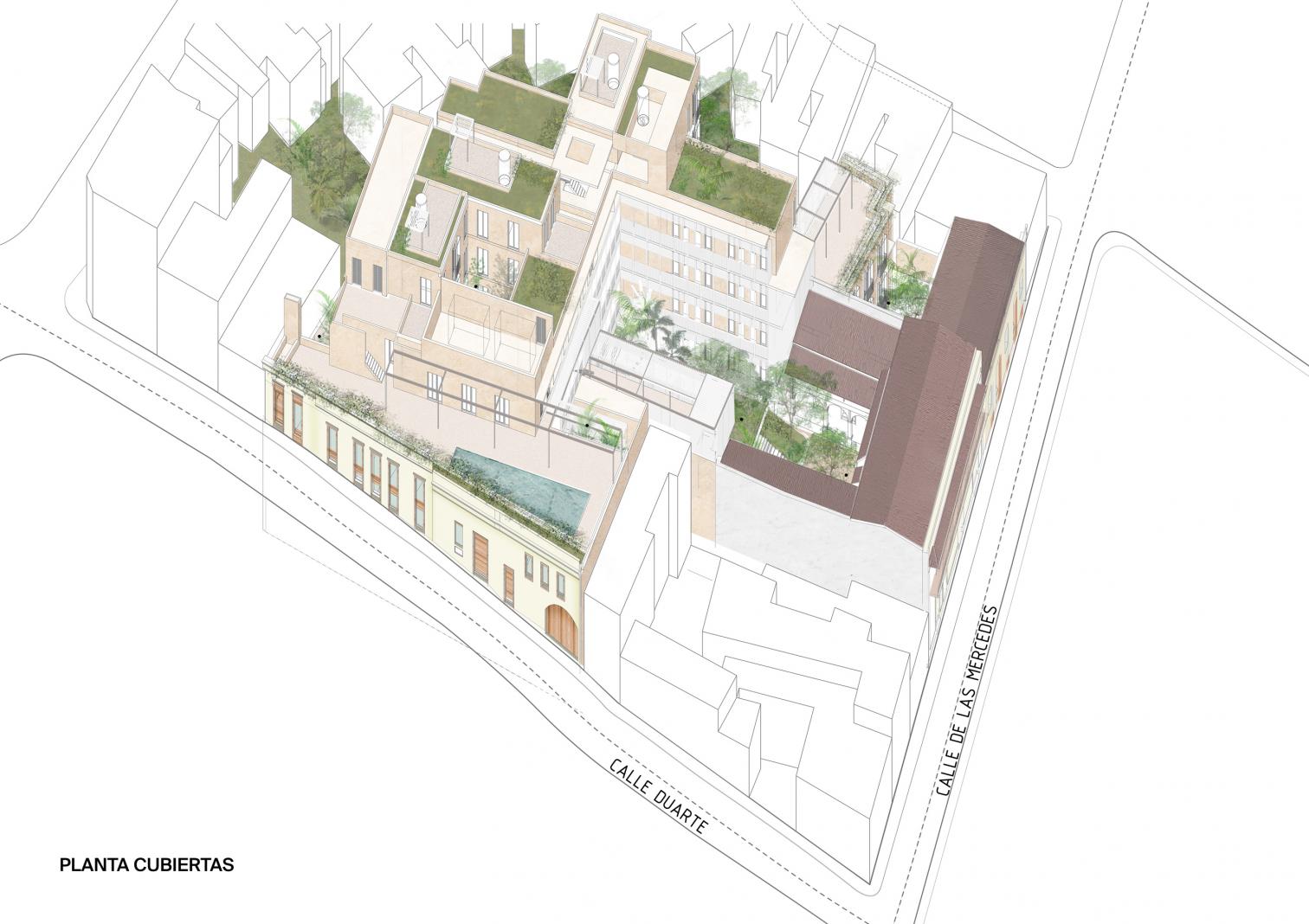 Located on Calle Mercedes and surrounded by the church of Alta Gracia, the monastery of San Francisco, and the ruins of hospital of Bari, the hotel pays homage to its historical environs. The new buildings have been set back from the street to respect the scale of the old center.