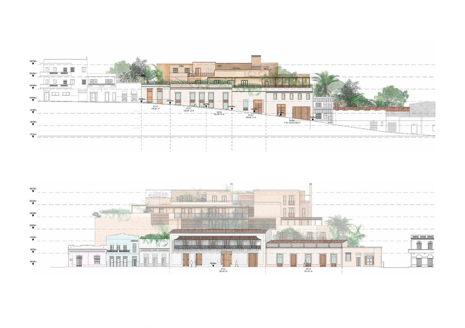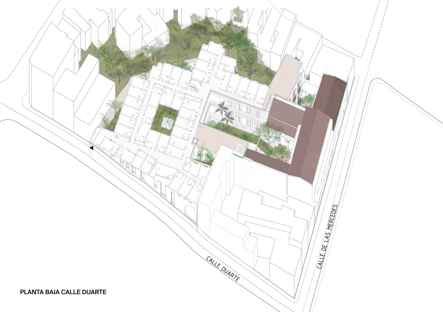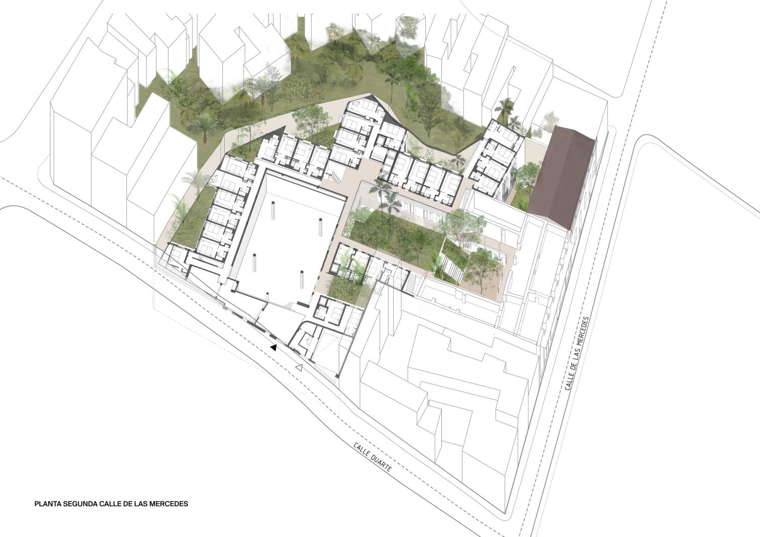 Located on Calle Mercedes and surrounded by the church of Alta Gracia, the monastery of San Francisco, and the ruins of hospital of Bari, the hotel pays homage to its historical environs. The new buildings have been set back from the street to respect the scale of the old center.