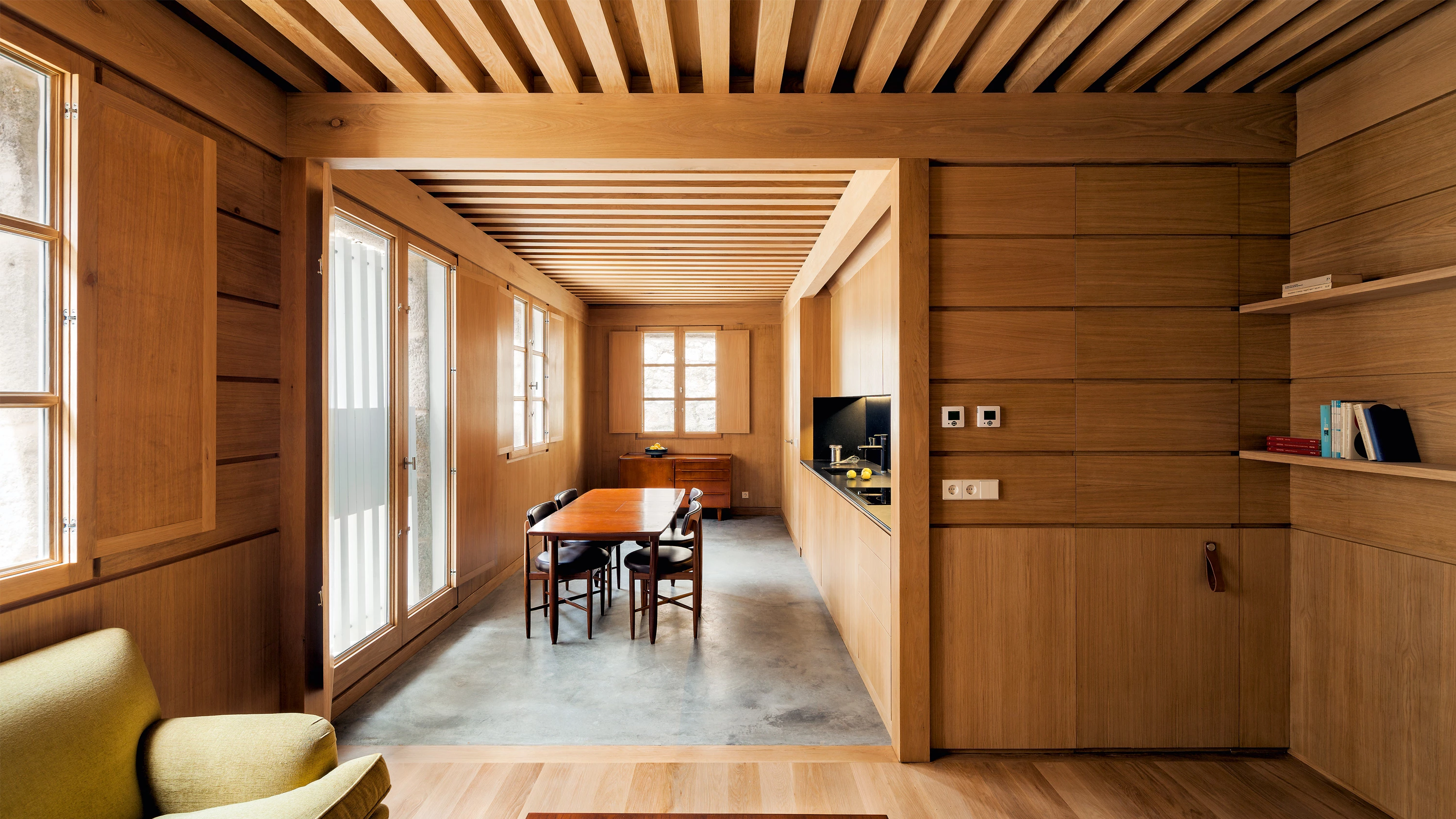 In this house of reduced dimensions located in the old part of the city of Baiona, the different rooms are defined by a series of variations in proportion, form, type of ceilings, and materials used.