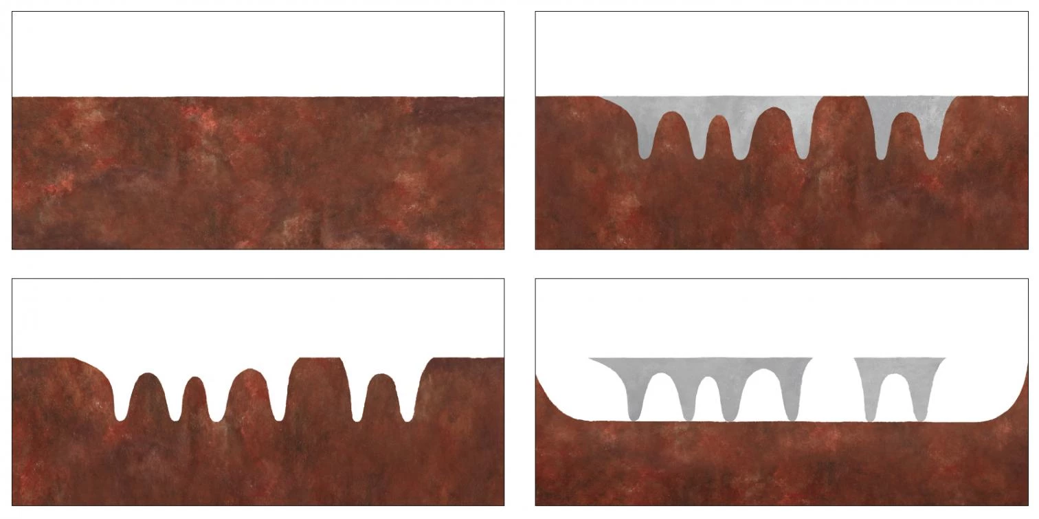 Though the resulting architecture appears to be excavated, it is in fact the result of a building process that involved working with a sort of ‘tectonic trompe l’oeil.’ Instead of excavating the terrain directly to create galleries, a series of holes was made in the ground and concrete was poured into them, serving as natural formwork of the slab. Once it was built, and after a long period devoted to design and calculation (seven years of studies were needed before undertaking the construction of the curved pillars), the terrain was dug out to generate the final effect: a reinforced concrete envelope that sinks into the terrain and twists in search of light.