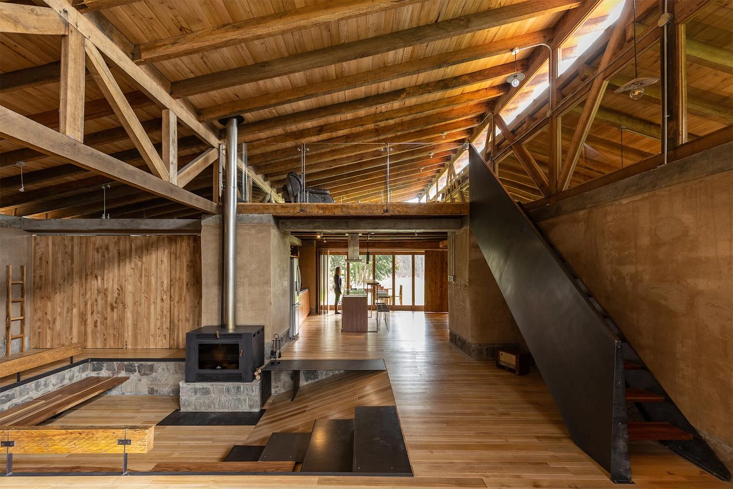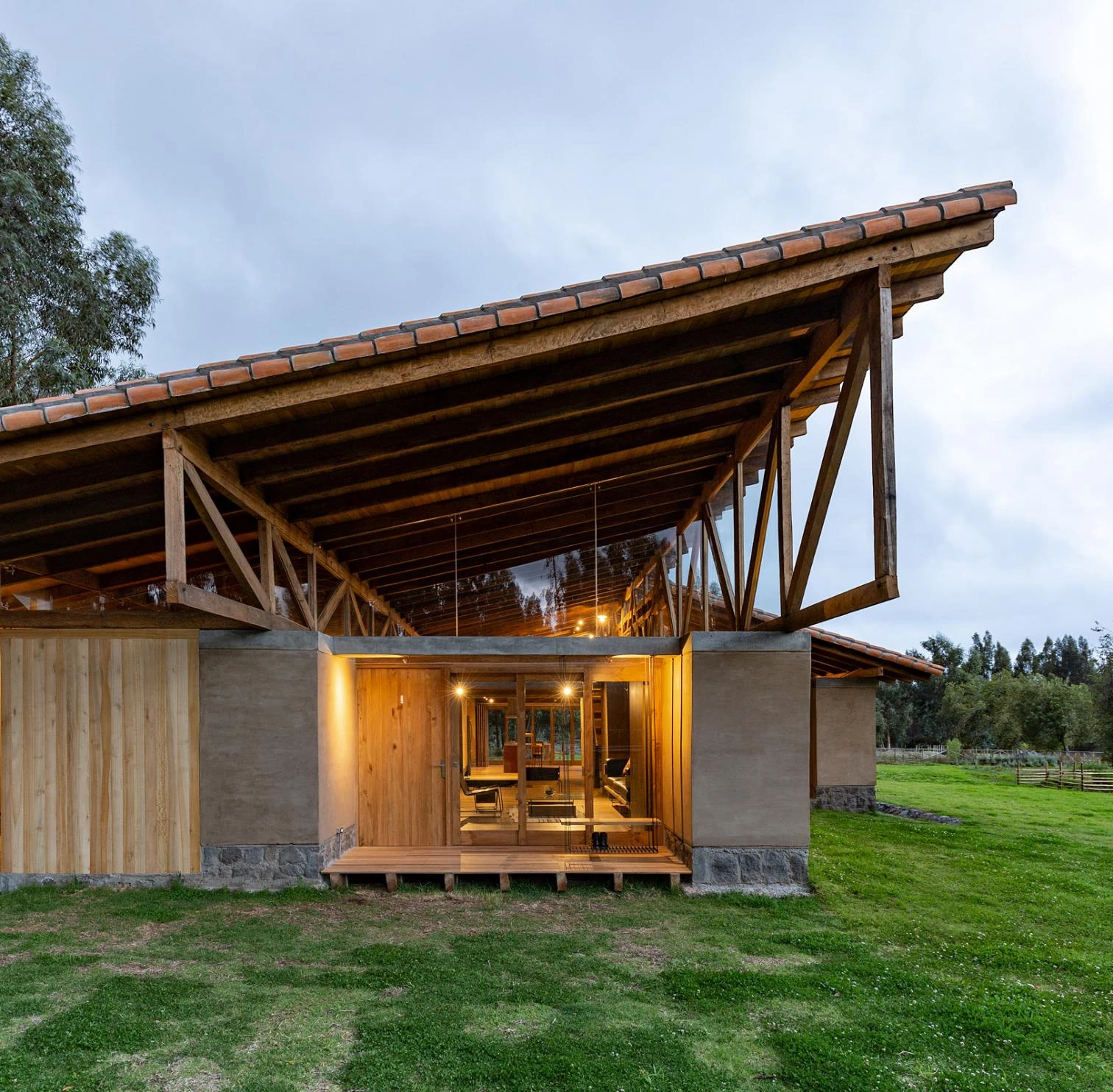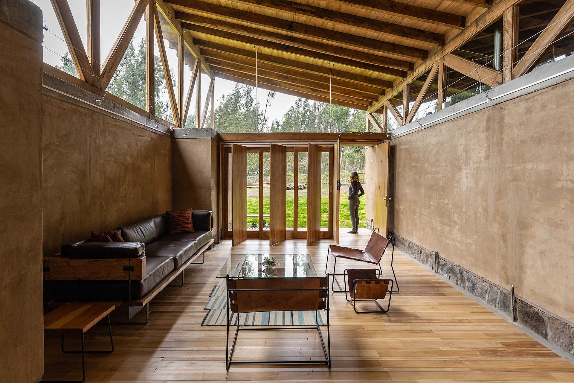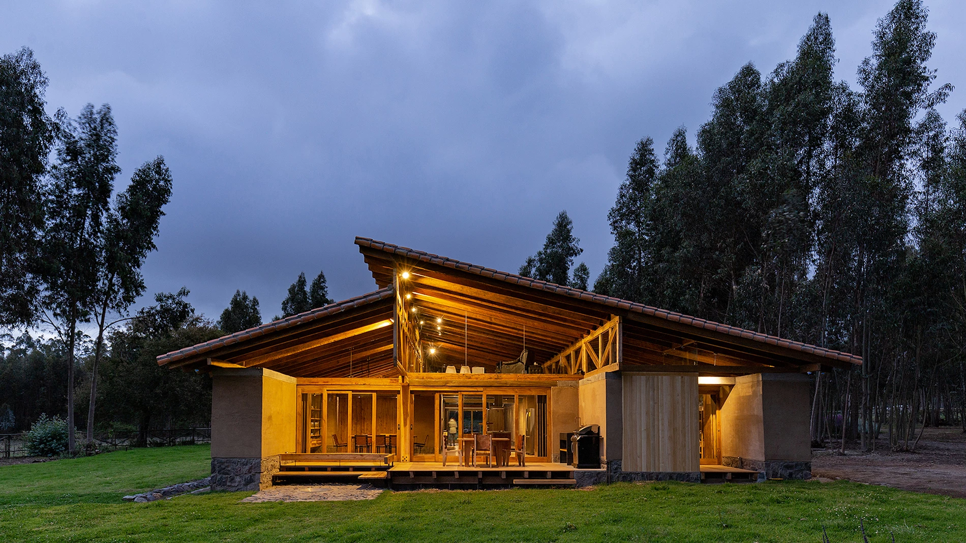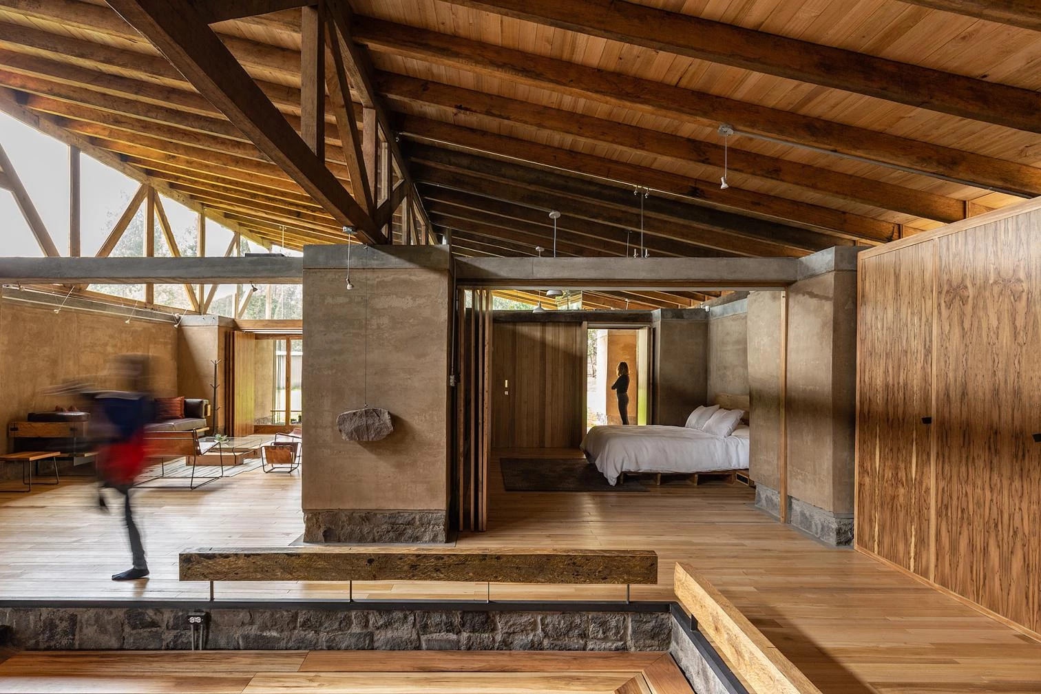 A rural environment in Lasso – in Ecuador's Cotopaxi province – is the location of this family home built by the Quito-based firm rama estudio, headed by Carla Chávez, Felipe Donoso, and Carolina Rodas. The 350-square-meter house was raised with vernacular construction techniques and local materials. Five loadbearing walls of rammed earth, 40 centimeters thick, are arranged longitudinally on the terrain, forming blind stretches of facade, with buttresses 80 centimeters thick. Furniture elements– kitchen, built-in beds, shelves, cabinets... – are embedded into the spaces between butresses. At the center of the house, where circulation flows meet, is a sunken hearth. From here the open and interconnected spaces can be closed up by means of pivoting panels, as needed. A slanting roof is made of a framework of timber beams held up by two central walls.