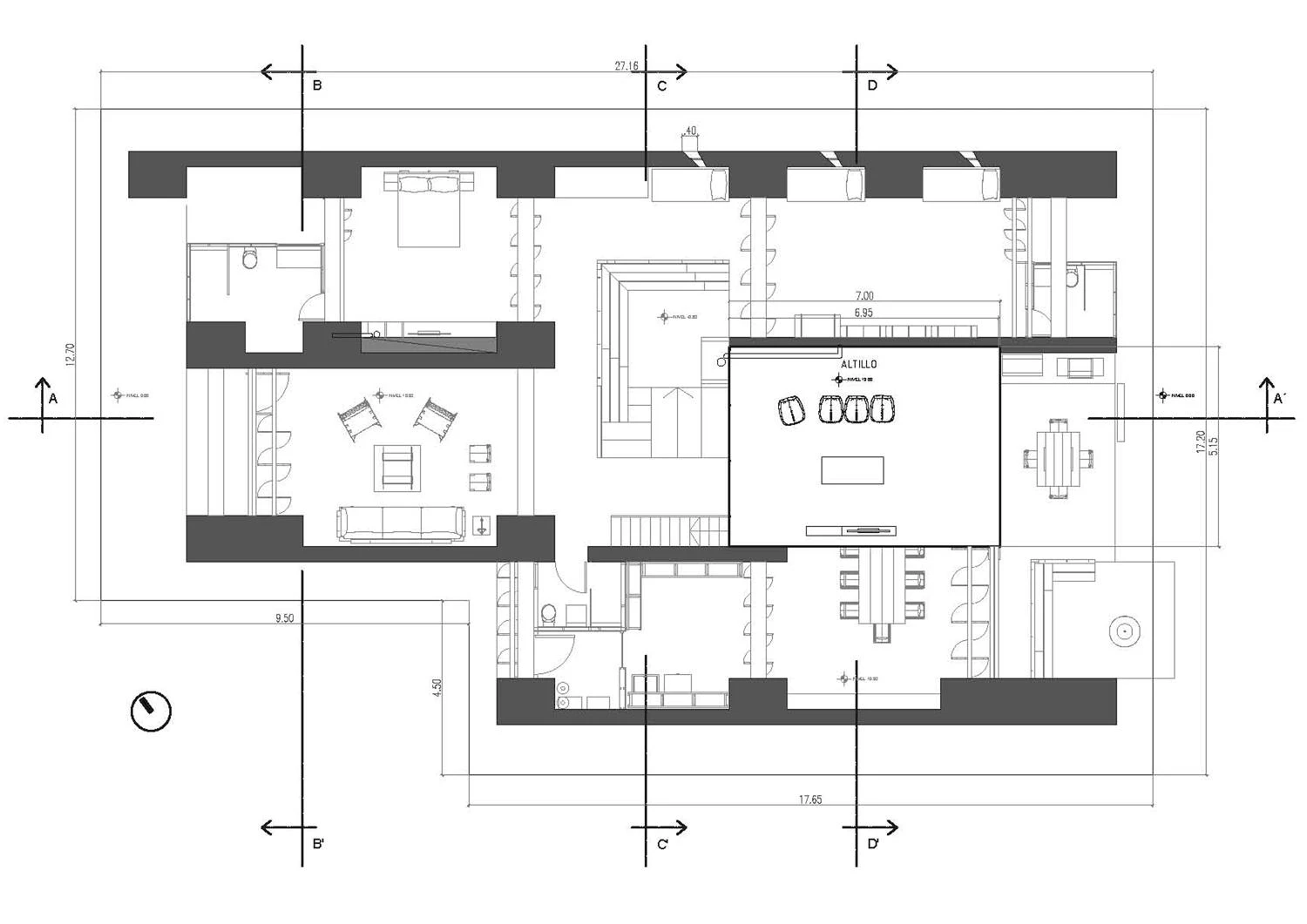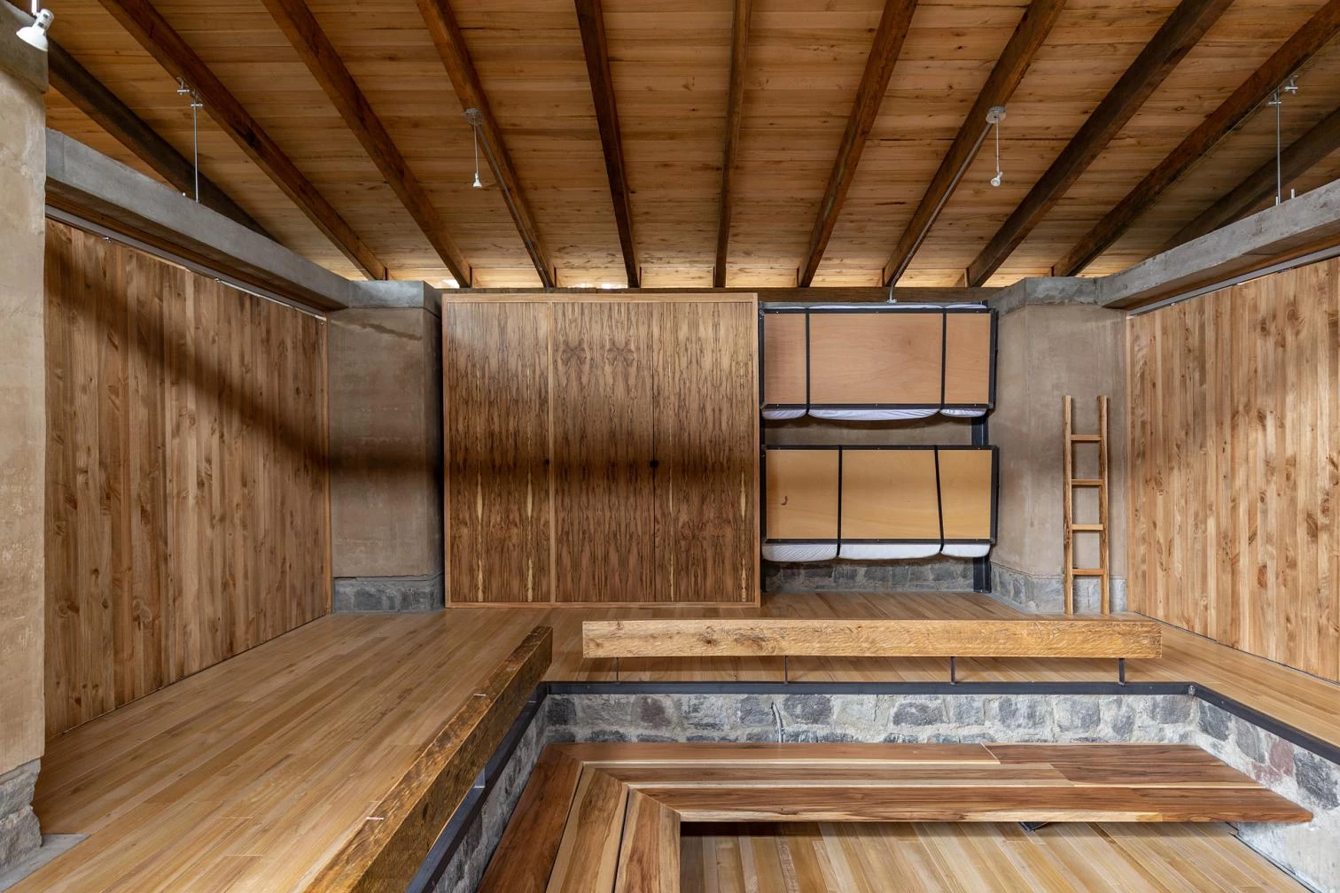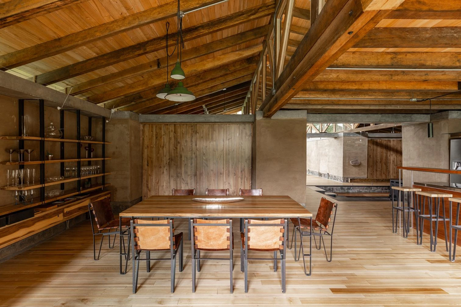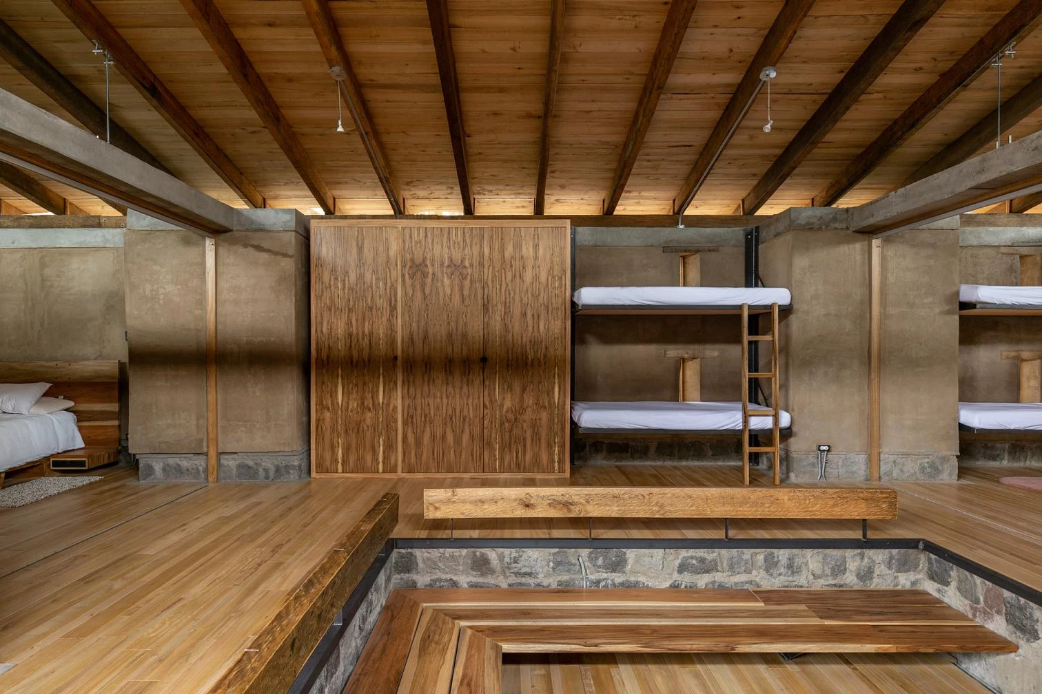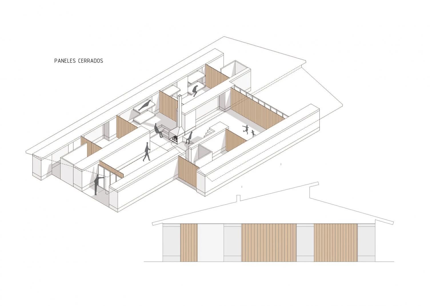 A rural environment in Lasso – in Ecuador's Cotopaxi province – is the location of this family home built by the Quito-based firm rama estudio, headed by Carla Chávez, Felipe Donoso, and Carolina Rodas. The 350-square-meter house was raised with vernacular construction techniques and local materials. Five loadbearing walls of rammed earth, 40 centimeters thick, are arranged longitudinally on the terrain, forming blind stretches of facade, with buttresses 80 centimeters thick. Furniture elements– kitchen, built-in beds, shelves, cabinets... – are embedded into the spaces between butresses. At the center of the house, where circulation flows meet, is a sunken hearth. From here the open and interconnected spaces can be closed up by means of pivoting panels, as needed. A slanting roof is made of a framework of timber beams held up by two central walls.