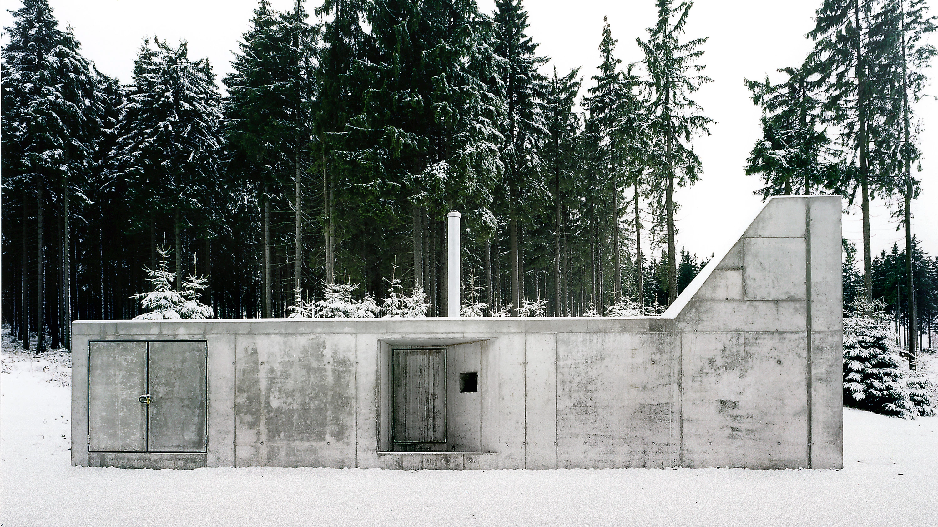 Volver a las experiencias elementales que procura la relación con lo natural es el propósito de este proyecto. Situada en el límite entre la naturaleza y la civilización, cerca de la montaña Fichtelberg (Sajonia) y en un paraje boscoso no lejos de una carretera, la cabaña Hutznhaisl es un refugio con capacidad para ocho personas. Es sencilla, espartana y sus cualidades estéticas se derivan sólo de cosas tangibles. Los muros y los techos son de hormigón armado, con acabado en bruto; los suelos son de gruesos tablones del árbol local más común, el abeto rojo; el mobiliario y los mecanismos se han reciclado de los contenedores de desechos. Por su parte, el aspecto exterior de la cabaña insiste en su condición de refugio: herméticos muros que contrastan, sin embargo, con la transparencia de los ventanales que se vuelcan al paisaje circundante.