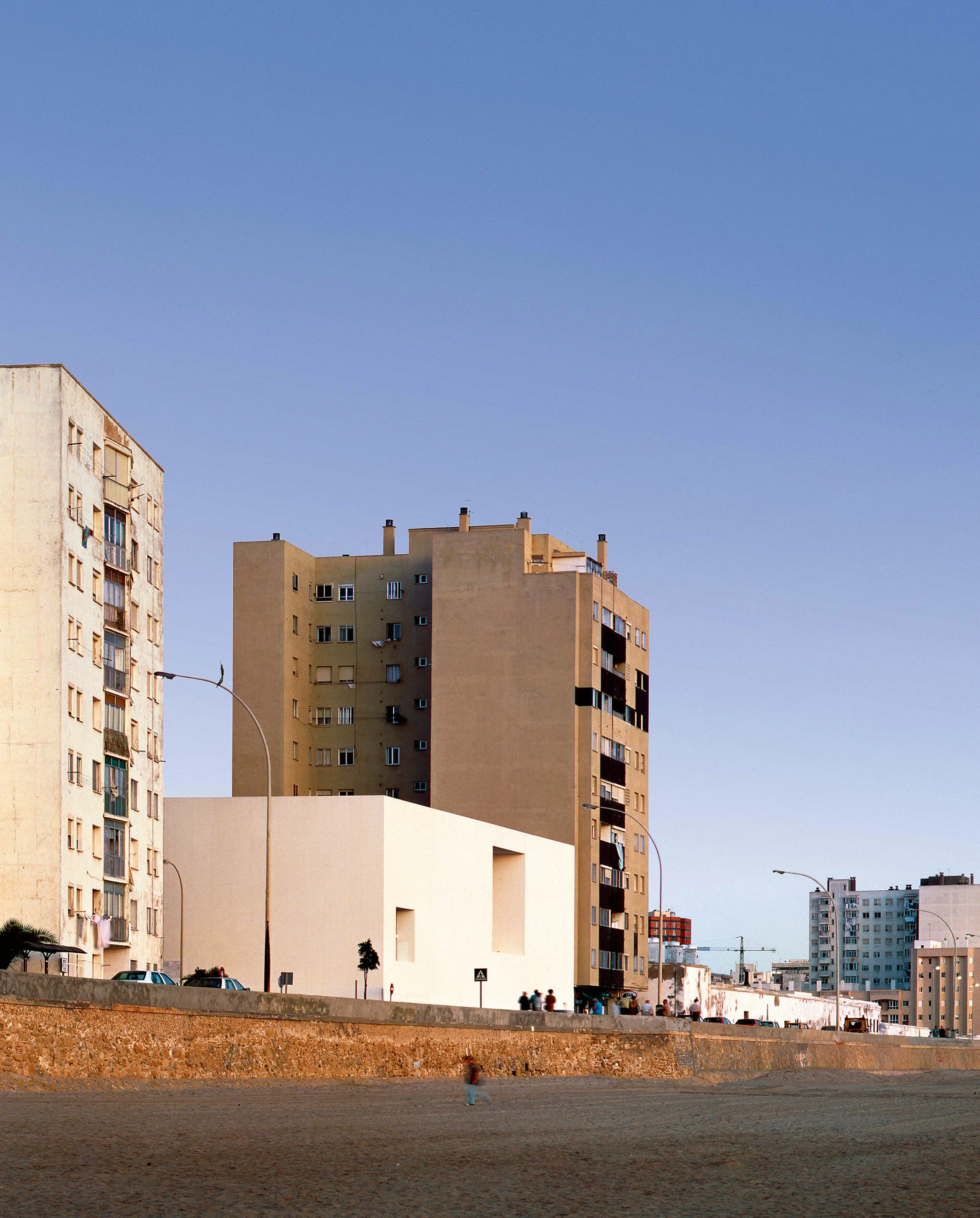 This building, with its striking white facade looking seaward, is conceived as a continuation of the long, extensive walls of the old ‘maritime’ cemetery of Cádiz.