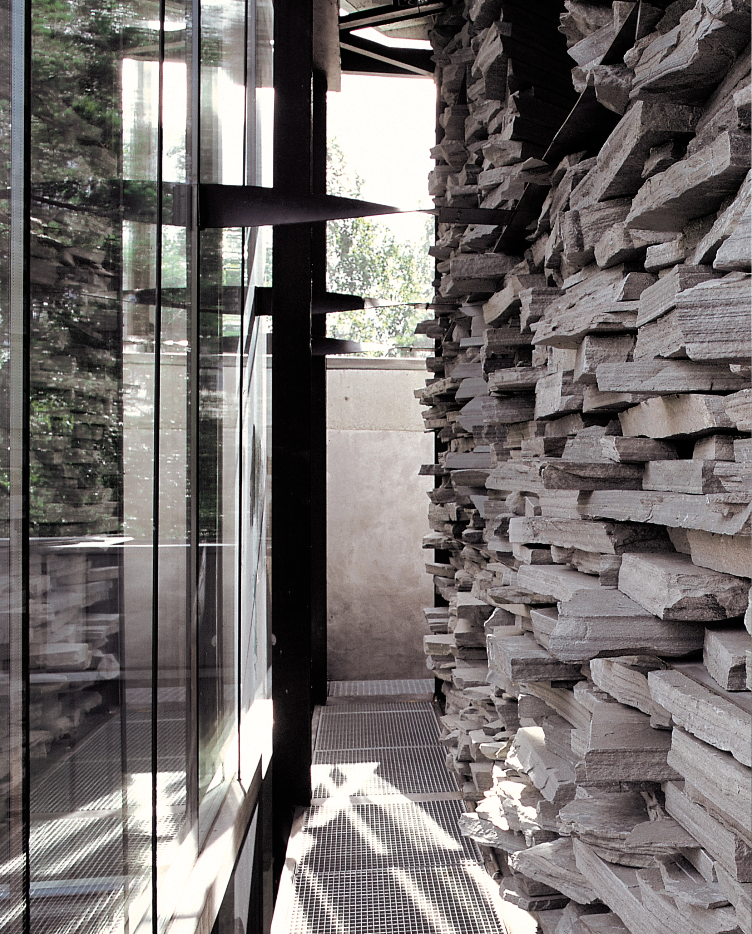 Two volumes constitute the project: the parish center, to the south, faces the temple itself, so forming a unit whose axis is aligned from north to south. Between one and the other, a square serves as the meeting point of the congregation after each religious service. The clumps of rock that emerge from the subsoil define the open spaces, delimiting the parking space and leading the flow of parishioners from the plot access to the precinct entrance. Without limiting the presence of vegetation and rocks on the surroundings of the temple, both aspects of the landscape are incorporated to the building, covering with grass the courtyards that act as a visual filter between spaces, and letting clusters of stone rise from the pavement, marking the itineraries and underlining the location of some elements associated to the liturgy, such as the podium for religious readings. Both the church and the parish house share the same compositional scheme, with a central space of great height protected along its entire perimeter by smaller rooms distributed in two floors. A double-pitched roof identifies the temple as a shelter, rounding off this silent space turned over itself whose lower part opens to incorporate the tree trunks as the backdrop of this place of worship.