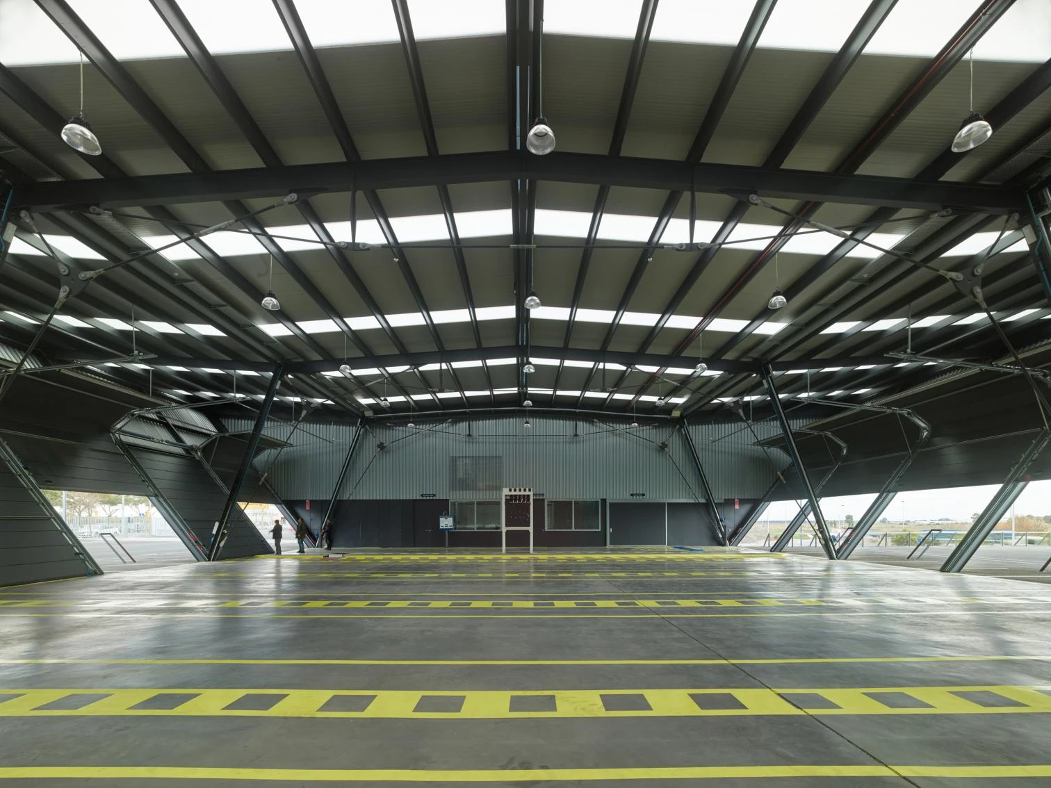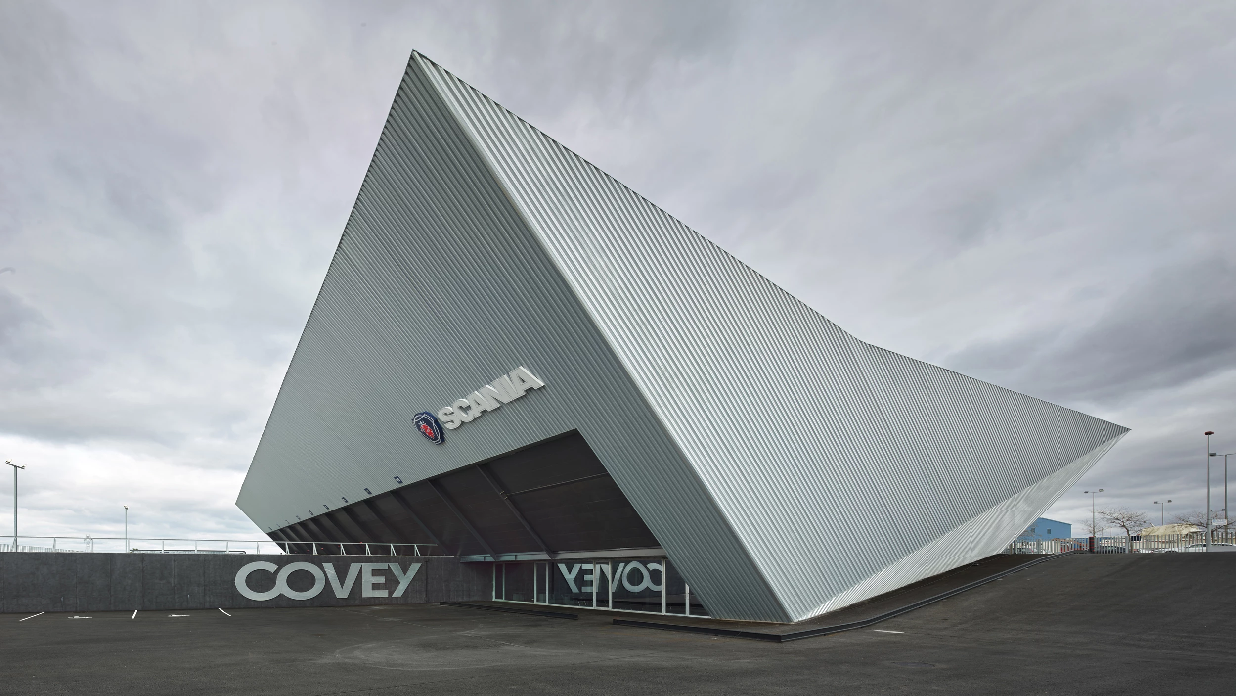 A single volume accommodates the entire program required by the Swedish manufacturer of heavy trucks, buses, and Diesel engines, a property of the Volkswagen Group. The functional container serves as advertising. On one hand is a large diaphanous, horizontal, toplit space used for tuning vehicles. On the other is the showroom, sales, and offices zone of several floors where daylight enters, capitalizing on the slope of the site. The building’s height varies from the 10 meters of the rear zones to the nearly 20 of the main west corner. Covered with a dry-joint metal cladding, a hybrid scheme rigidifies the structure by means of a system of beams and tautened pillars.