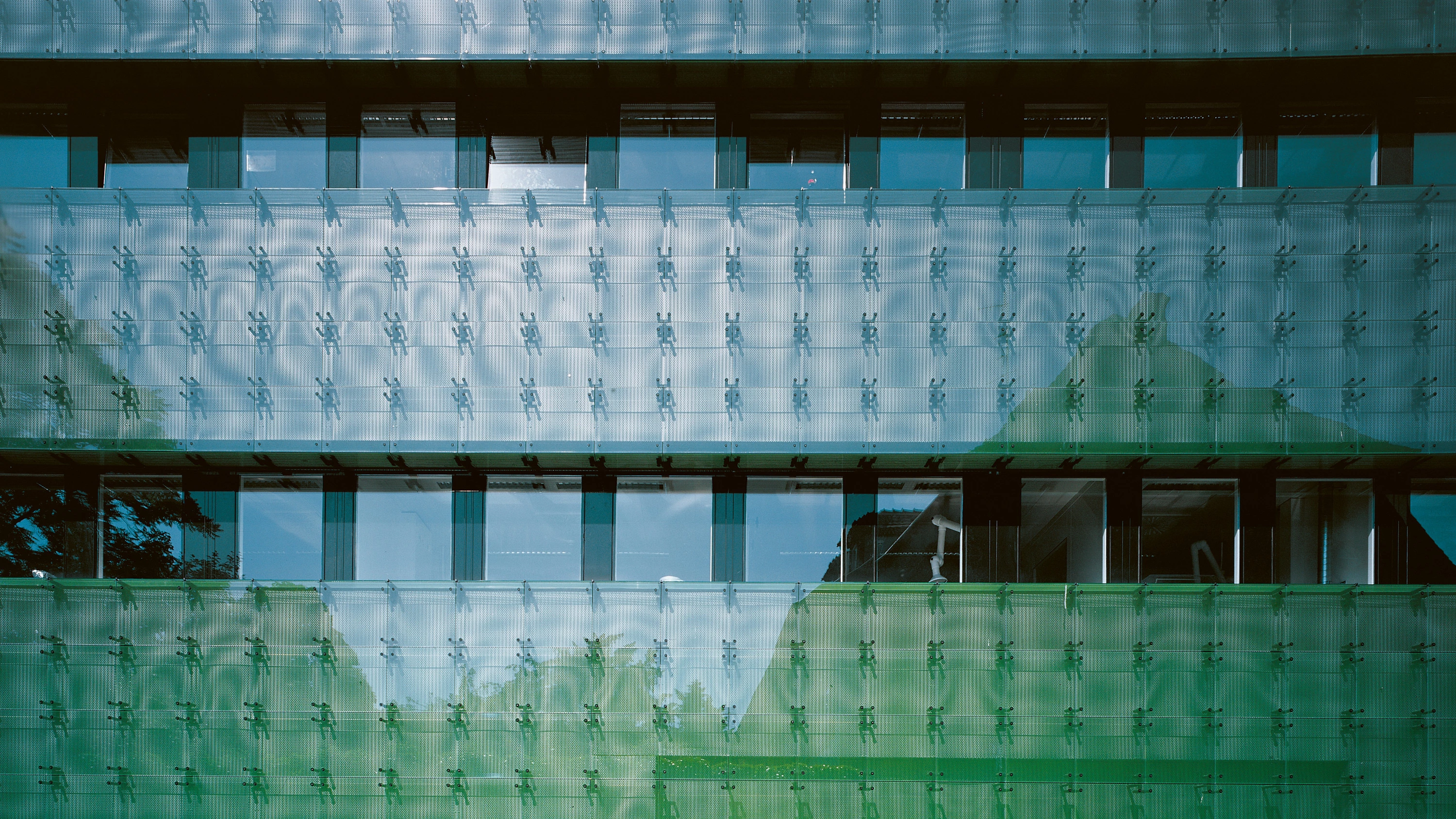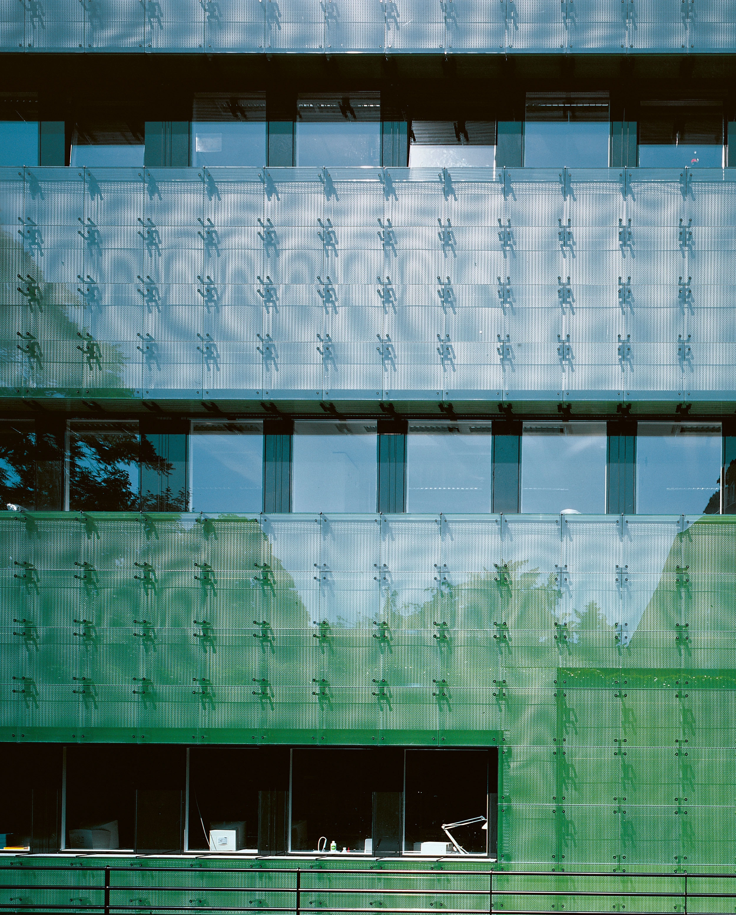 An envelope of screenprinted glass blurs the irregular prism resulting from the upward extrusion of the plan. Like a transparent halo, this screenprinted skin with a pattern of green dots traps the thirty centimeters of air separating it from the thermal line of the building. The perforations in the aluminium sheets that cover the insulation follow a differently sized grid which, when superimposed on the glass dots and the tie bars, produces a moiré effect, optically diminishing the construction size. This is not a standard curtain wall hiding offices. Here, the transparent panes are not installed to establish a relationship between interior and exterior, but rather to exploit its optical qualities over the opaque materials. The changing angle of light presents the pharmaceutical centre as a compact solid, a reflection of the surrounding trees, or an ethereal body that circumspectly reveals the events taking place inside. The windows, providing the office workers with outside views, drill through this tense surface, displaying their composite layers. A panel of artificial ivy indicates the staff entrance and is used to support the vegetation climbing up the facade in a visual allegory of the synthetic processes used within the building to turn plants into medicine.