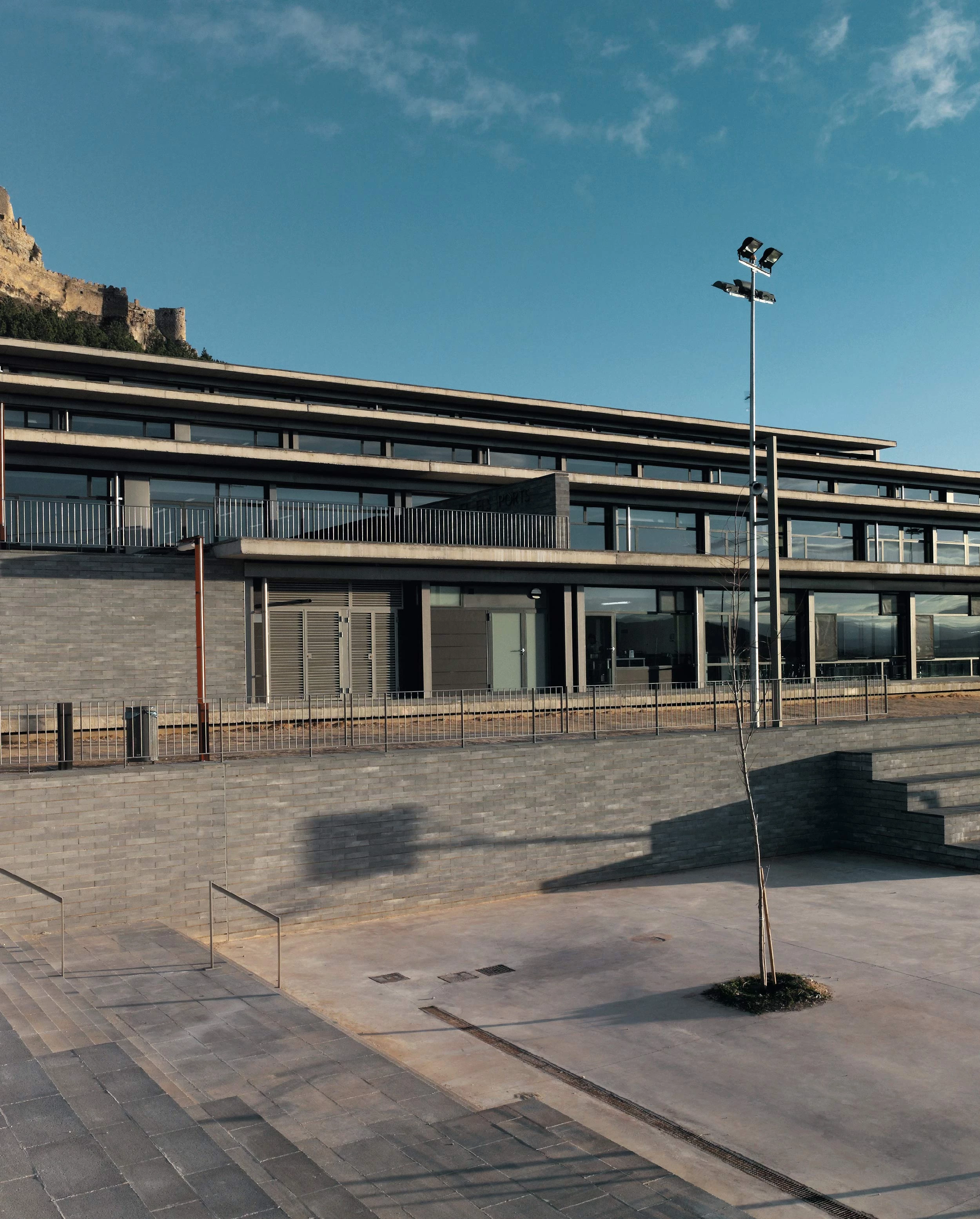 The high school leans on the terrain, organized in the form of terraced strips; in this way, the classrooms open to the impressive views of Els Ports and the castle, and the gym and courtyard are placed in the lower platforms.