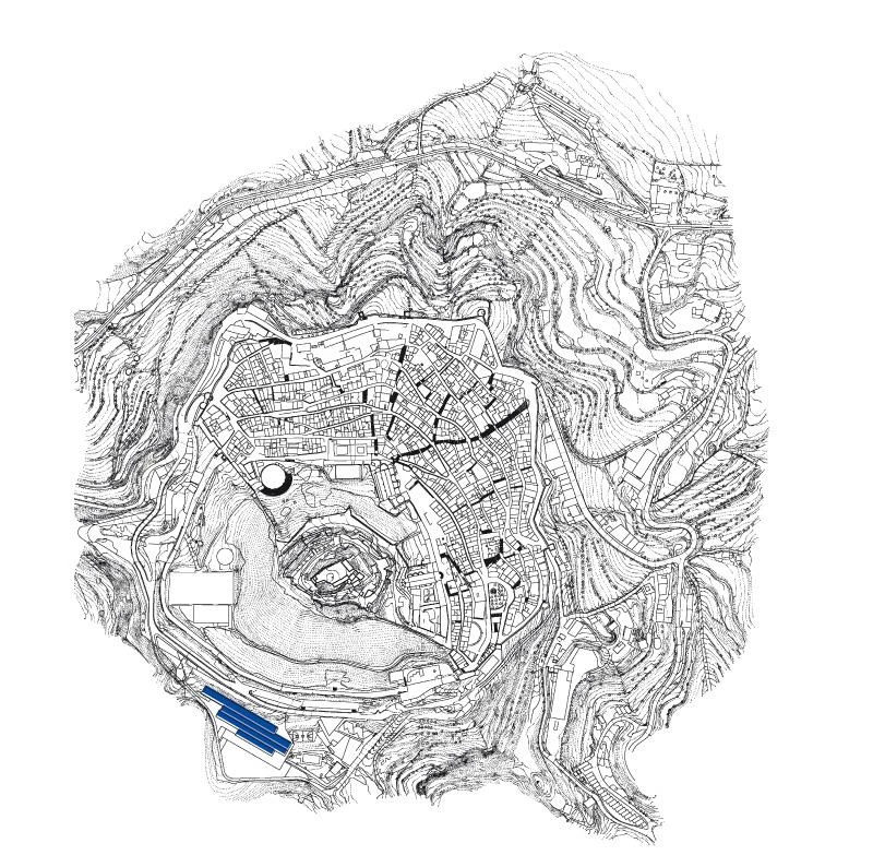 The urban grid is filled with streets that adapt to the contour lines, interconnected by paths that span their deep incline with stairs or ramps. The desire to blend the building into the surrounding landscape, both natural and urban, becomes the main guideline to determine both its organization and form.