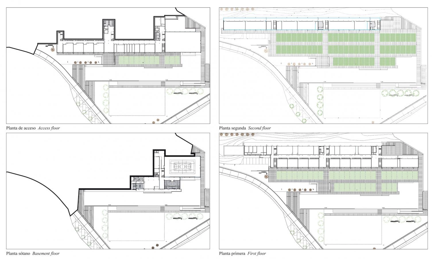 The decision to arrange the different areas of the program starting from the changing heights of the terrain led to the design of four terraced floors and two platforms that accommodate the courtyard and a sports field. The connection with the environment is accomplished not only through the formal mechanisms used, but also through the location of the place and the materials. The building rests on a lower level with respect to the Alameda promenade, presenting passers-by with unobstructed views of the landscape.