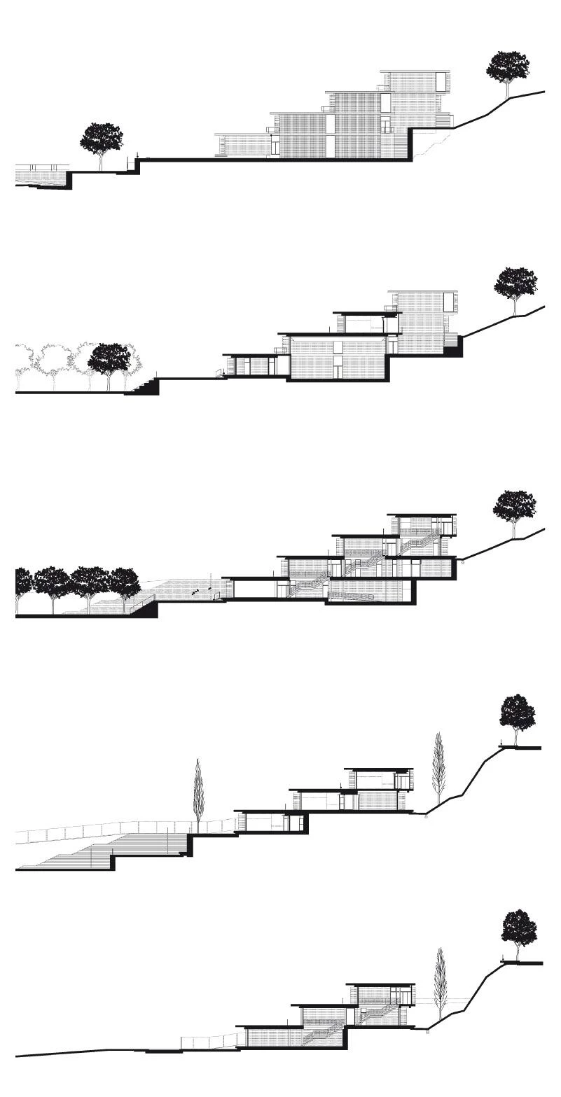 The two first floors are drawn up as lower-ground basements adhered to the hillside, and their corridor services a single row of classrooms and halls. The following level is detached from the terrain, inserting a courtyard that brings natural light into the laboratory wing; a corridor links them up with another row of classrooms. The last floor repeats the same organization, and opens up to the panoramic views..