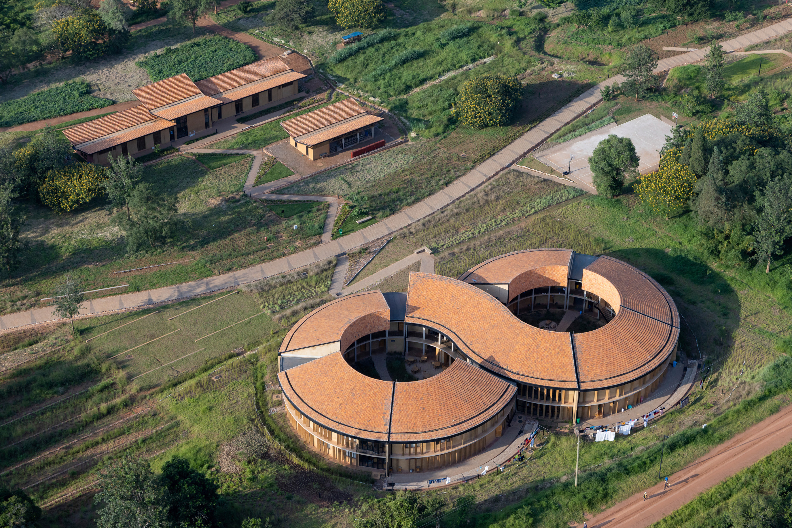 The accommodation building for second- and third-year students is distinctive because of its shape: a figure eight containing two circular courtyards. This was drawn from traditional Rwandan architecture and from pivot-irrigation fields. The dimensions of the eight’s two circles were determined by the desire to optimize the use of earth blocks, minimizing the cutting thereof.