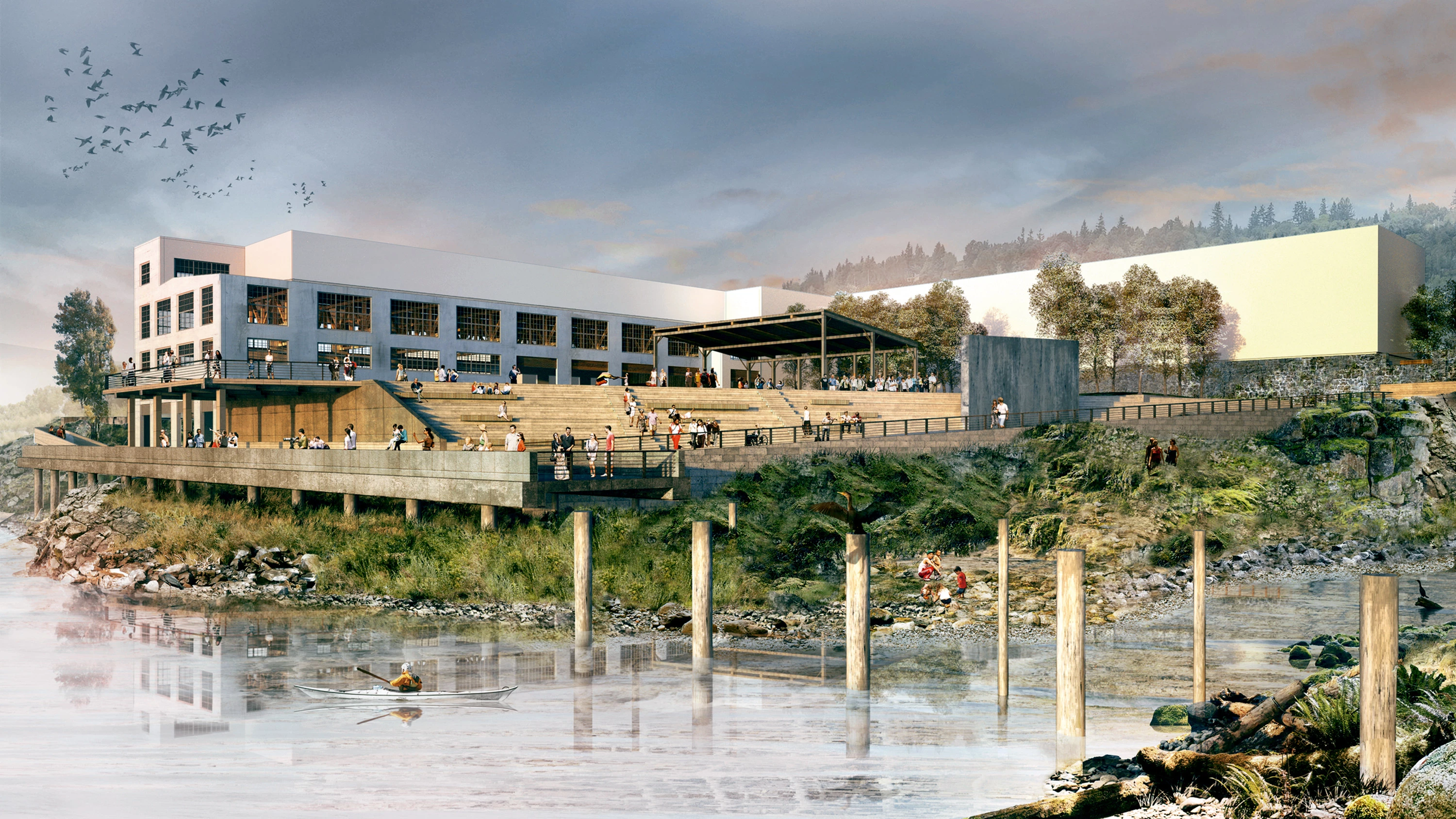 Together the boilers and Mill H structures provide an iconic destination by the edge of the river. Mill H is fragmented into three distinct volumes: a conifer grove, a children’s play tower, and a structure with two viewing platforms in the upper and lower levels.