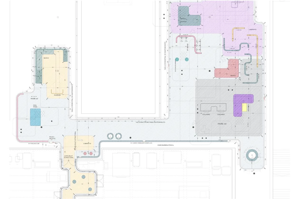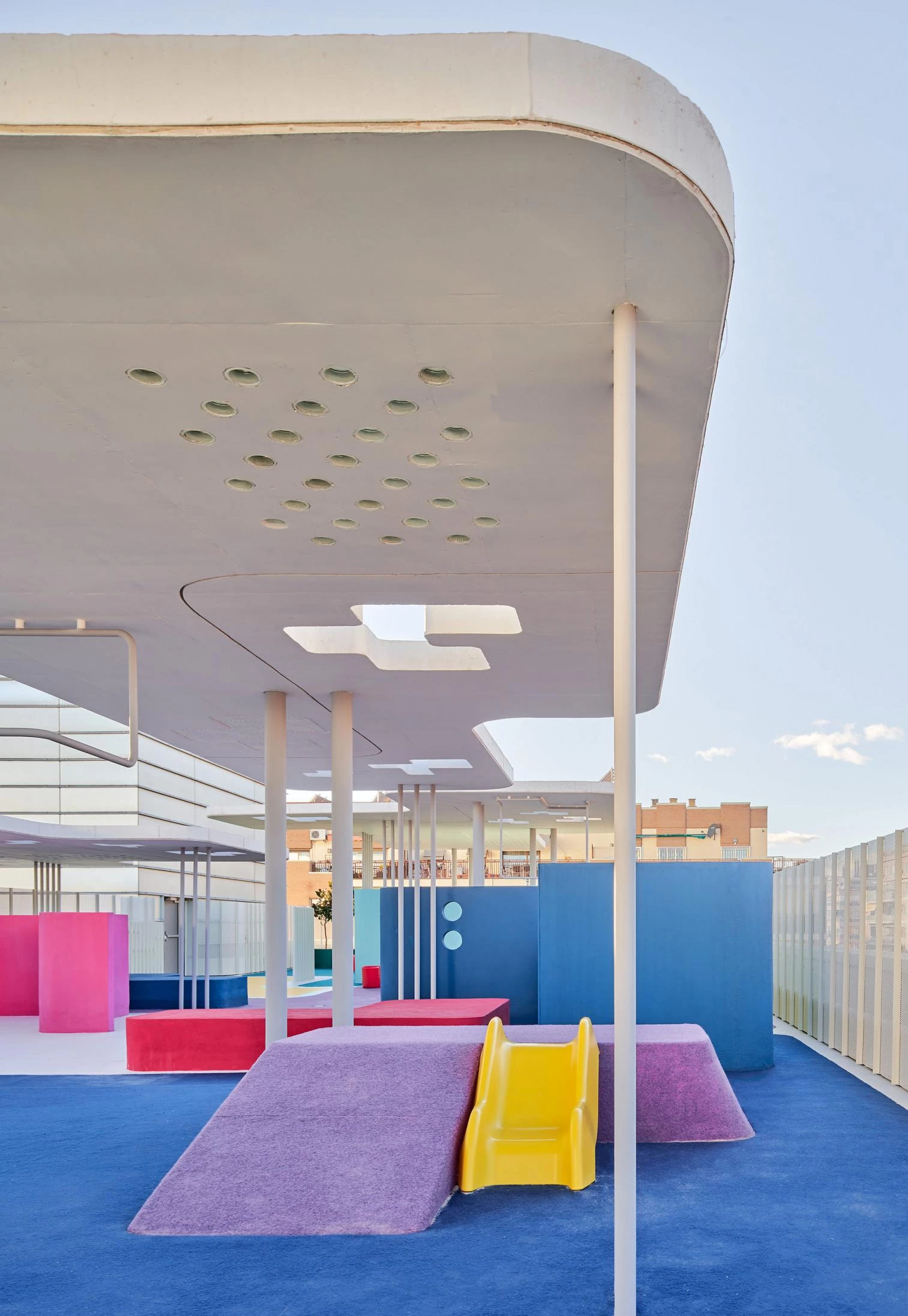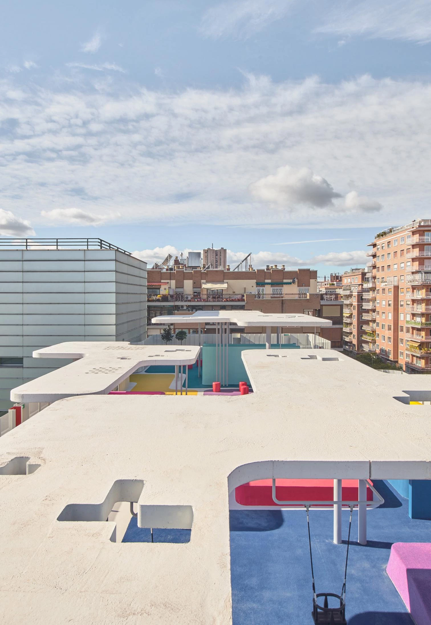 Through a project carried out by Francisco José Padilla and Juan Manuel Nicás on the initiative of Fundación Juegaterapia, the roof of Gregorio Marañón Hospital’s maternity and neonatal building – a 2003 work of the architect Rafael Moneo, in collaboration with José María de la Mata – is now a playground enabling confined children to play in the open air. Curving slabs of white concrete varying in height and size are held up by thin cylindrical supports. Their undersides present nuances: glass panes, perforations, ceramic mosaics. Colored patches of the floor mark areas for activities and games.