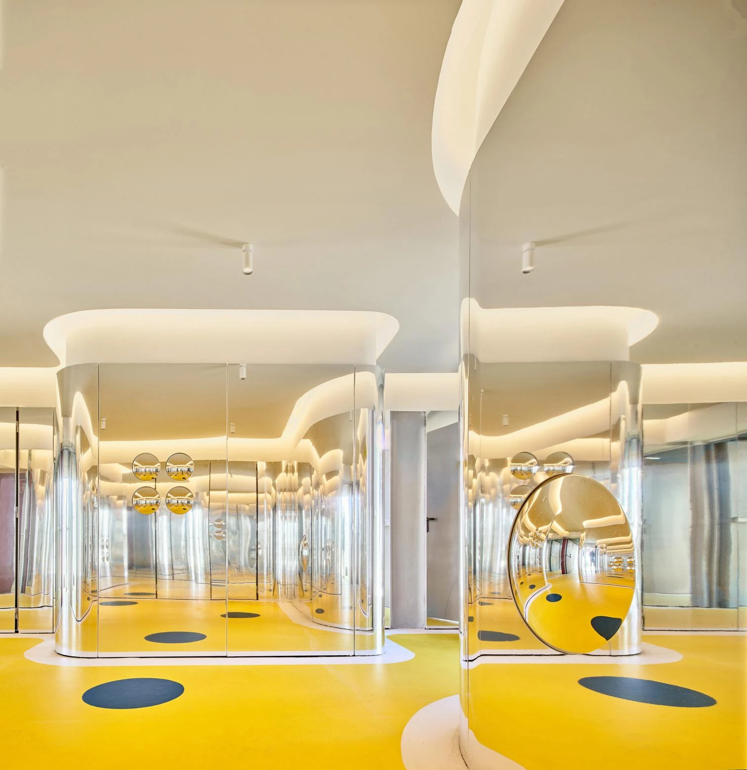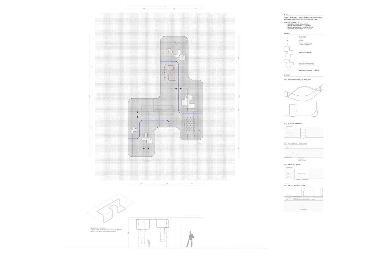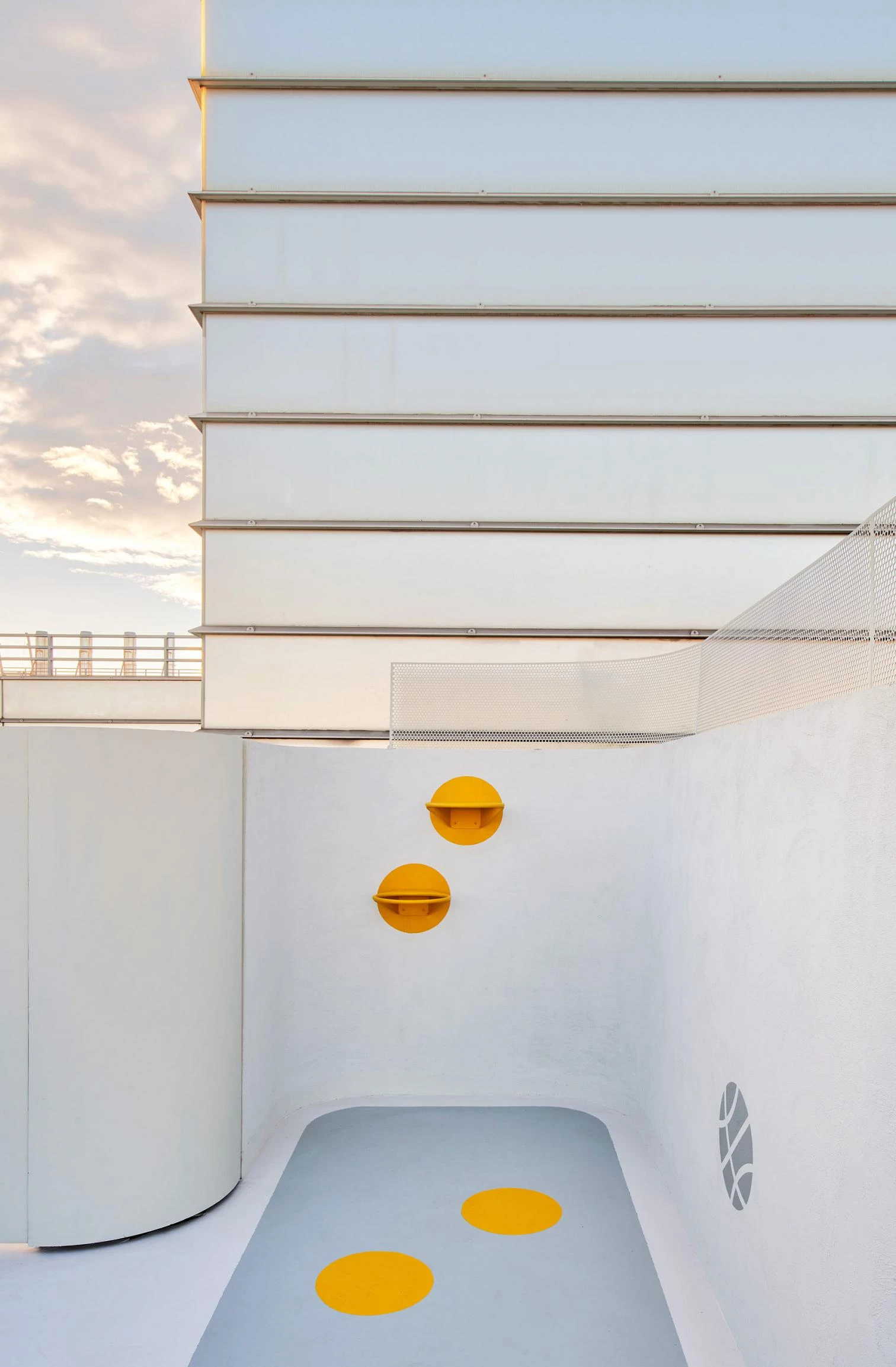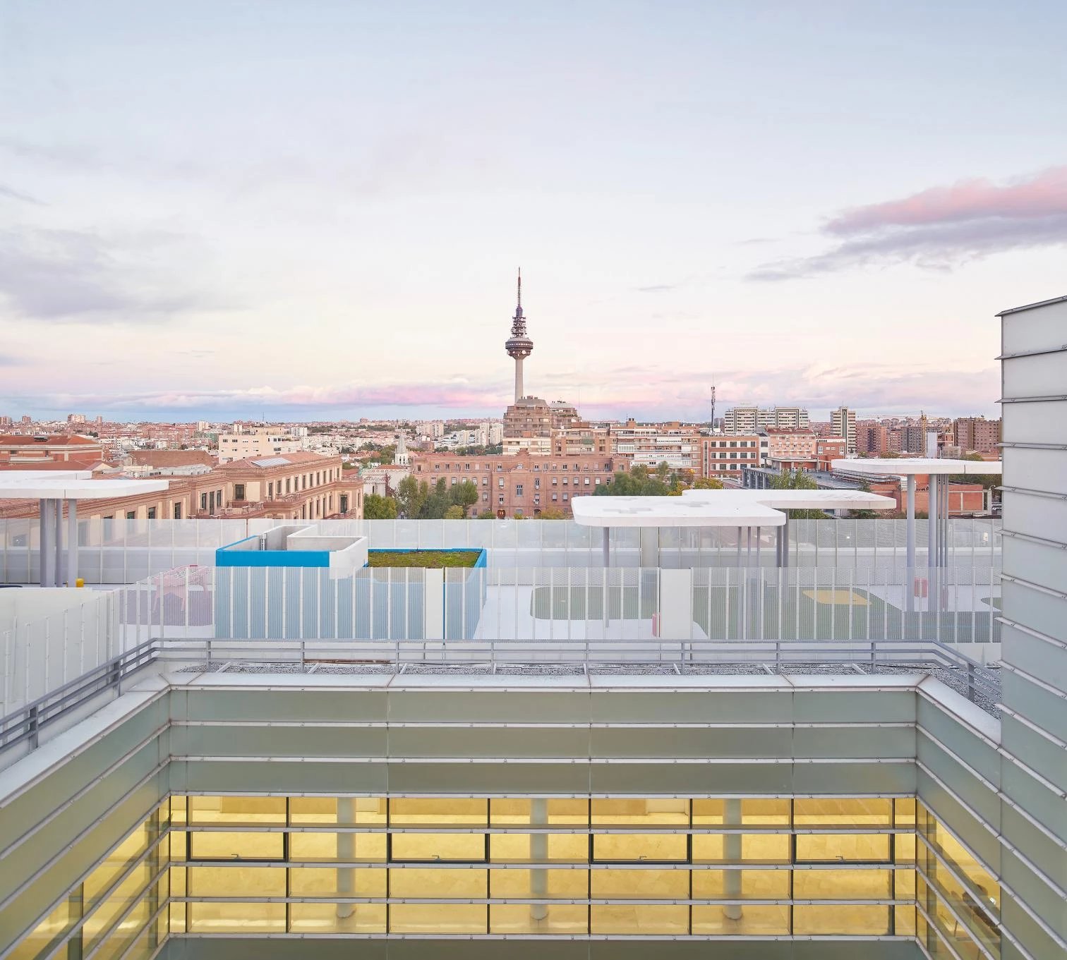 Through a project carried out by Francisco José Padilla and Juan Manuel Nicás on the initiative of Fundación Juegaterapia, the roof of Gregorio Marañón Hospital’s maternity and neonatal building – a 2003 work of the architect Rafael Moneo, in collaboration with José María de la Mata – is now a playground enabling confined children to play in the open air. Curving slabs of white concrete varying in height and size are held up by thin cylindrical supports. Their undersides present nuances: glass panes, perforations, ceramic mosaics. Colored patches of the floor mark areas for activities and games.