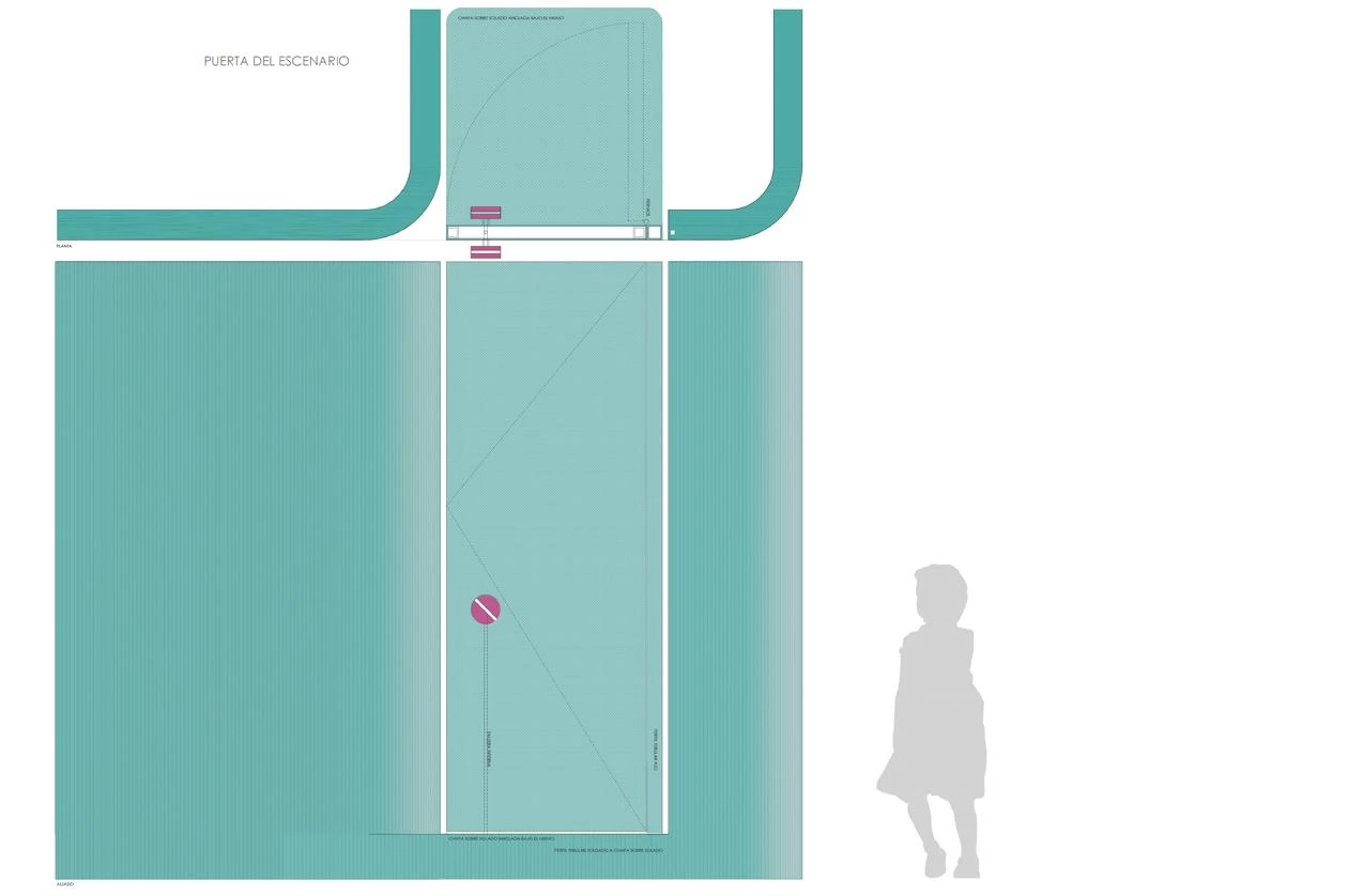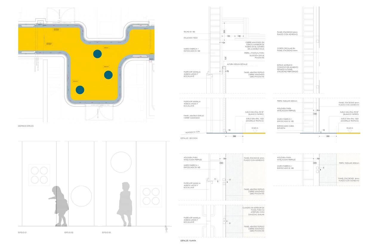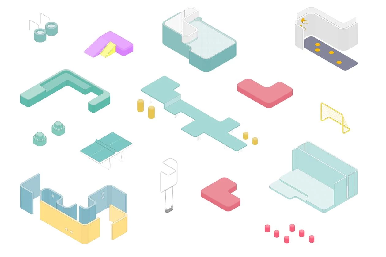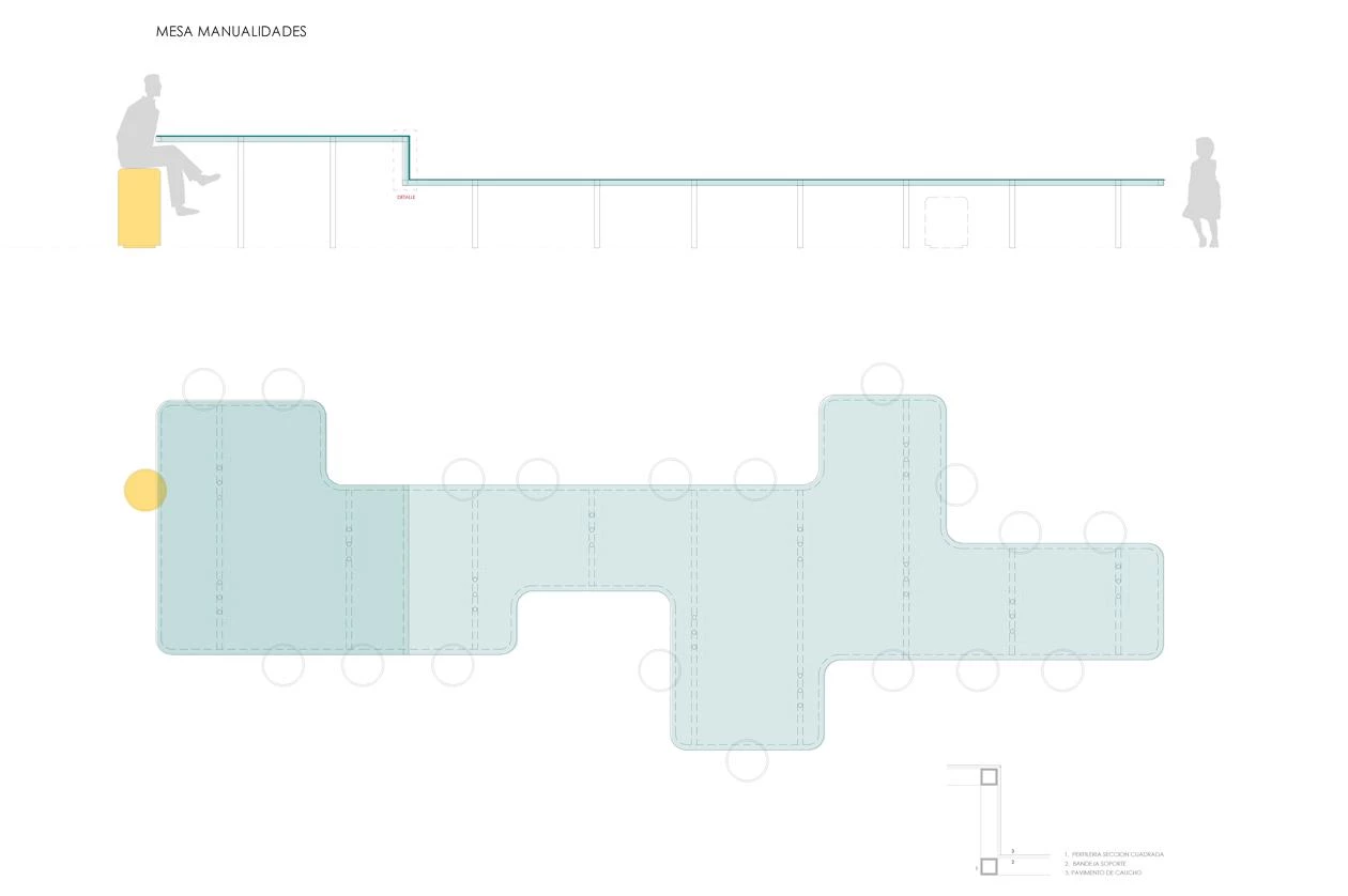 Two zones of different nature are distinguishable, depending on the street below. The noisier one is over O’Donnell, with a small performance stage, swings, slides, tricycles adapted for disabled children, a maze, and also a spot for teen-agers, with a ping-pong table and small football goal. The more tranquil place is elongated and features a large irregular table of two heights, a telescope, a table football set, a tangram, basketball baskets, and mini-golf course. A foyer with mirrors connects the two areas. A mesh encloses the whole facility.