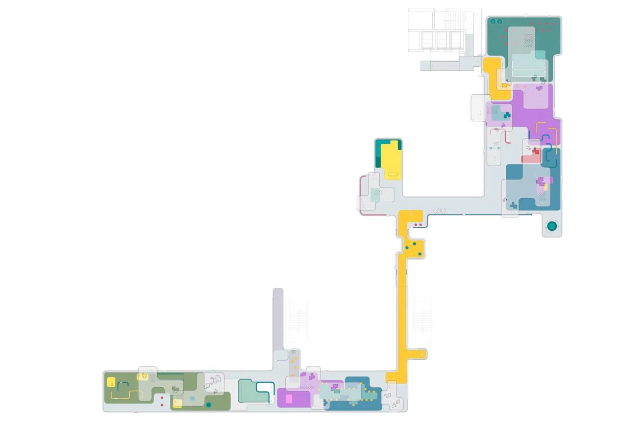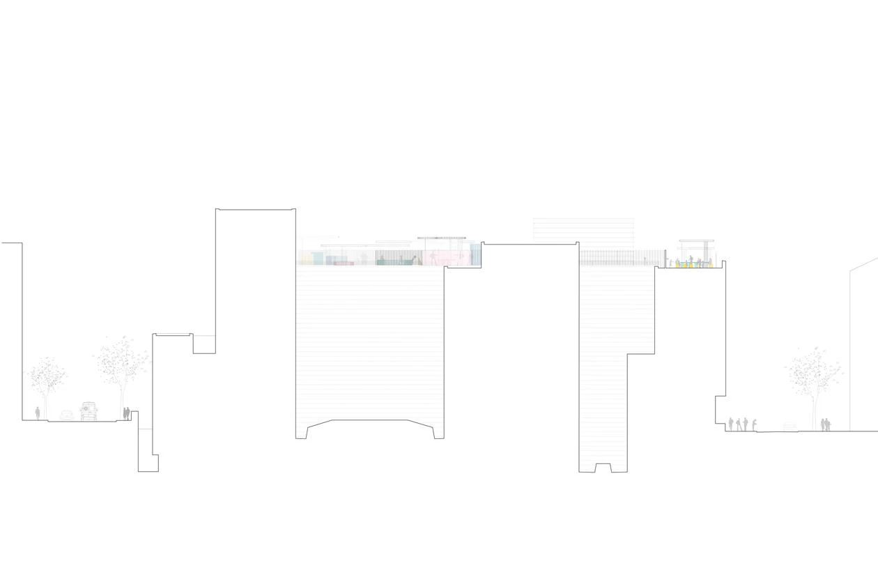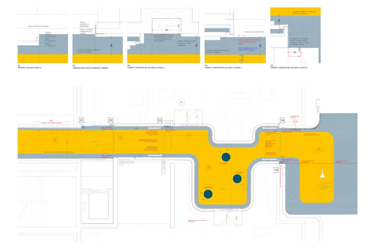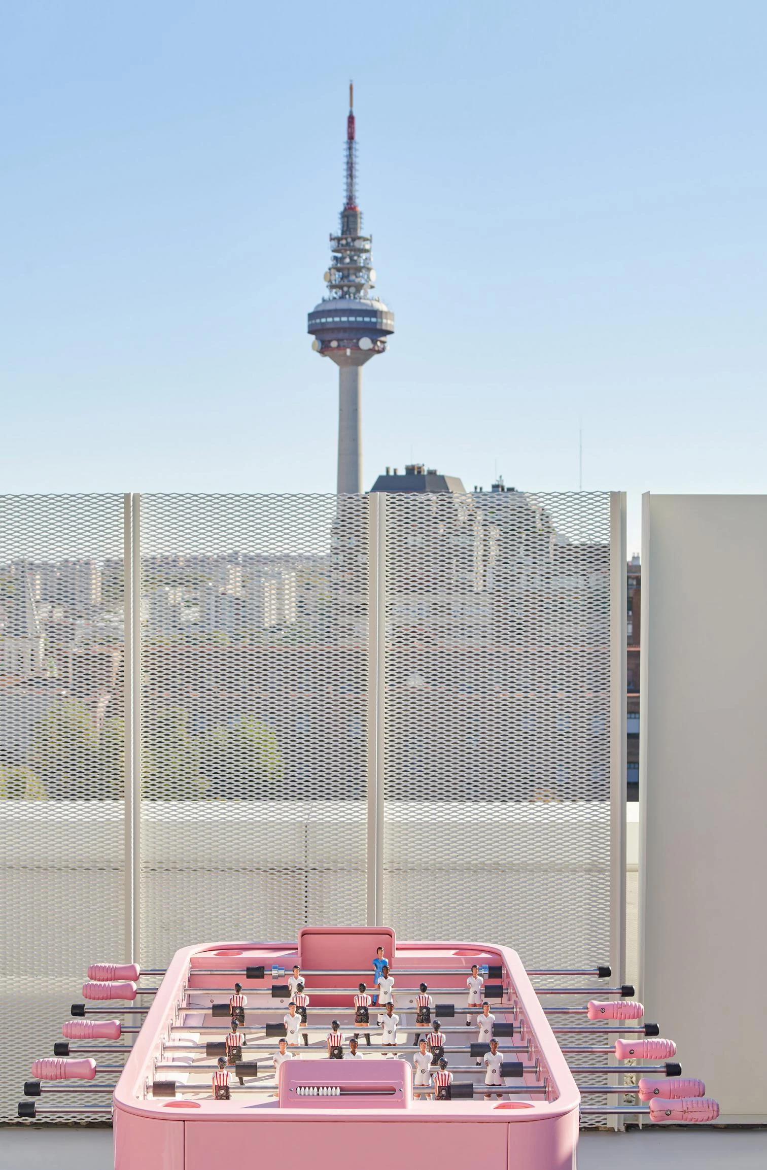Two zones of different nature are distinguishable, depending on the street below. The noisier one is over O’Donnell, with a small performance stage, swings, slides, tricycles adapted for disabled children, a maze, and also a spot for teen-agers, with a ping-pong table and small football goal. The more tranquil place is elongated and features a large irregular table of two heights, a telescope, a table football set, a tangram, basketball baskets, and mini-golf course. A foyer with mirrors connects the two areas. A mesh encloses the whole facility.