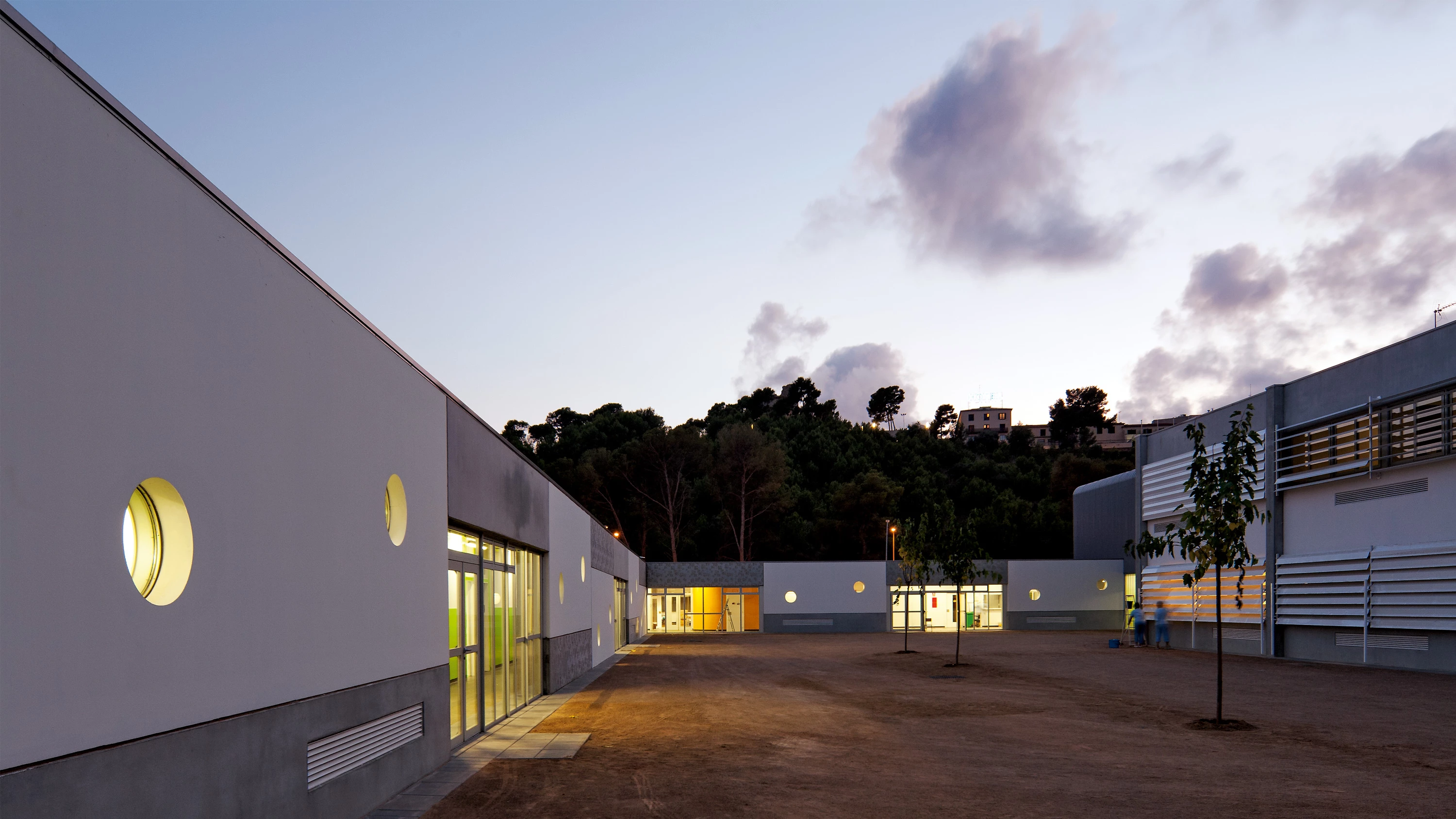 The characteristics of the lot – elongated and slightly sloping – determined the choice of building type for this school where there has been an endeavor to give priority to how the users are to relate with the exterior. The program is distributed in two volumes: one rising on the south end of the site and housing the preschool; the other on the north and addressing primary education needs. Between both wings is the core of the complex, containing the dining room and kitchen, administration zones and the main entrance. Completing the program are several exterior pieces: a sport gymnasium, classrooms, a playground courtyard and a porch graduating the transition between outside and inside.
