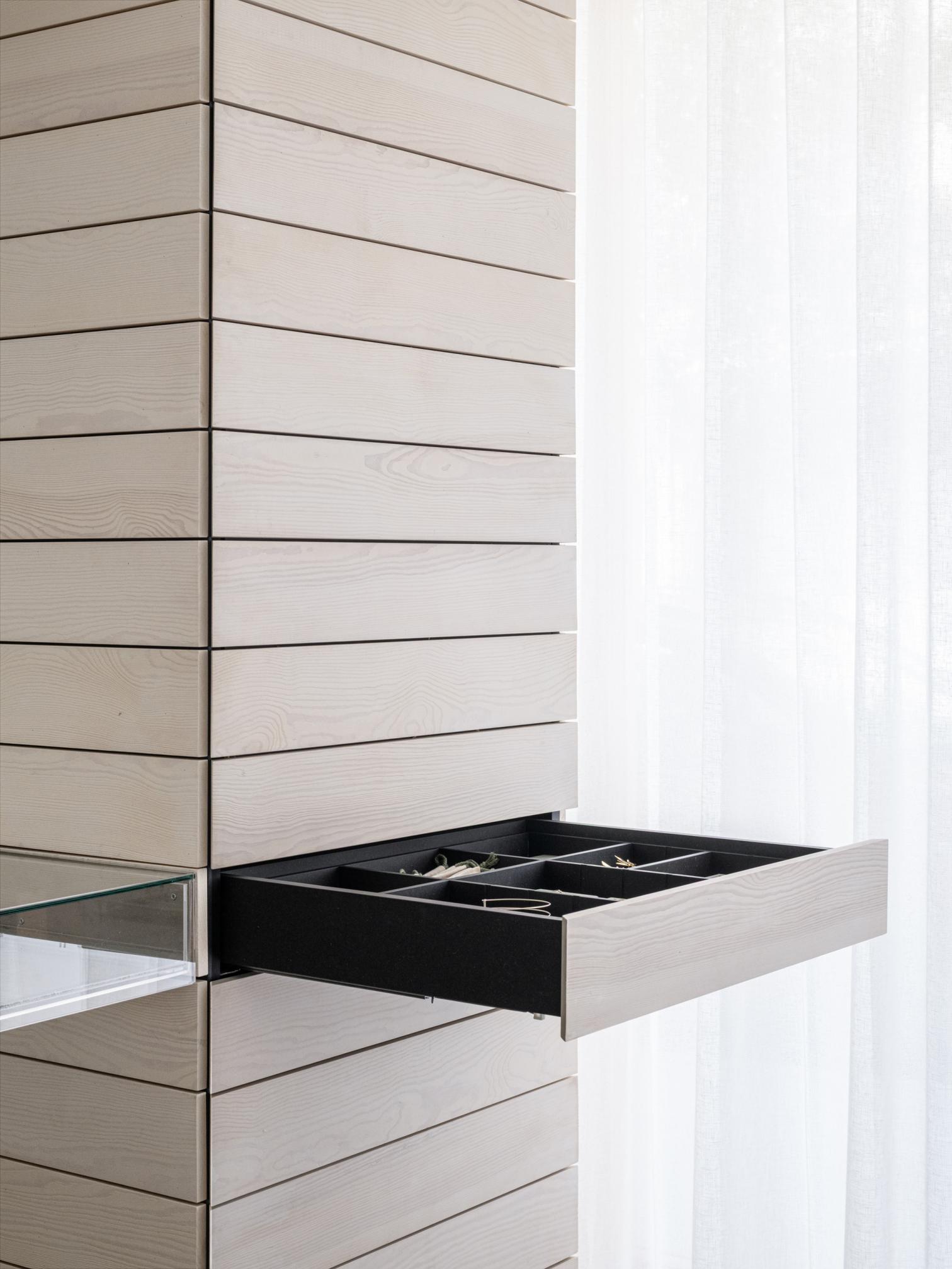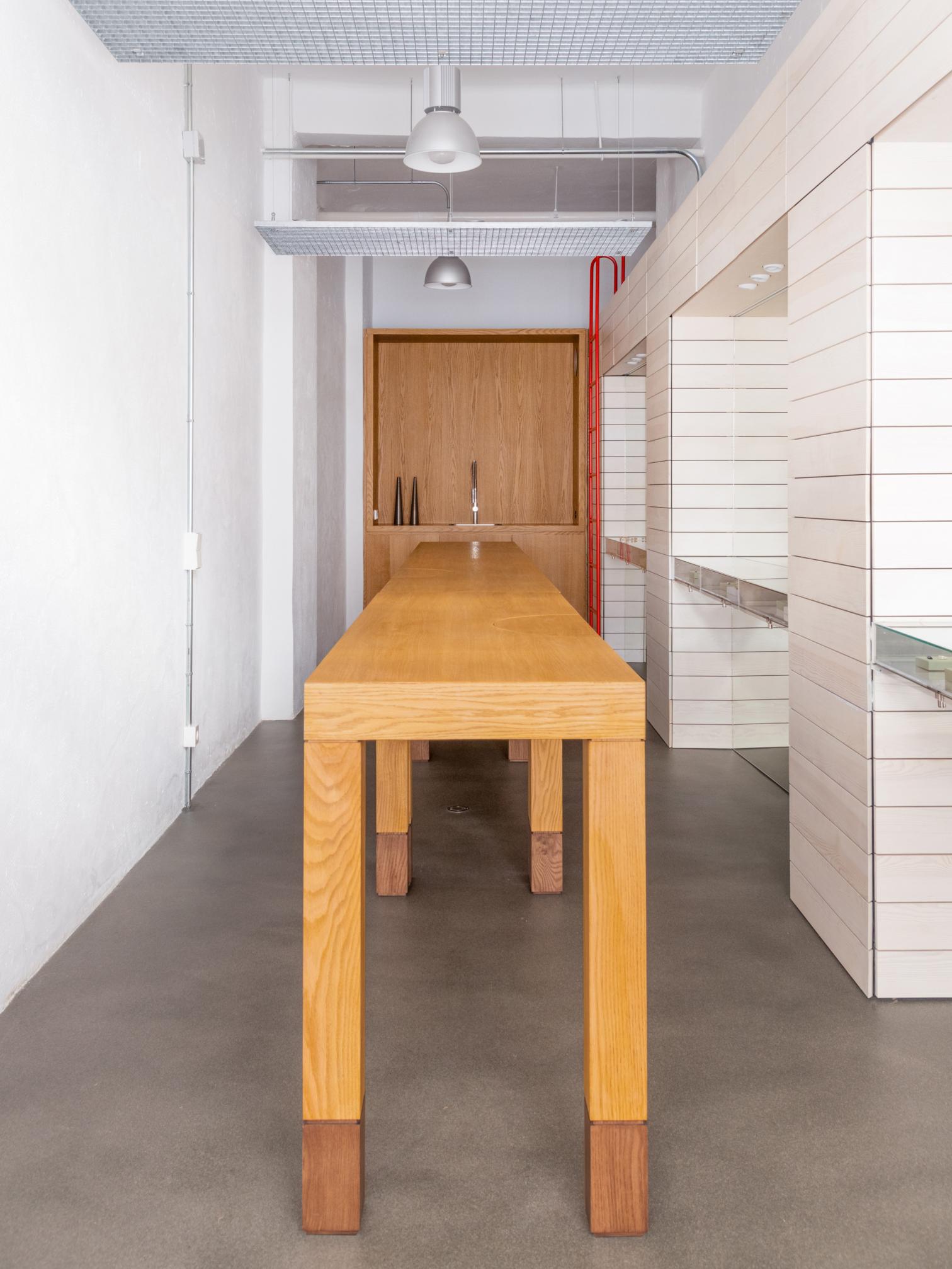 The scheme is trans-scalar: from jewel to object, object to furniture, furniture to space, and space to city. Everything is articulated through two elements which are essential to a jeweller: table and drawers. The carpentry and furniture, created in collaboration with Pedro & Alejandro, are based on a system of tables that can be transformed in surface area and height, reinterpreting the traditional jeweller's table and allowing integration of design, fabrication, and sale. At the same time, a continuous side unit provides storage in the form of hidden drawers and cabinets, and incorporates three mirrors that act as indoor ‘windows.’ This element corrects the irregularities of the premises and includes everything from a hidden bathroom to the air-conditioning system. Transparent display cases hang from each ‘window.’