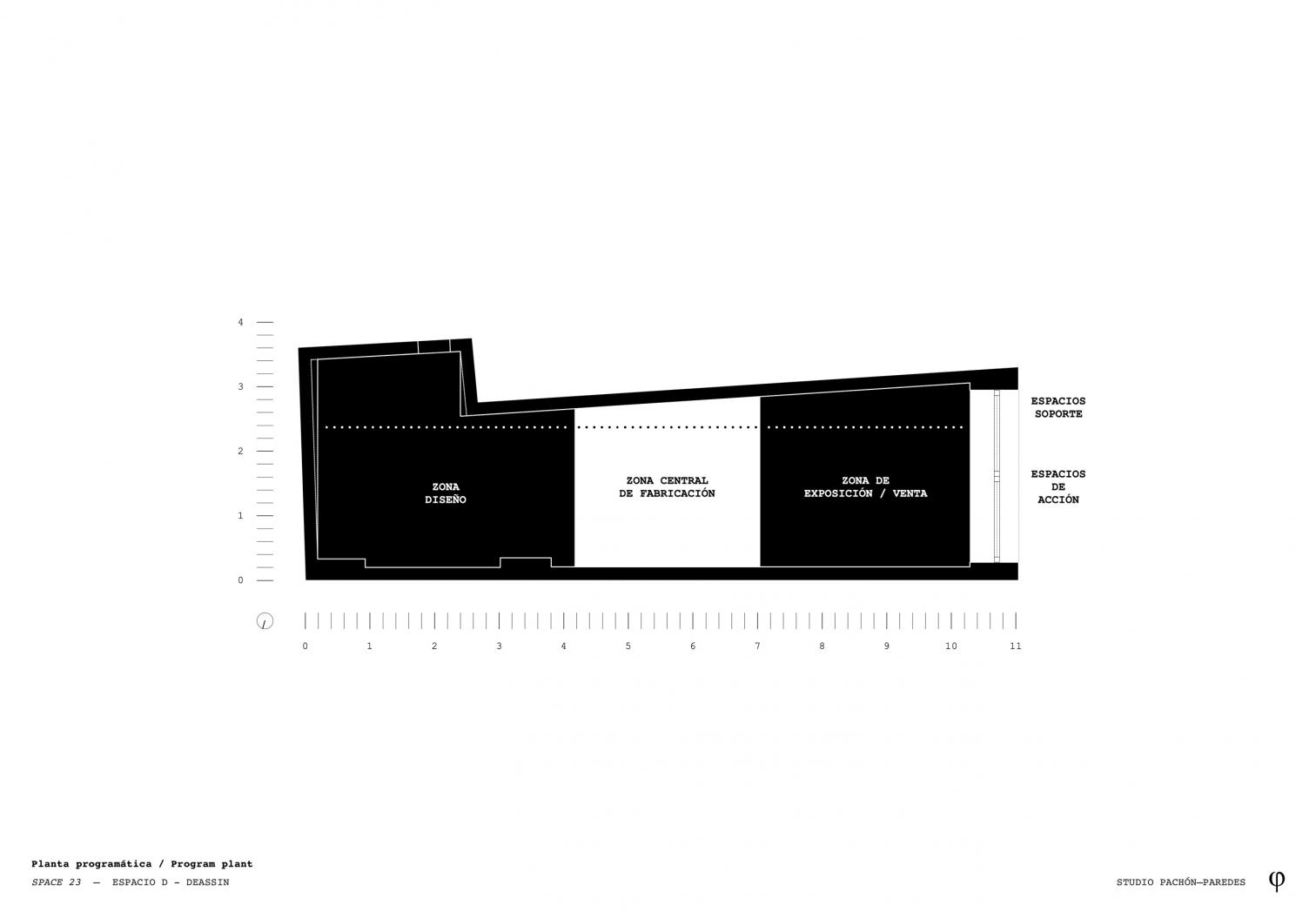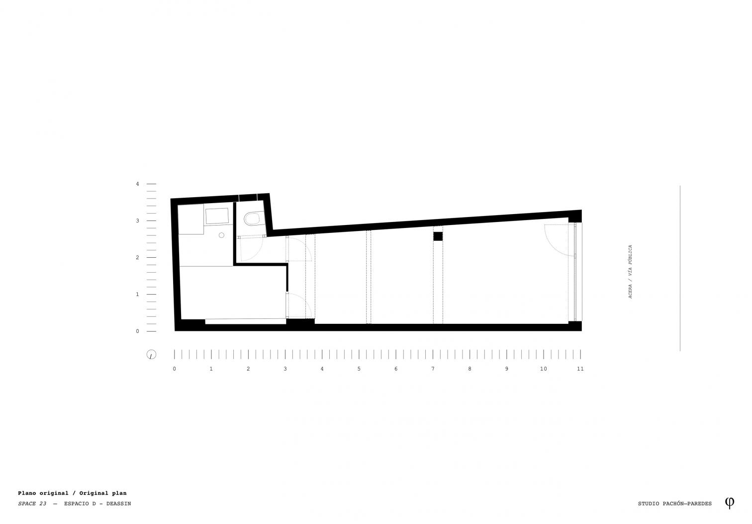 As part of the Non–Binary Space research of Pachón–Paredes, the premises that can be adapted to different phases of jewelry-making: design, fabrication, display, and sale, plus events. Narrow and elongated (10 × 2.16 m), the space opens up to 50% of its facade to the street and eliminates existing architectural barriers. The layout creates a gradient of privacy: the more public activities are next to the facade, and the most private ones are at the back.