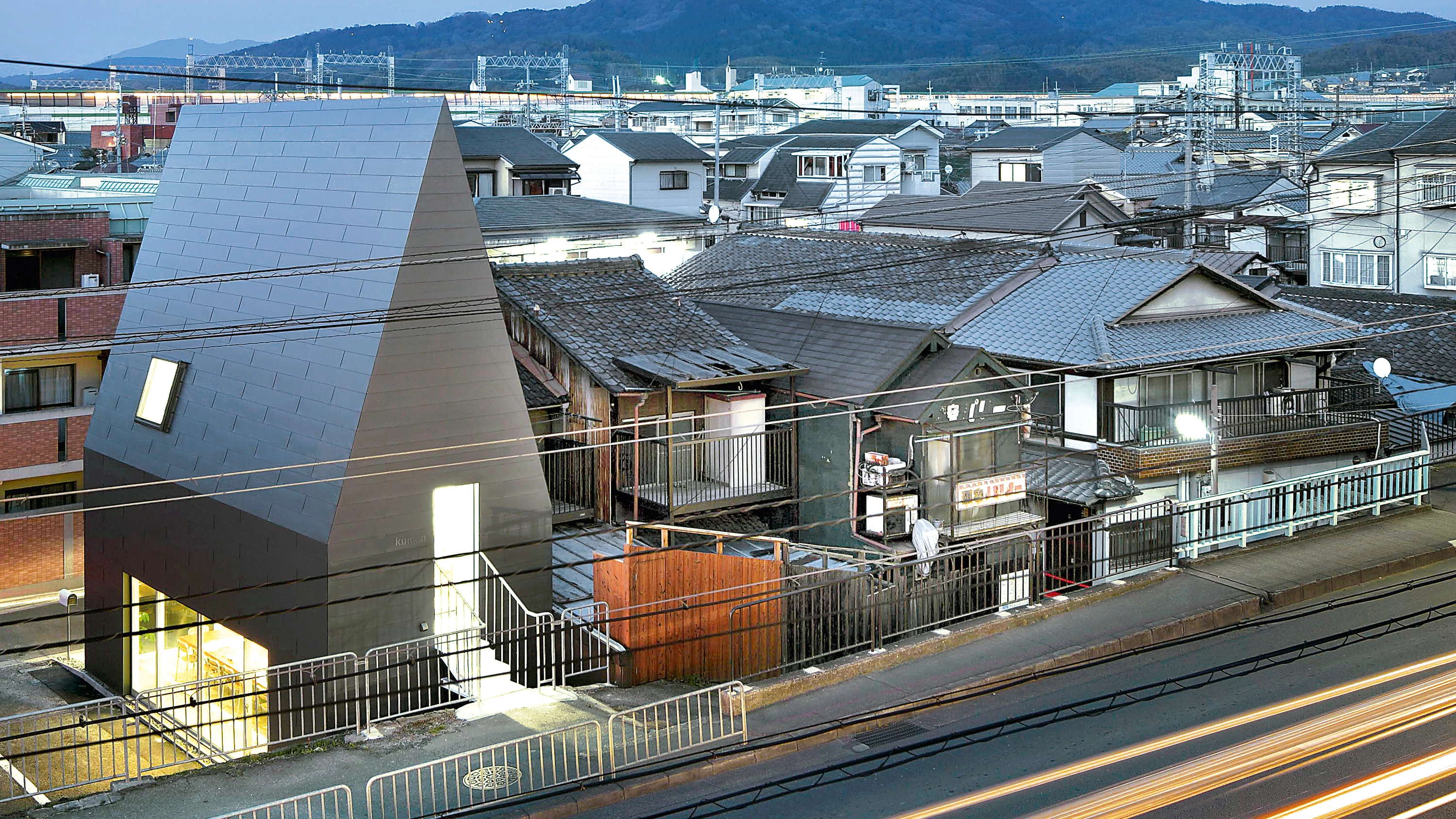 Repartidas por todo Japón, las escuelas Kumon renuncian tanto a adoptar una imagen corporativa como a recurrir a los típicos estilemas que se asocian a los edificios educativos. Asumiendo el principio de singularidad y de autoaprendizaje que define su peculiar método de enseñanza (creado en 1956 por el japonés Toru Kumon), los edificios del grupo se diseñan de manera específica, atendiendo a las características de su entorno y a los programas complementarios (viviendas, centros cívicos, gimnasios o restaurantes) con los que este tipo de escuelas suele relacionarse. Esta vinculación a lo local ha sido también relevante en el caso de la escuela Kumon del barrio de Fushimi, situada en la ciudad de Kioto, la antigua capital japonesa.