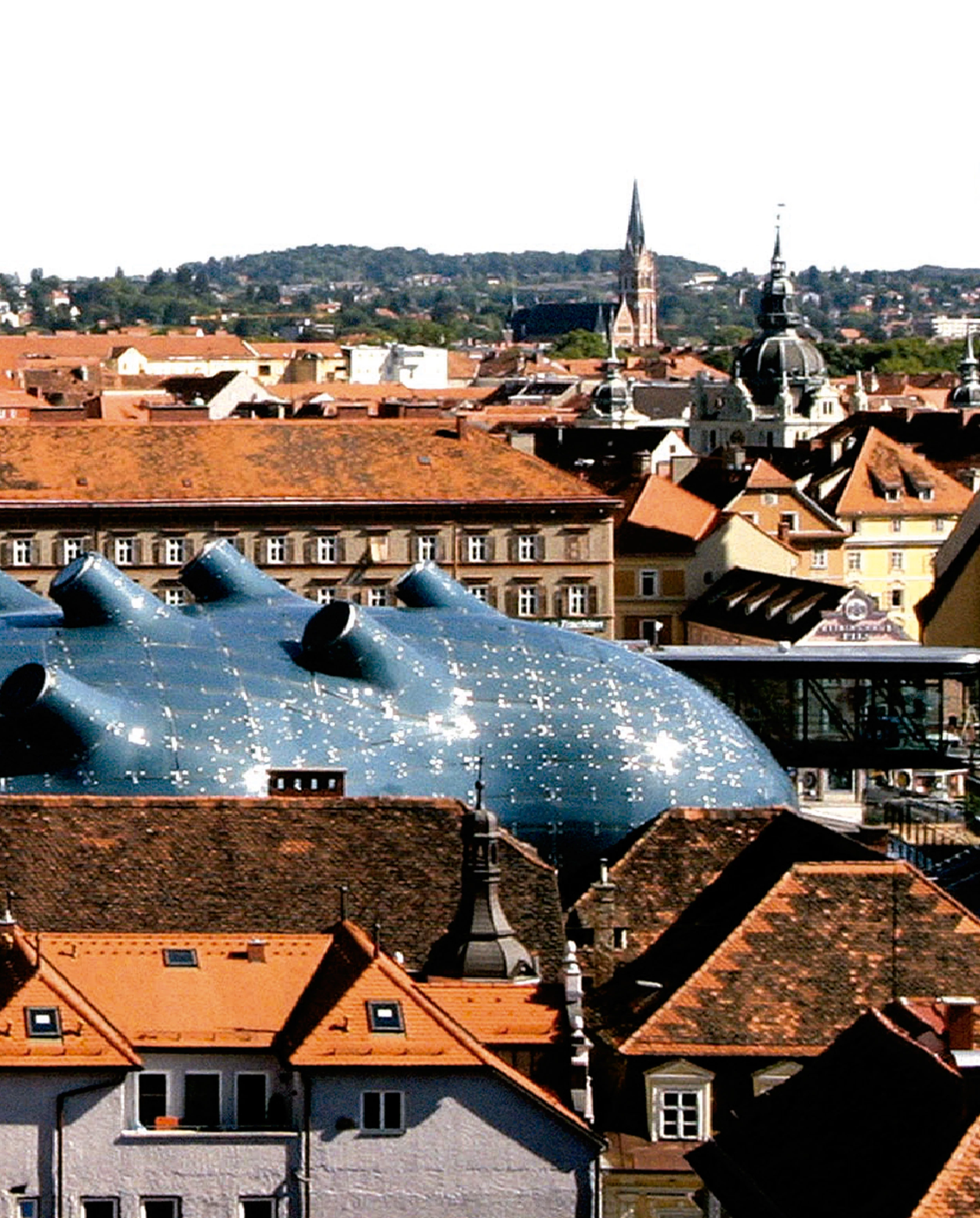 For centuries, the quarter of Murvorstadt remained in the shadow of the historic center of Graz, located on the opposite shore of the River Mur. The bridge joining both banks and most of the buildings around it were ruined in the floods of 1827, urging to initiate a process of urban refurbishment which included the construction of a modern bridge and the adoption of new security measures. After the disaster, the desire to revitalize the neighborhood led to the construction of an innovative and multipurpose commercial building, meant to become a meeting place, known as the Eisernes Haus (Iron House). The avant-garde technology of this building – it was the first cast-iron construction in Europe – reflected an optimistic view of the future. Aside from being a technological object imported from England, and aside from its lightness and transparency, the new Kunsthaus shares, two centuries later, the very same objectives as the Eisernes Haus, which it adjoins.