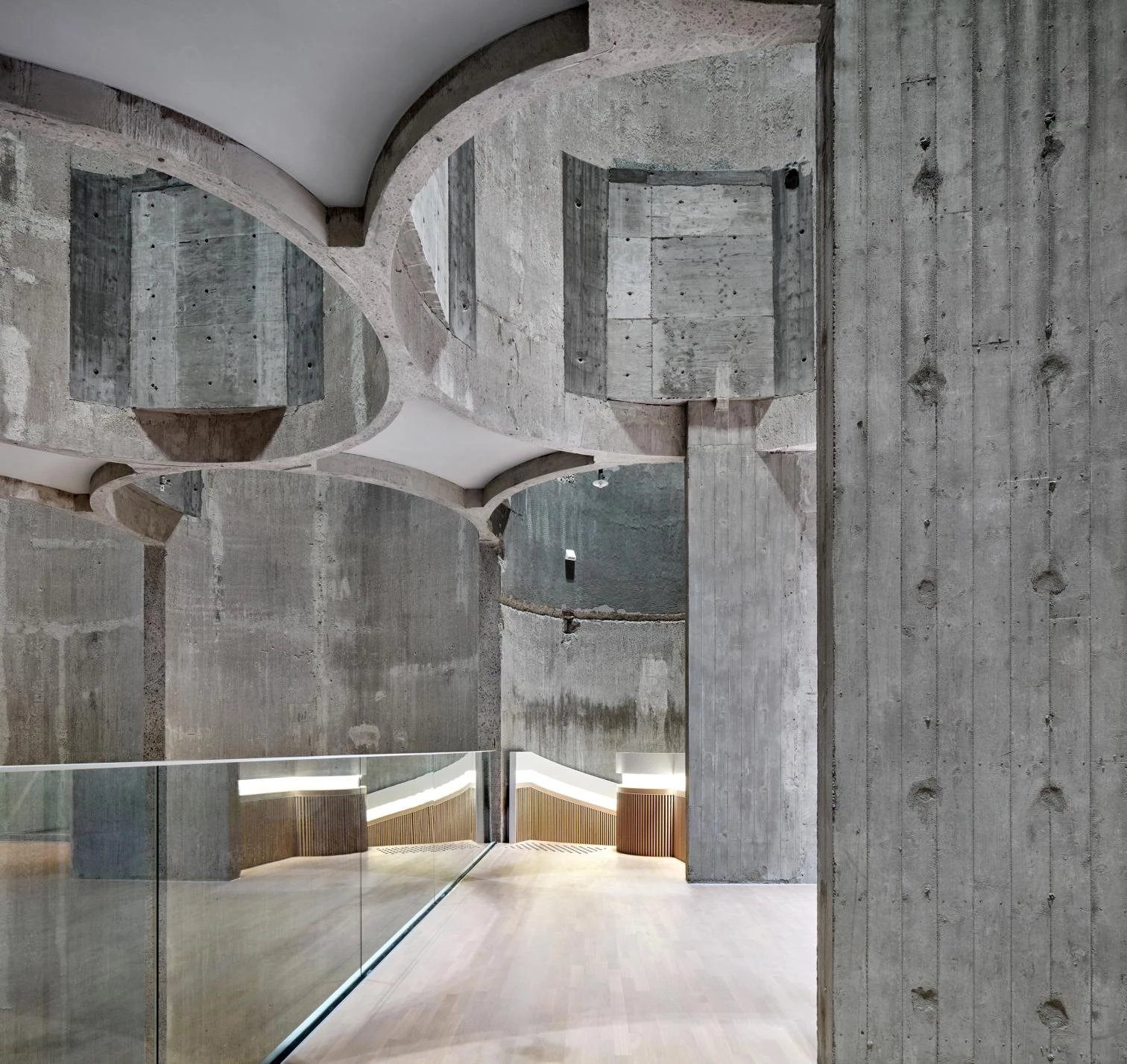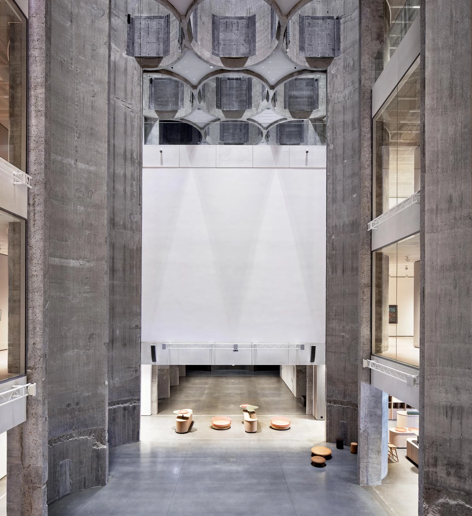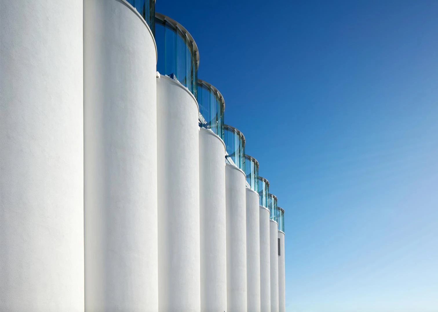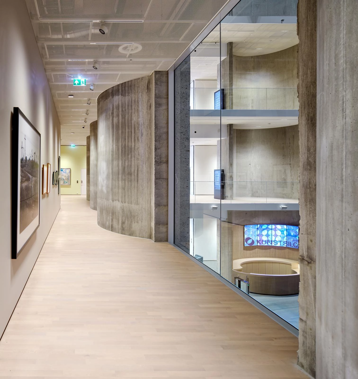 The exhibition galleries surround it, most of them taking up two adjoining extensions, one of which is a replica of an original volume, reconstructed because it was so deteriorated. The white exterior was restored and matched with the facades of the replaced volume. The addition on the east side of the Kunstsilo is clad in aluminum with a corrugated finish. The rooftop terraces are protected by glass cylinders aligned with the undulating exterior of the silos underneath, in continuity with them.