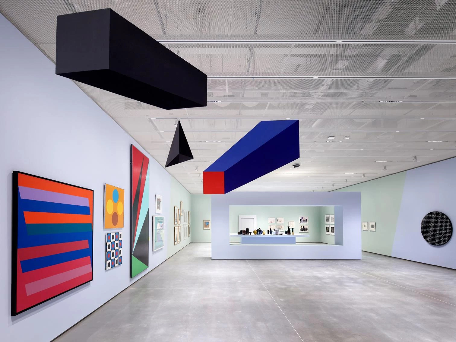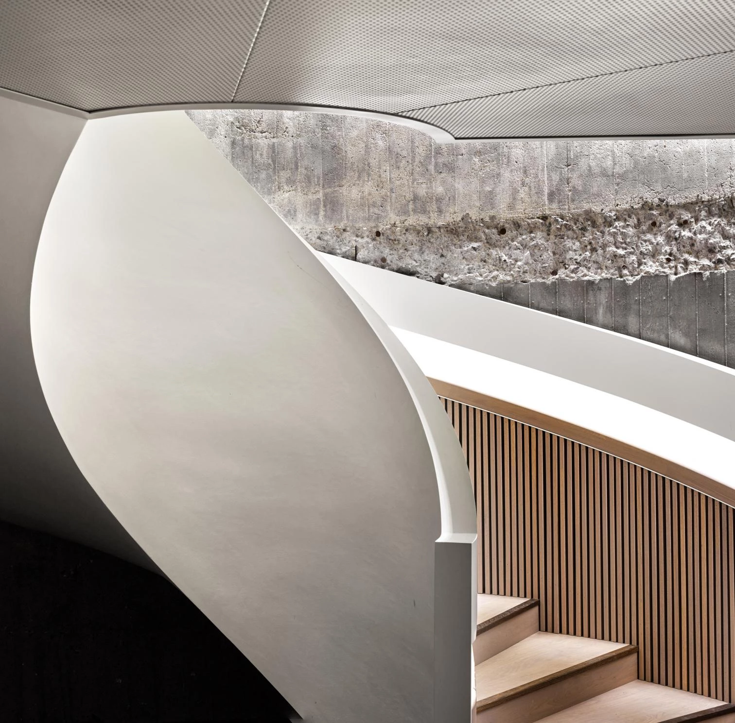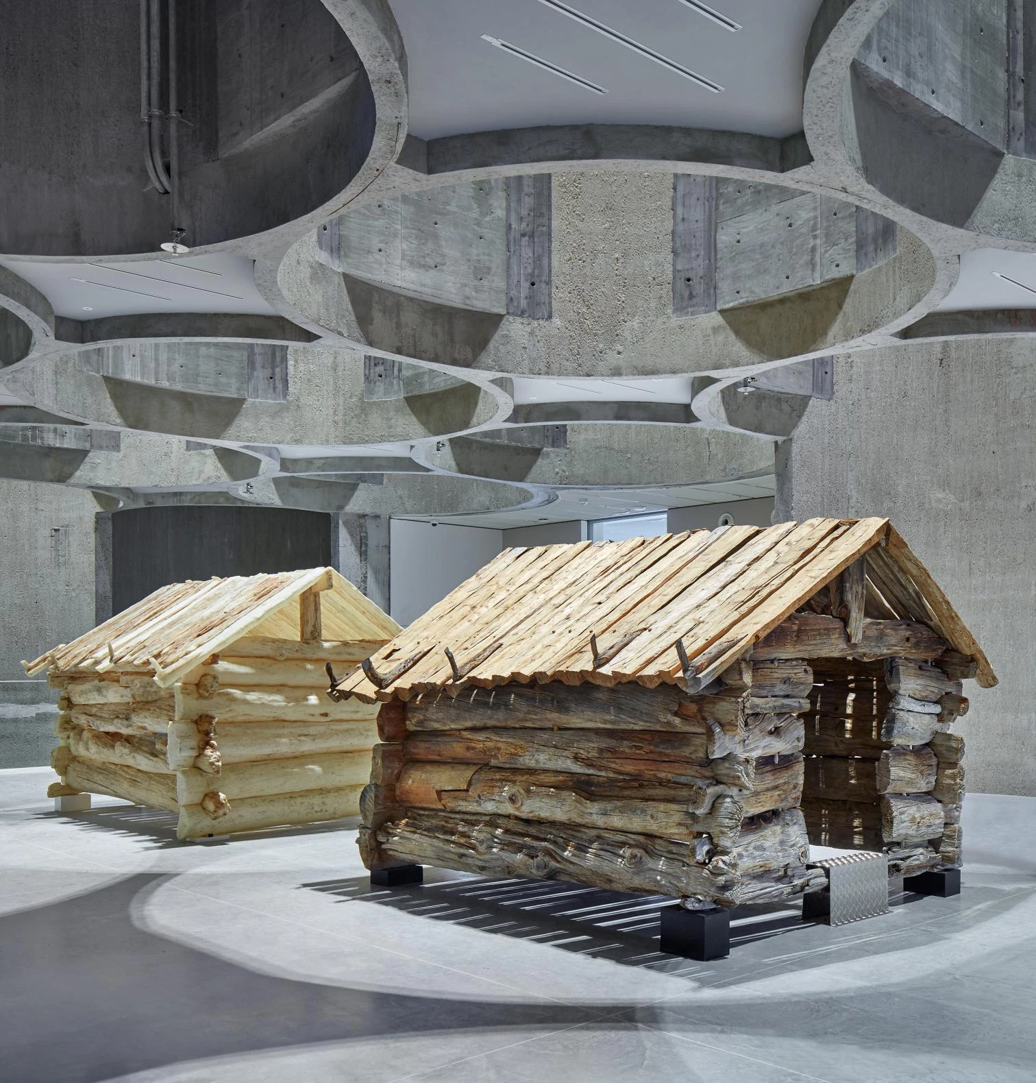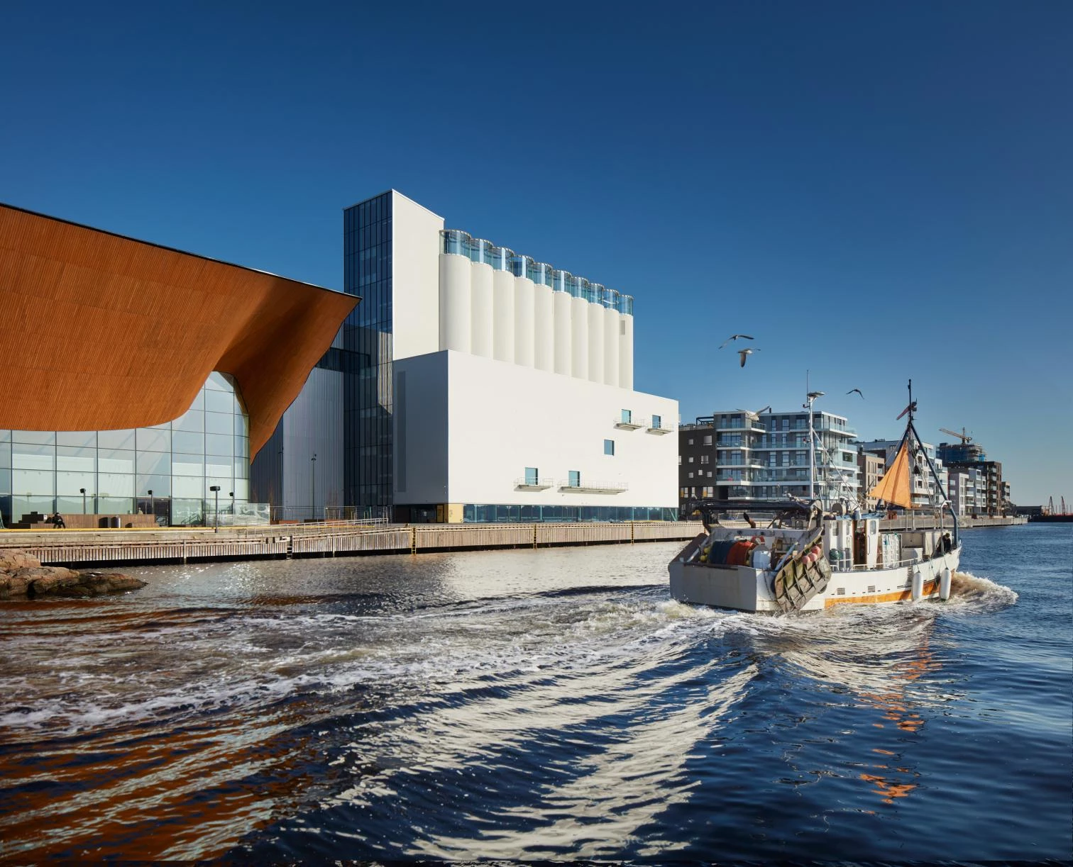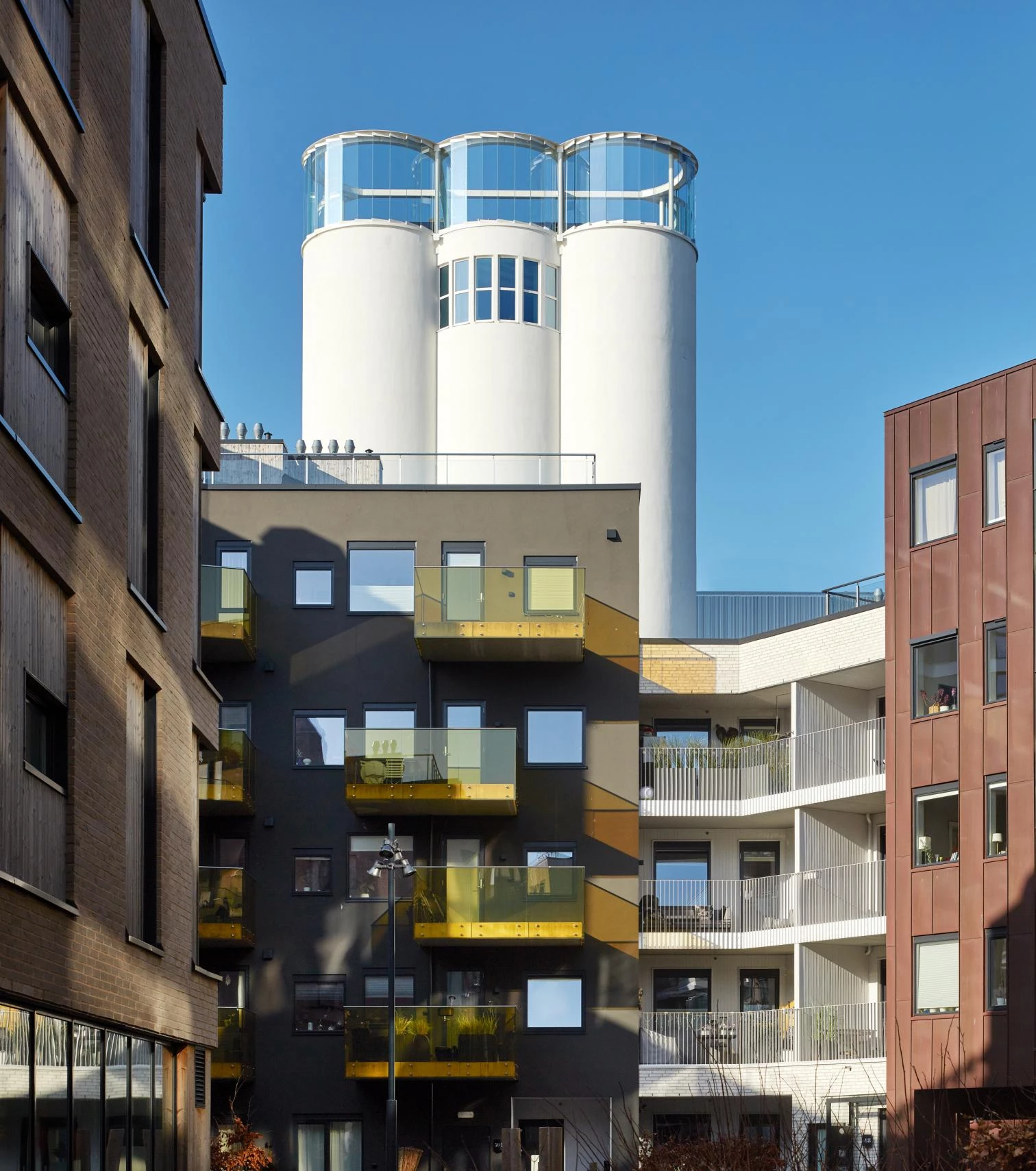 The exhibition galleries surround it, most of them taking up two adjoining extensions, one of which is a replica of an original volume, reconstructed because it was so deteriorated. The white exterior was restored and matched with the facades of the replaced volume. The addition on the east side of the Kunstsilo is clad in aluminum with a corrugated finish. The rooftop terraces are protected by glass cylinders aligned with the undulating exterior of the silos underneath, in continuity with them.