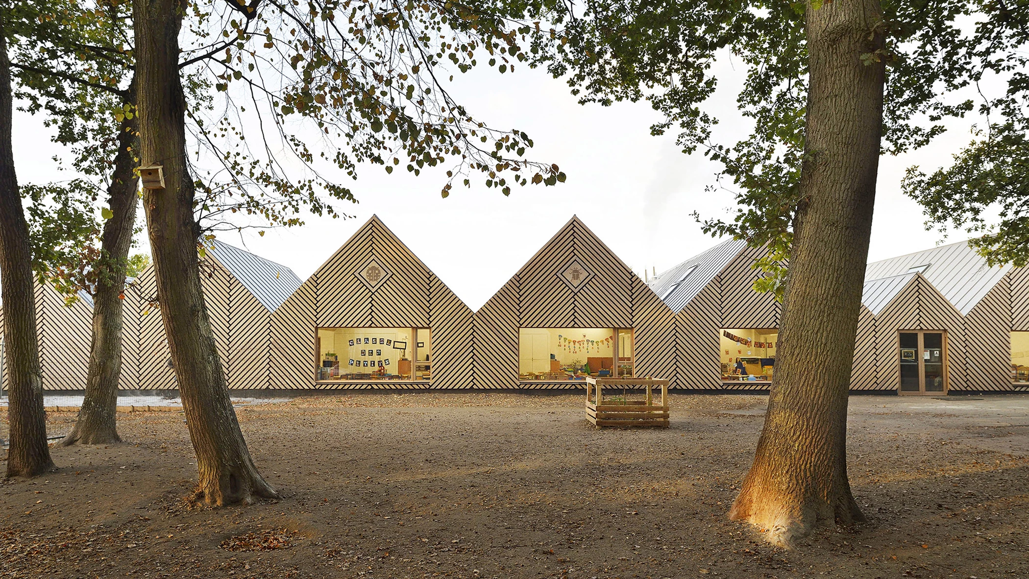 The Paris firm Tracks Architectes, headed by Moïse Boucherie y Jérémy Griffon, designed this kindergarten as an orderly succession of timber constructions with gabled forms, reinterpreting the simple geometry of local architecture in Perthes-en-Gatinais, a village in the Ìle-de-France region. Named La Ruche (the beehive), the preschool presents volumes varying in height and width to adapt to internal requirements, including open structures with translucent roofs like the one giving out onto the playground. The wooden boards – inclined and vertical – liven up the rhythm of fronts and sides, respectively. The building is in an area that is part of the Gatinais Regional Natural Park, so the windows optimize views and the entrance of natural light.