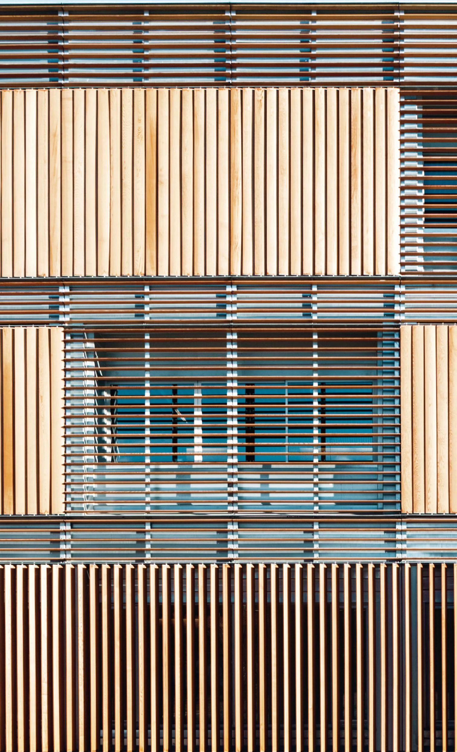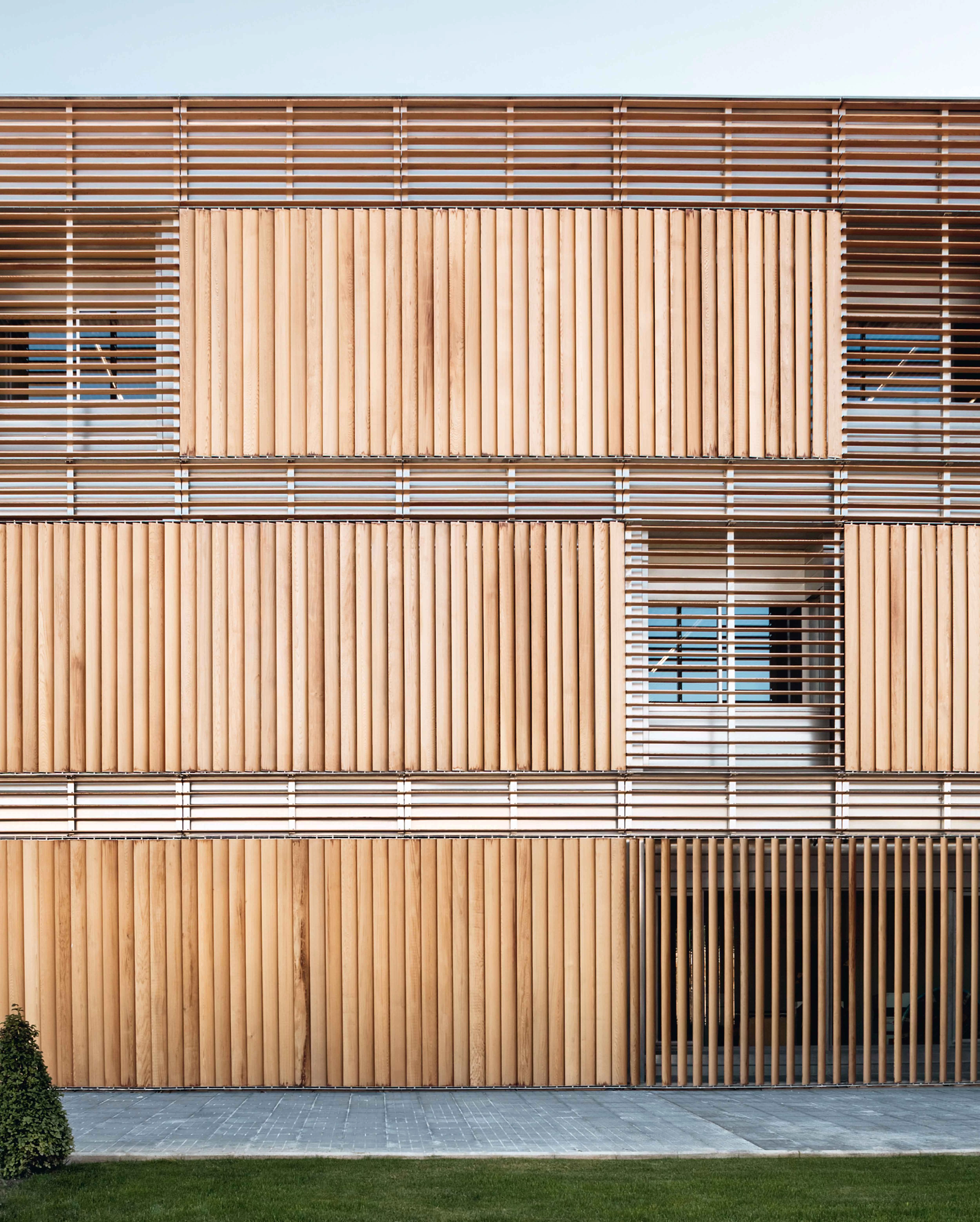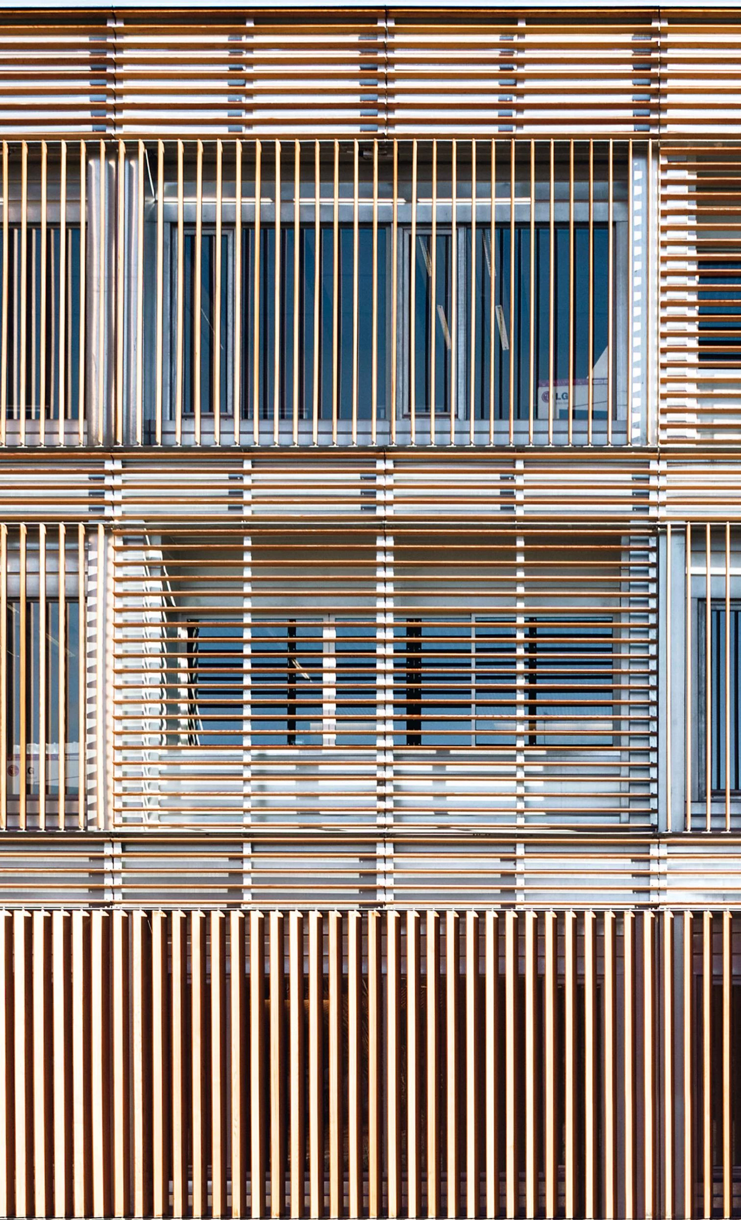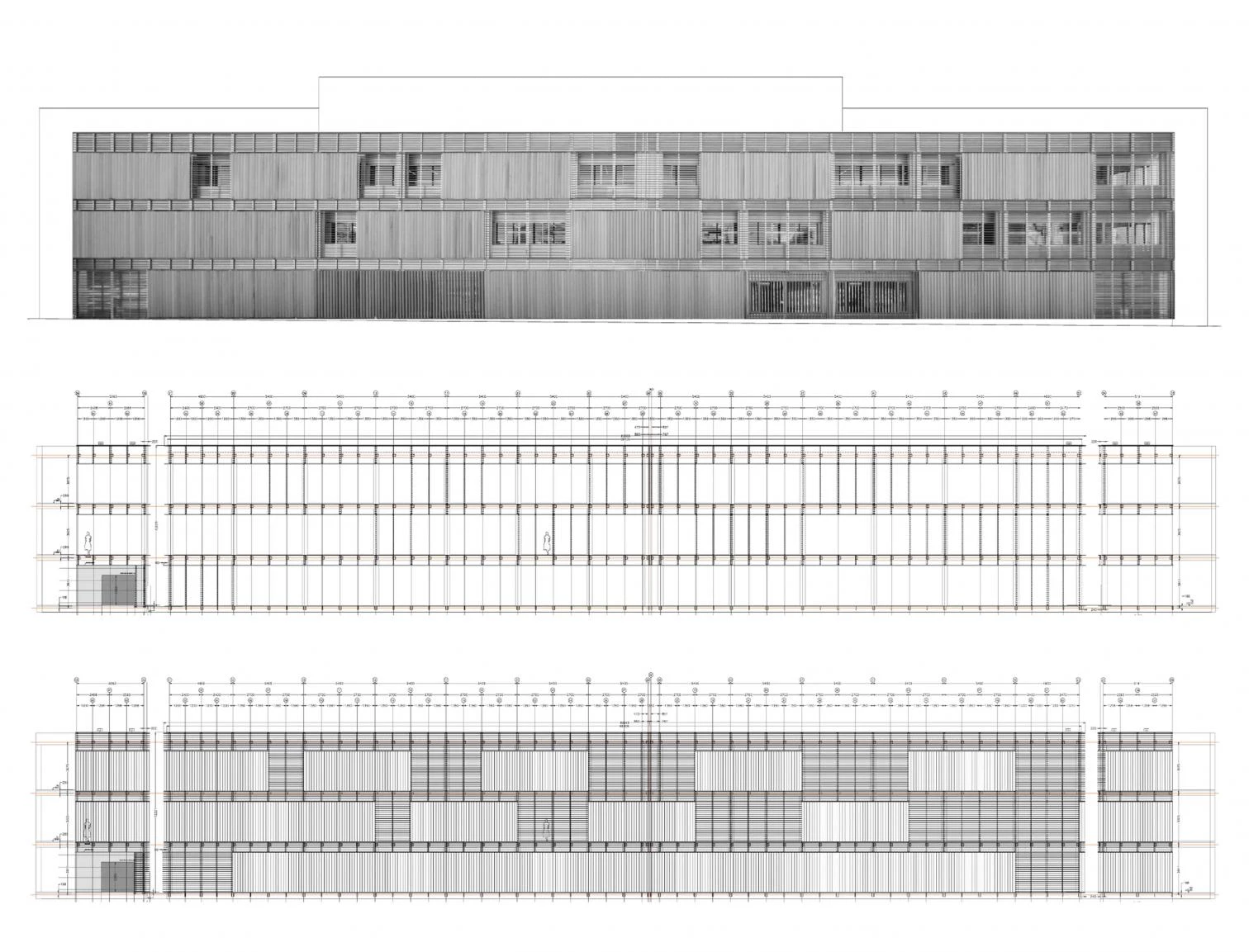 The east block is devised as a hermetic volume that houses the service spaces and the vertical communications. The windows are freely distributed, with the optimum size for each space, behind a veil of microperforated galvanized steel sheet. Like a piece of fabric that sways with the wind, the metallic membrane moves rhythmically, generating a geometry that, when traversed by light, generates a broad spectrum of reflections and textures with nuances that change throughout the day. Furthermore, the western block houses the main teaching spaces and their facade echoes their distribution. A framework of Western Red Cedar modulates the light in the different rooms, alternating operable slats in the classrooms and horizontal latticeworks in the communal spaces.