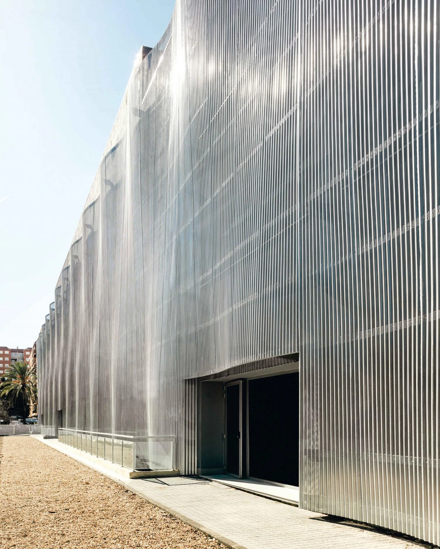 The west facade is closed with a modular system that alternates stretches with orientable vertical louvers and others with fixed horizontal slats, generating a varied rhythm that reflects the activity inside the center.