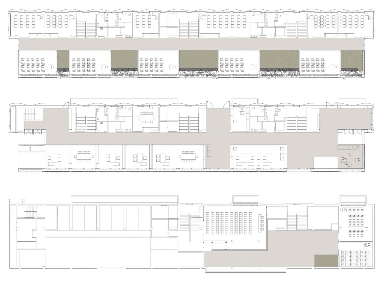 The program is not limited to the basic learning of a language, and the school is devised as a place for the exchange of experiences. For this reason, the building is fluffed out reserving spaces between the classrooms with a small garden that controls temperature and filters light, creating an atmosphere that favors informal conversations. Furthermore, because it is a modular system, these intermediate spaces can be transformed into classrooms that are totally conditioned with a minimum intervention that replaces the facade panels. In the basement there are three important pieces in the program, the assembly room and two multipurpose halls, chained by a hall that is illuminated with an English courtyard.