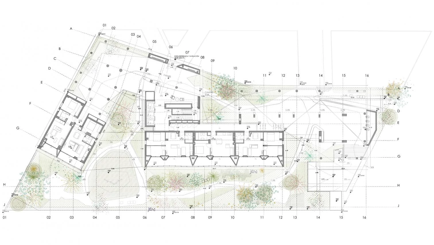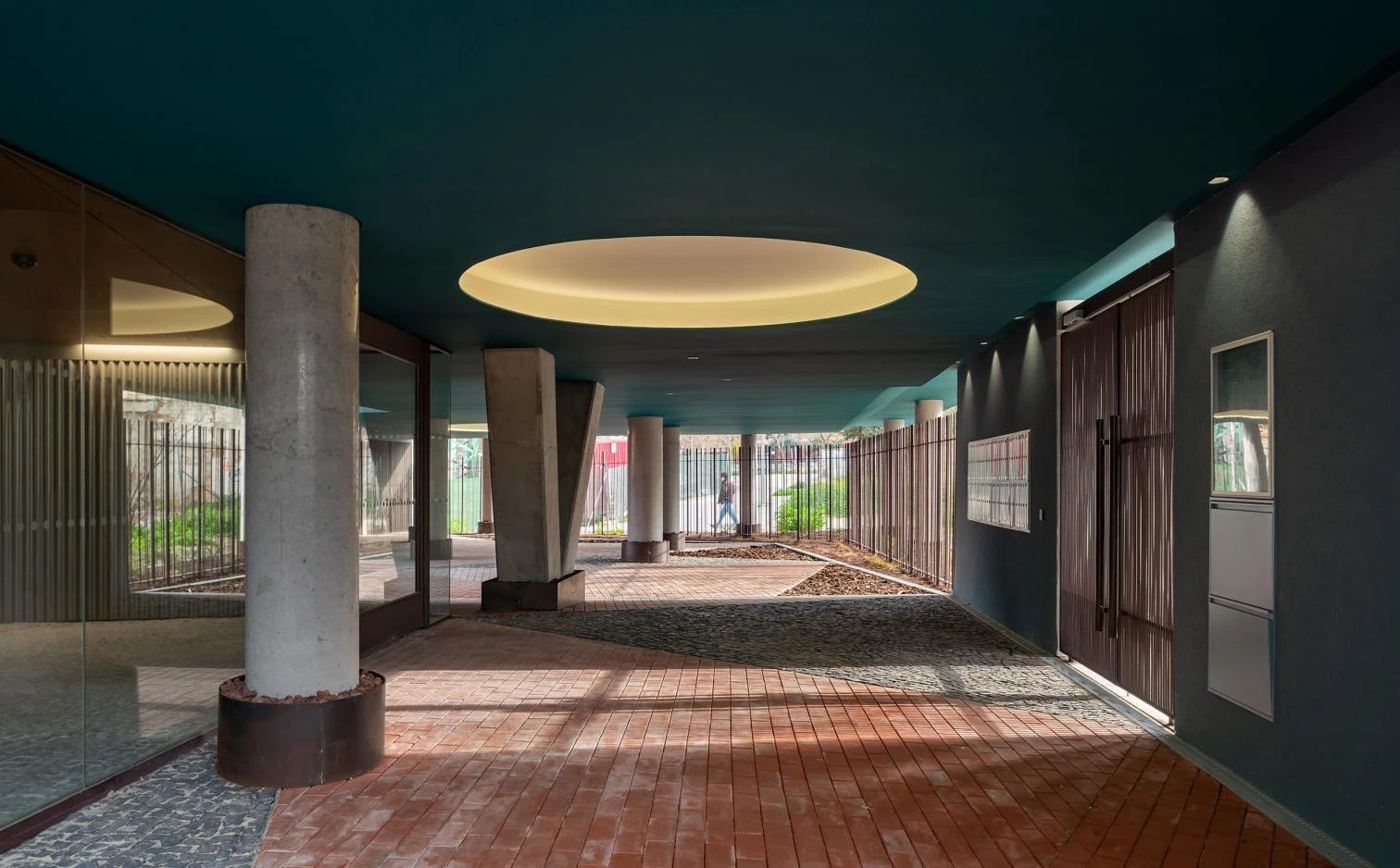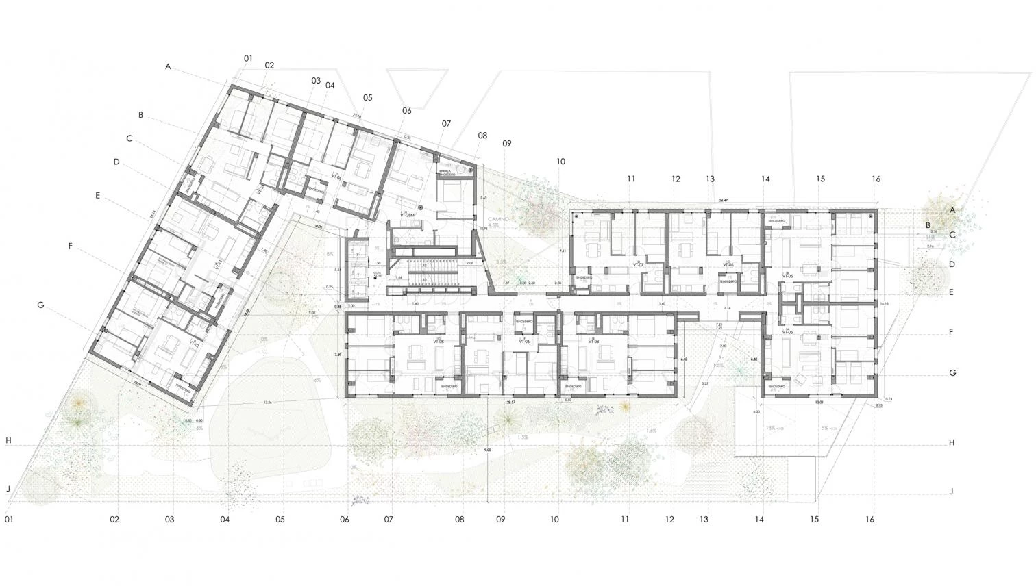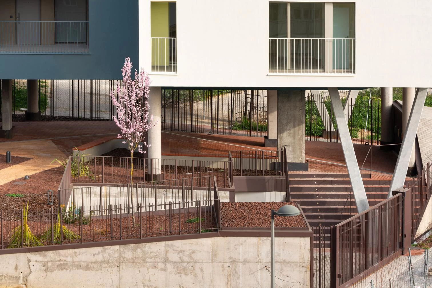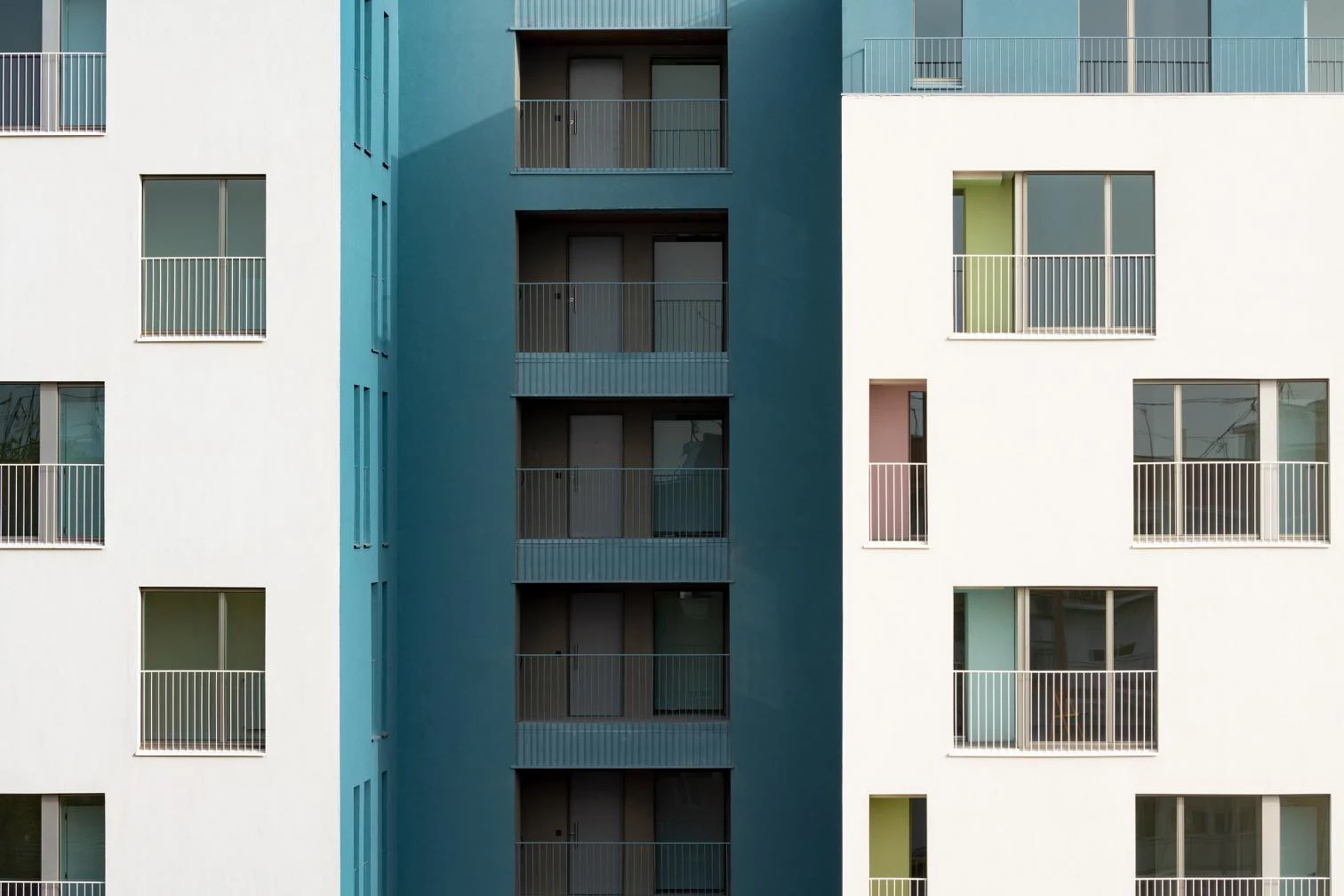 The building has a single vertical circulation core, with two interweaving staircases, and the dwellings enjoy cross ventilation or are corner units facing an open court. Energy effiiciency is guaranteed through passive strategies, such as a carefully conceived continuous thermal envelope on the exterior, with a SATE facade and aluminum joineries with a thermal bridge break and roller shutter drawers.