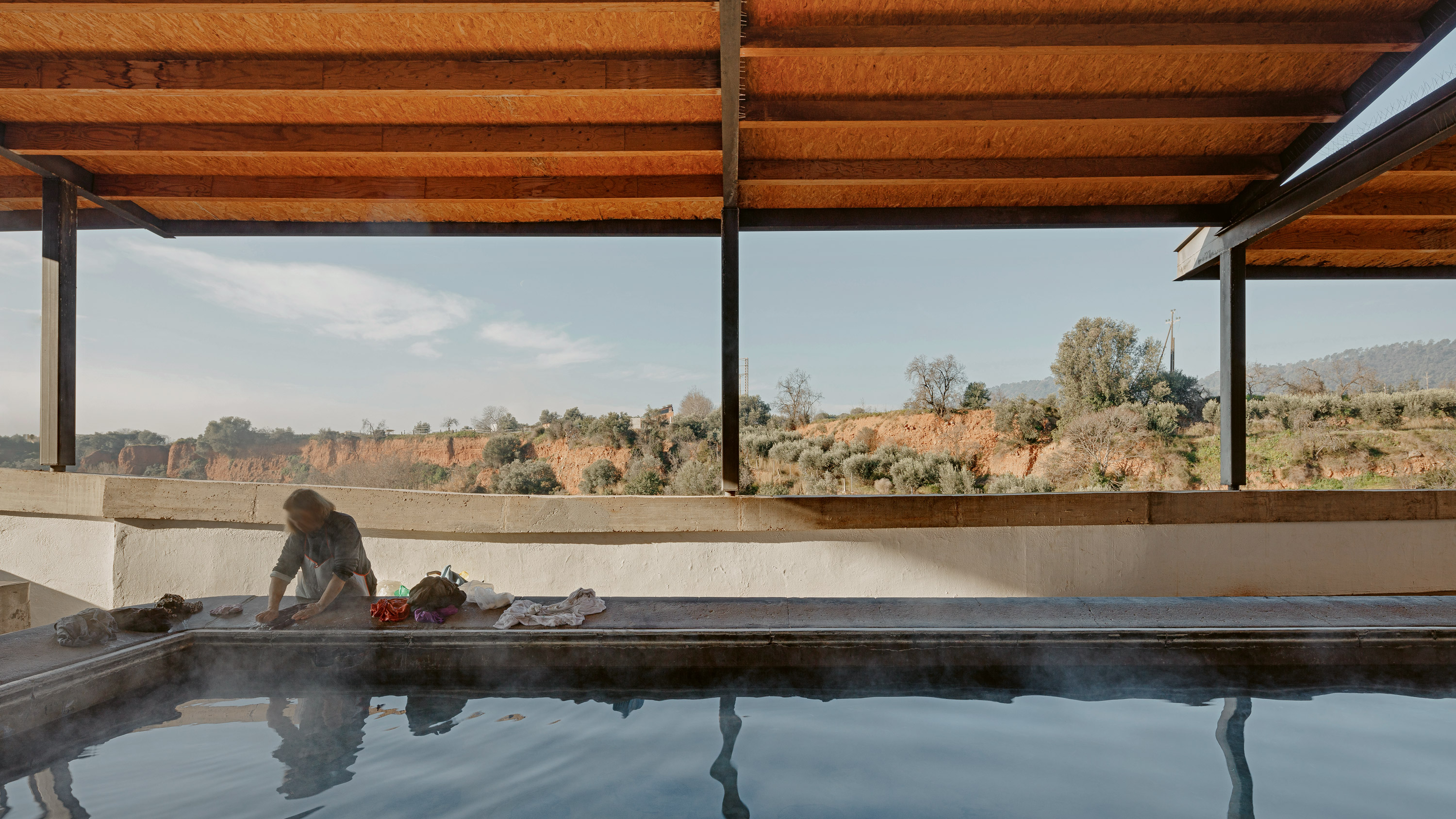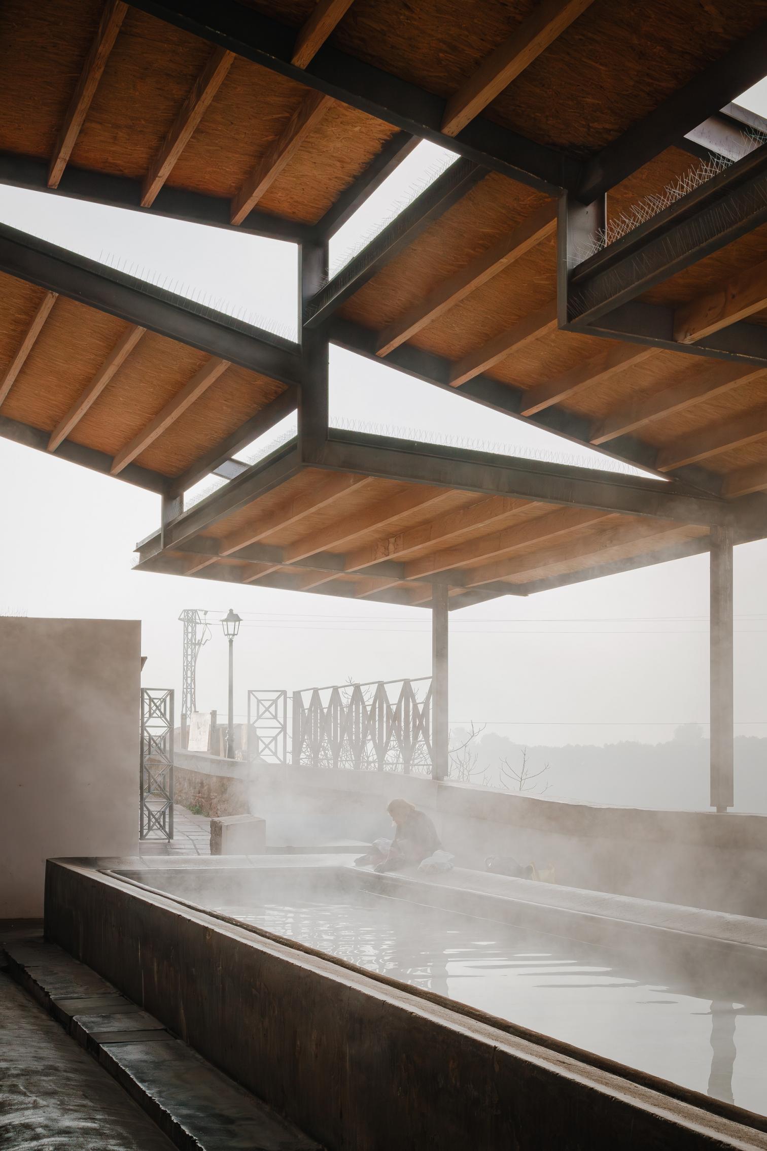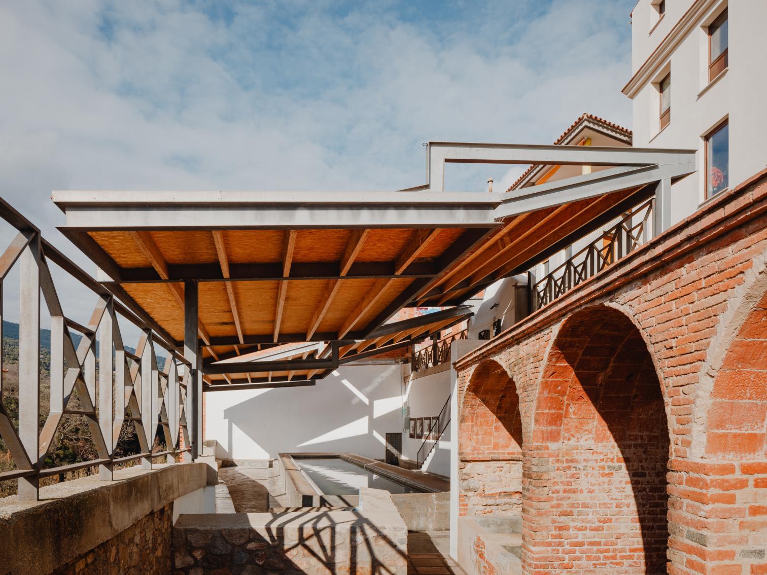 Just like its name, hot springs mark the history of Caldes de Montbui. Receiving water from an almost eighty-degree underground stream, the Barcelona town preserves remnants of Roman baths, a 16th-century fountain, and two still-operating lavoirs, of six that existed. One, located along a riverbank on the edge of the old town, is revitalized in a way that respects original elements, from the gate or benches to the washbasin and the scrubbing surfaces, which are protected by a new roof of tile-covered wood that is stepped in order to adapt to the site’s inclination, as well as to create gaps for light to shine through and to prevent steam from accumulating, making the laundering task more agreeable.