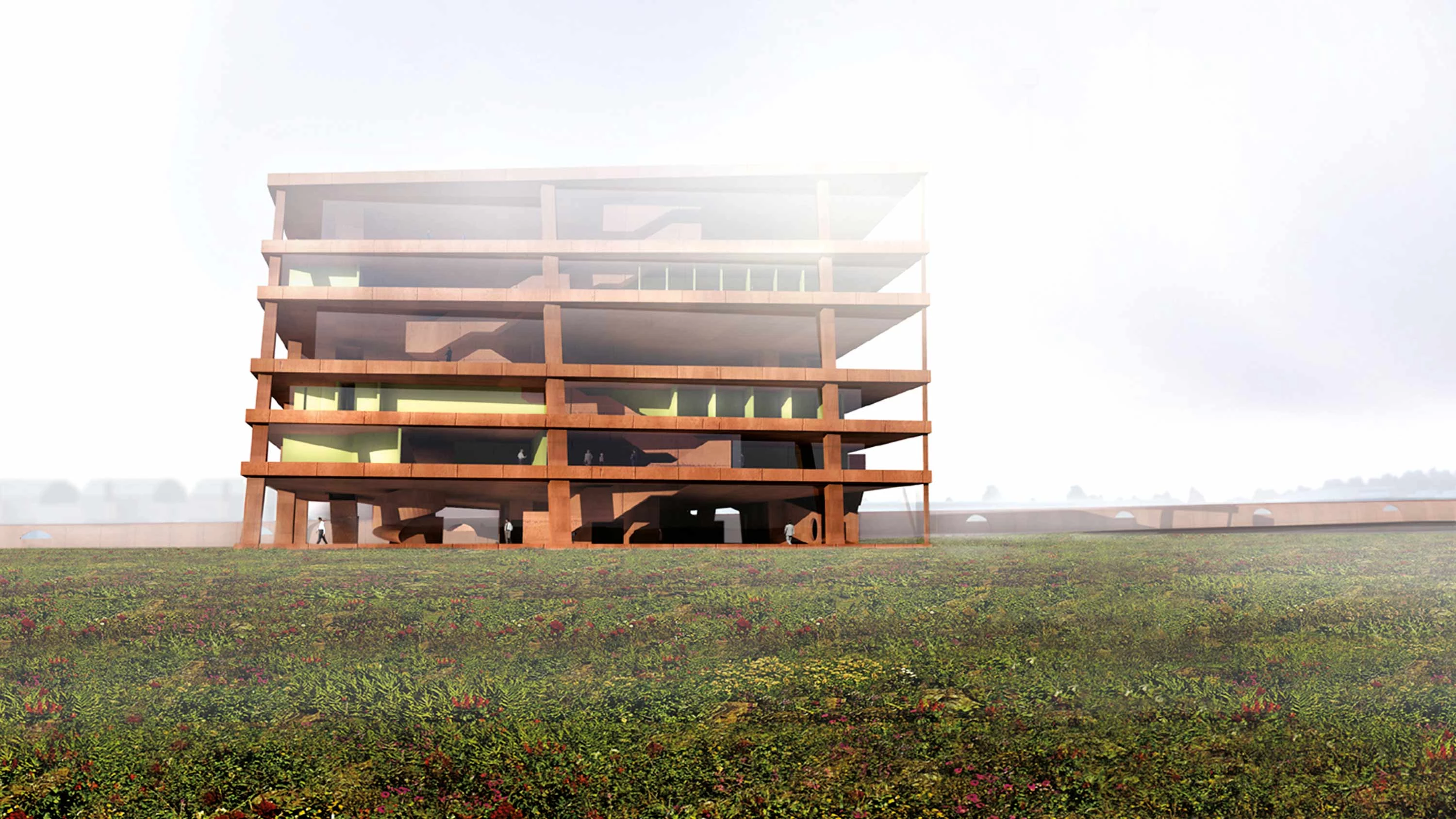 Una rampa para uso peatonal de veinticuatro metros de ancho y con una pendiente del 2,5% reorganiza todo el campus en torno al eje norte-sur, y da acceso al nuevo edificio, un volumen compacto, de forma irregular y en apariencia arbitraria, cuya potente estructura de hormigón de color marrón rojizo, permite la máxima flexibilidad en la organización espacial de las plantas... [+]