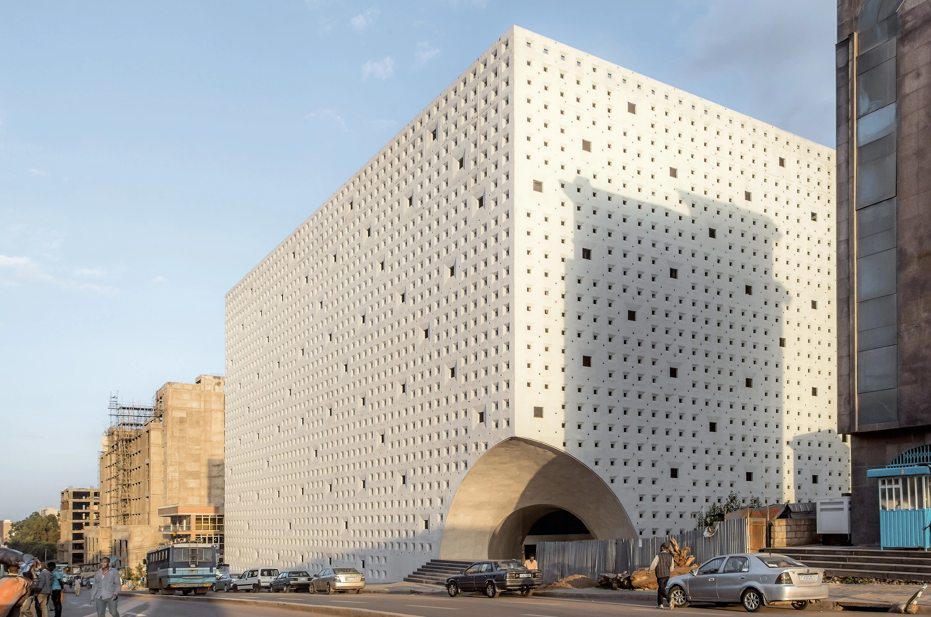 Externally the building is clad in a prefabricated system of light concrete pieces, and the shapes come from a traditional Ethiopian fractal pattern commonly found in local fabrics. This skin gives the building a hermetic image, but also serves as a simple yet effective solar filter, controlling natural light and ventilation in the interior spaces... [+]