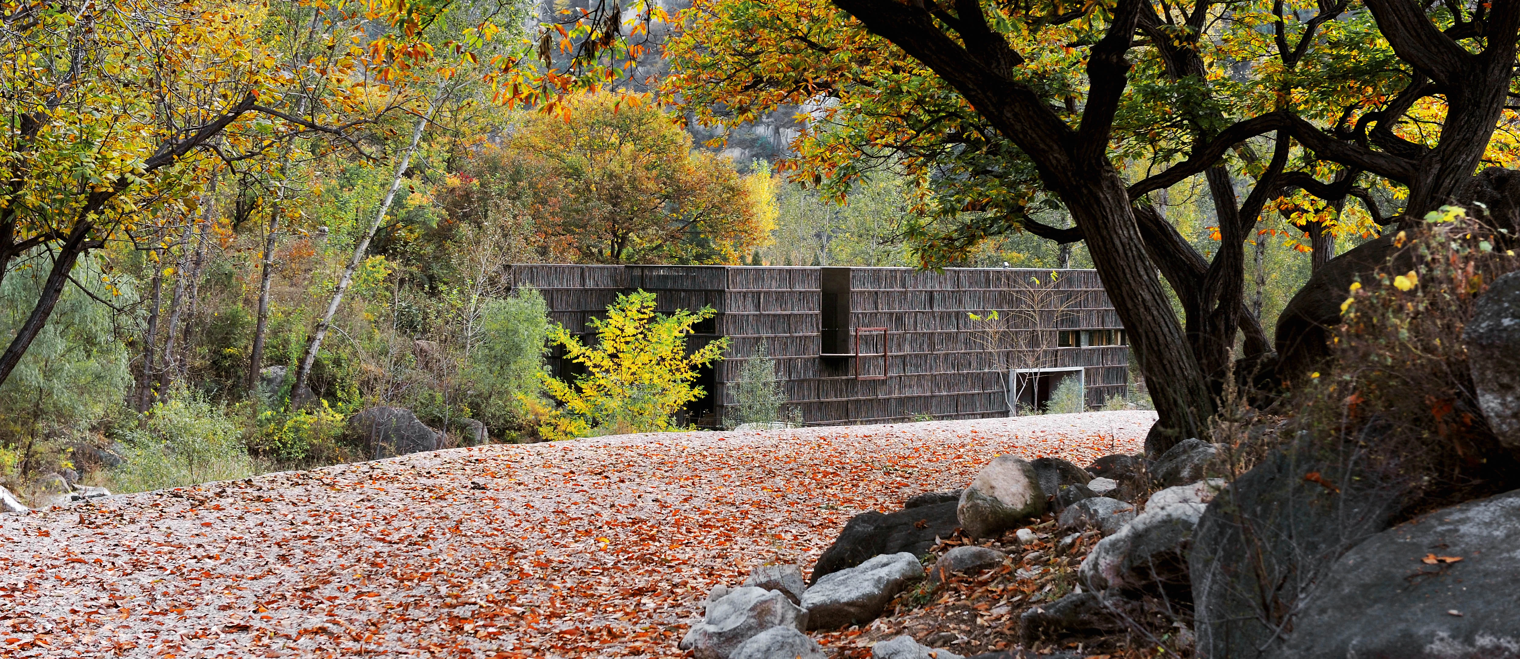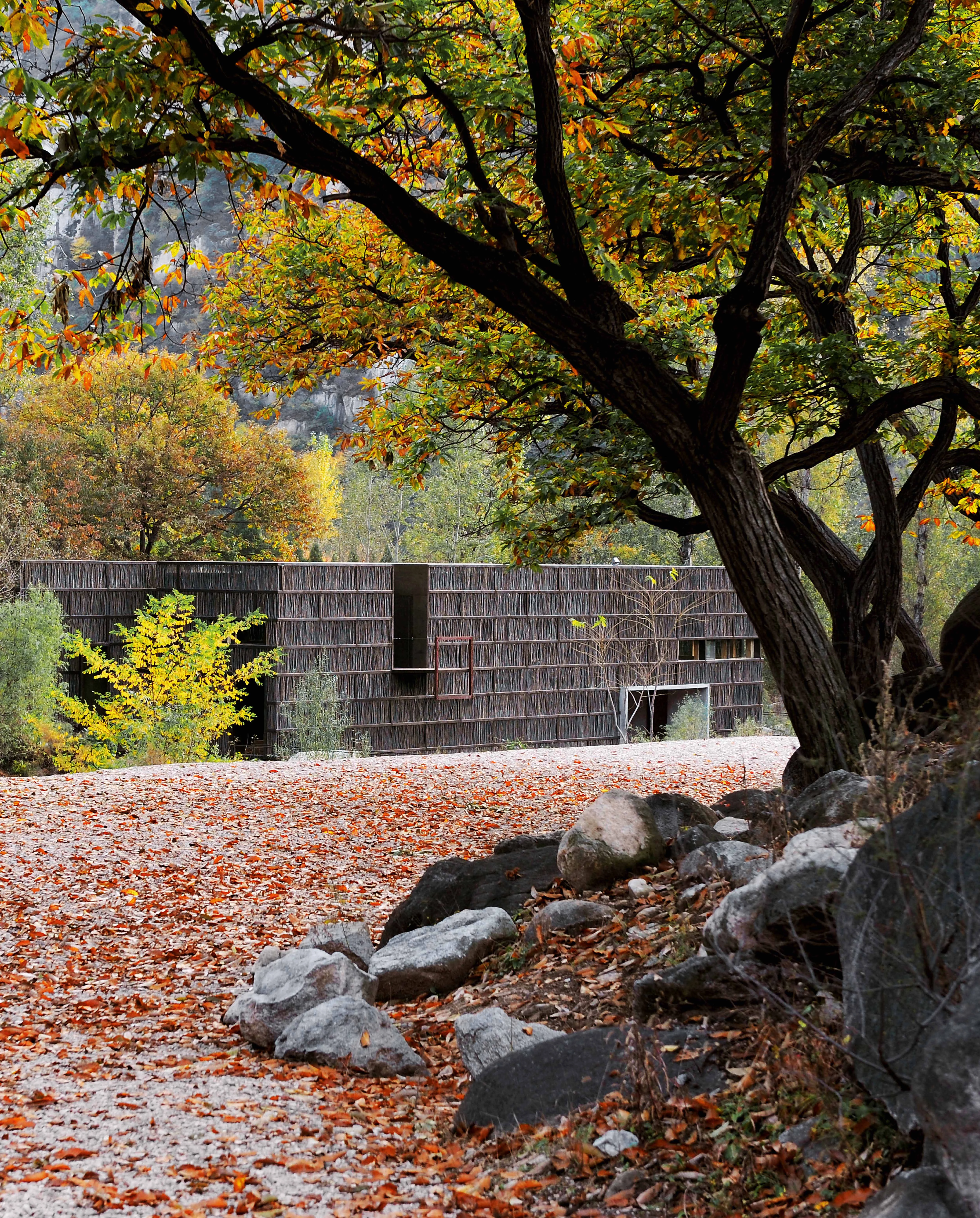 The library is a small facility for the small locality of Huairo, situated on the outskirts of Beijing, away from the hustle and bustle of the city. Distancing from the noise and stress of the huge metropolis is reinforced by the particular choice of enclave for the building, which is not in the center of Huairo but in a natural spot of great beauty – wooded and marked by the silhouette of the nearby mountains –, with which the construction engages in dialogue. It does so by means of two strategies: one consists in being modest in formal expression, not upsetting the library’s visual balance with the environment; the other is based on selecting materials of the kind that harmonize as much with nature as with the building traditions of the region. These strategies have together given rise to a simple volume carefully positioned on the site, and clad with a thick lattice of sticks of local wood which bring to mind the branches that the native population would in olden times pile up around their houses for use as domestic combustible. Such a fruitful decontextualization of an ordinary material (used here in an out-of-the-ordinary way) does not only have cultural connotations. It also addresses aesthetic intentions: the lattice of wooden sticks creates nuances in the fully glazed and daylight-bathed interior spaces, which look out to the surroundings.