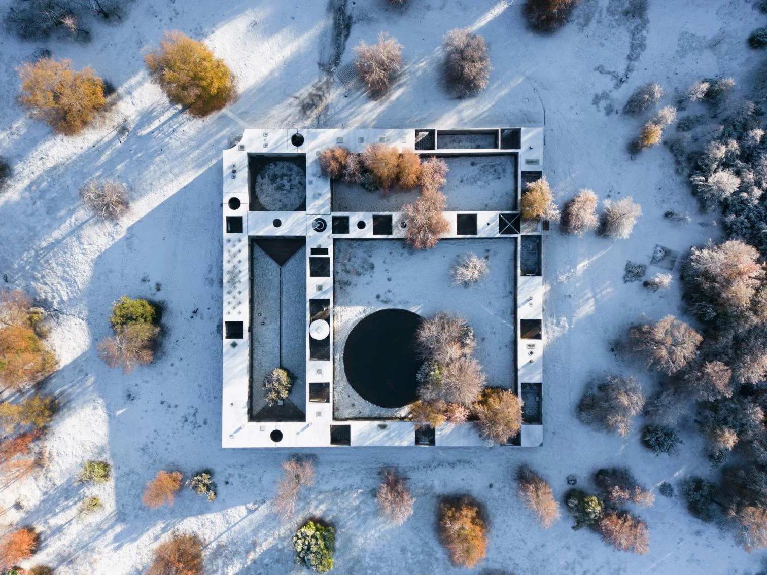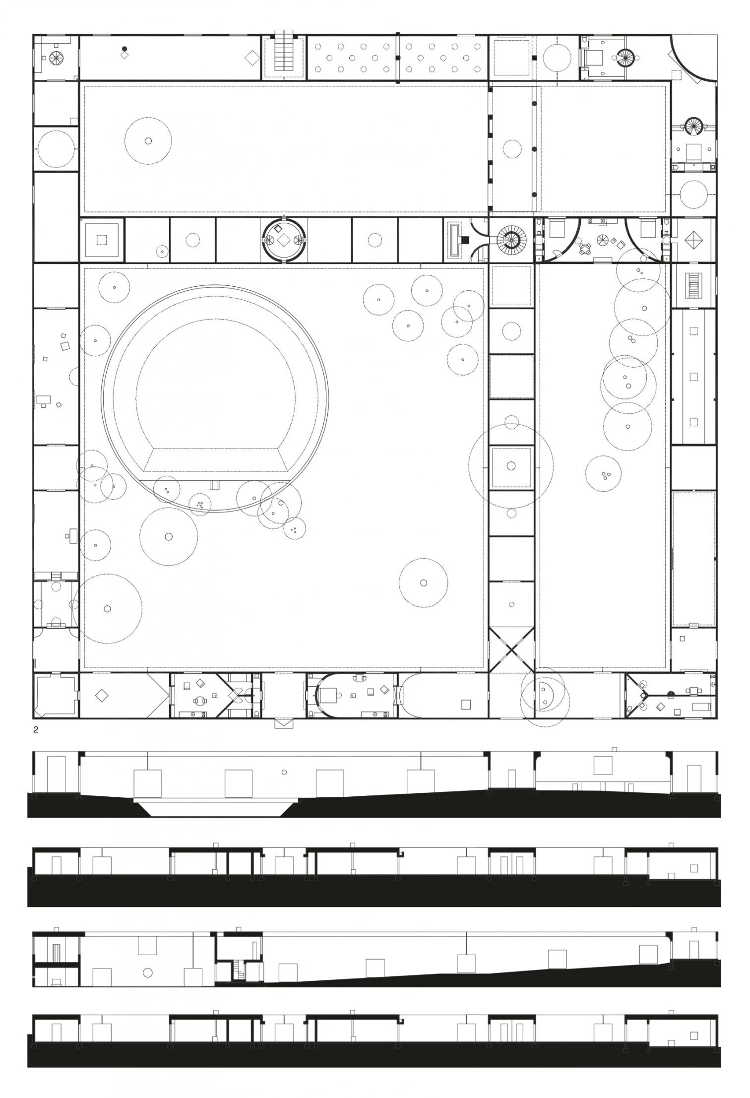 The vast complex is unified by a bold square form that an asymmetrical cross divides into four courtyards of distinct nature, in the manner of cloisters that mark and structure the uses laid