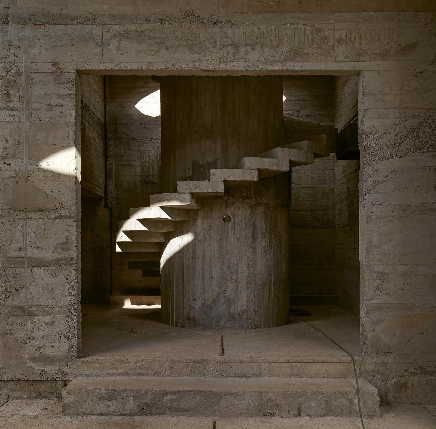 Accentuating the severe character of the volume, the concrete walls blur the division between spaces, which are marked only by the formal plays of openings that distinguish the more intimate spots of the labyrinthine galleries.