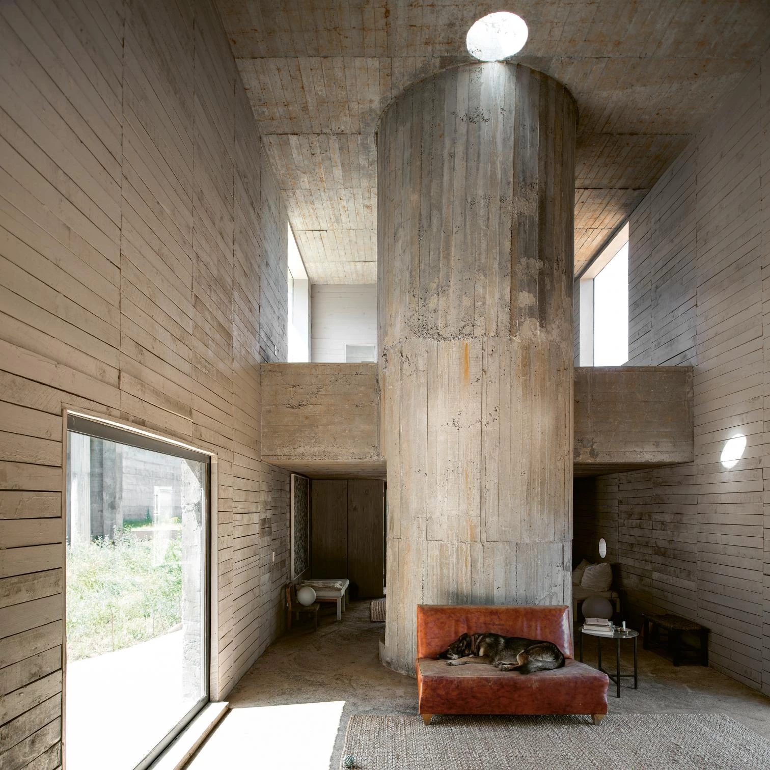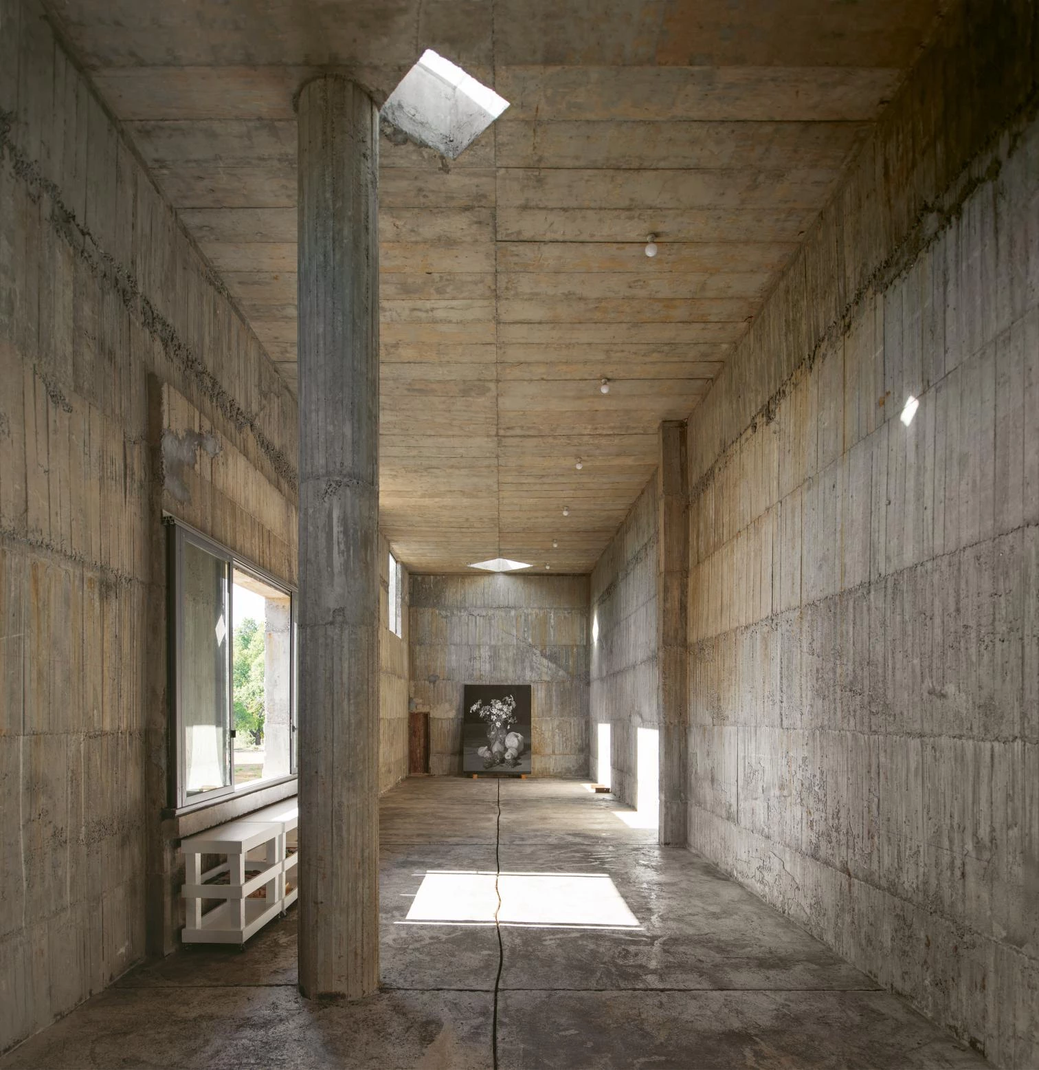 The village of Santa Lucía Alto, in the region of Yungay, is surrounded by fertile plains and high peaks. One of its lush forests in the foothills of the Andes Mountains becomes the site for his house-studio, an ambitious project of over 2,400m² that, aside from domestic and work spaces, also includes several pavilions for exhibitions; an aggregate of twelve different buildings separated from each other by visible seismic joints. It has a bold outline: a square footprint divided by an asymmetrical cross; and a severe profile, with the rough texture of exposed concrete. This rigorous geometry is accentuated by the regularity of the horizontal bands of the facade, only altered by the formal play of its openings. These rooms form a horizontal extension around four distinct courtyards: one elongated following the natural terrain; another long one totally flat and with a stream; a non-directional one filled with a circular flower garden; and one more holding a pond and old trees. These cloister-like precincts vertebrate the spaces marking a faint division between living and working areas. The spatial quality of every room is punctuated by singular openings that create corners of intimacy in some areas and monumental double heights in others.