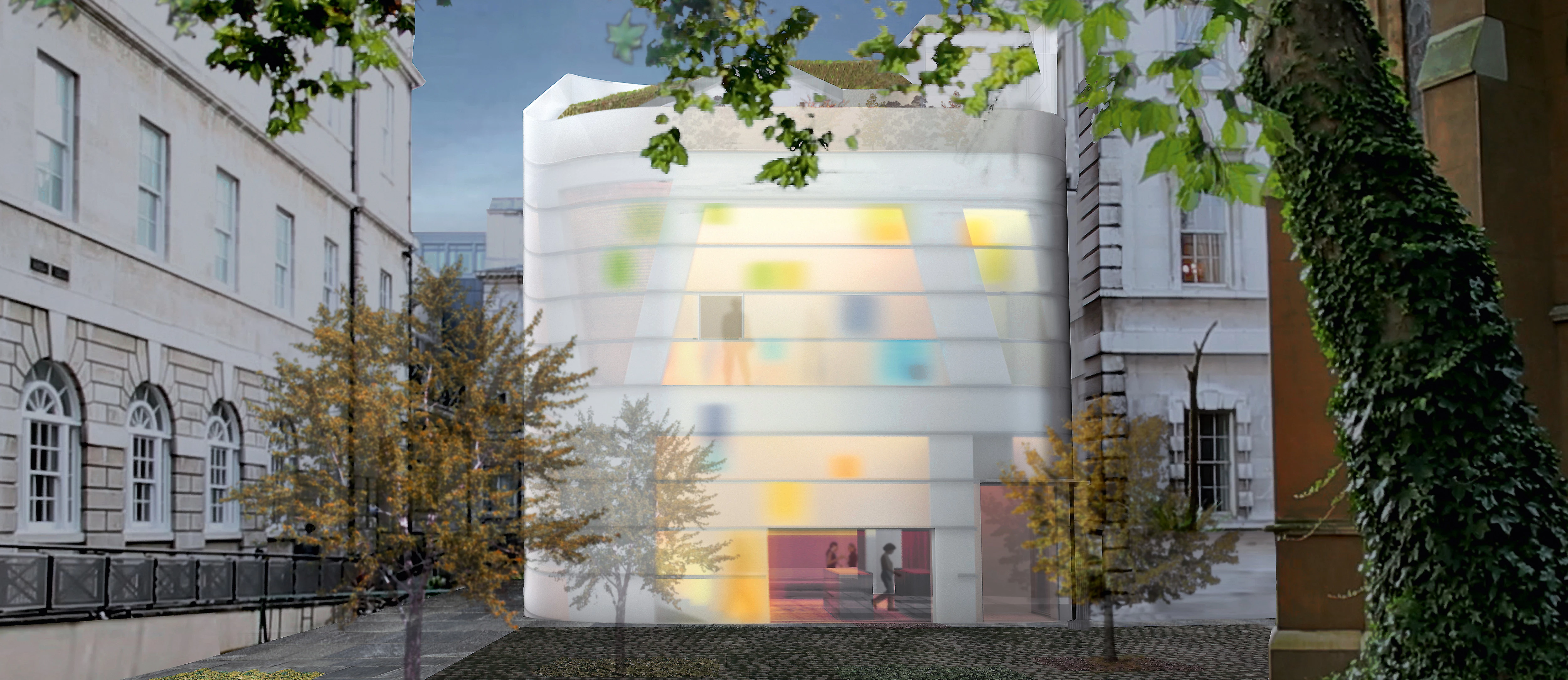 St. Barts Hospital is expanded with this support center for cancer patients. Adjacent to the 17th century stone structure by James Gibbs, the interior branching structure has an outer layer of matte white glass with colored glass fragments recalling Medieval music notation... [+]