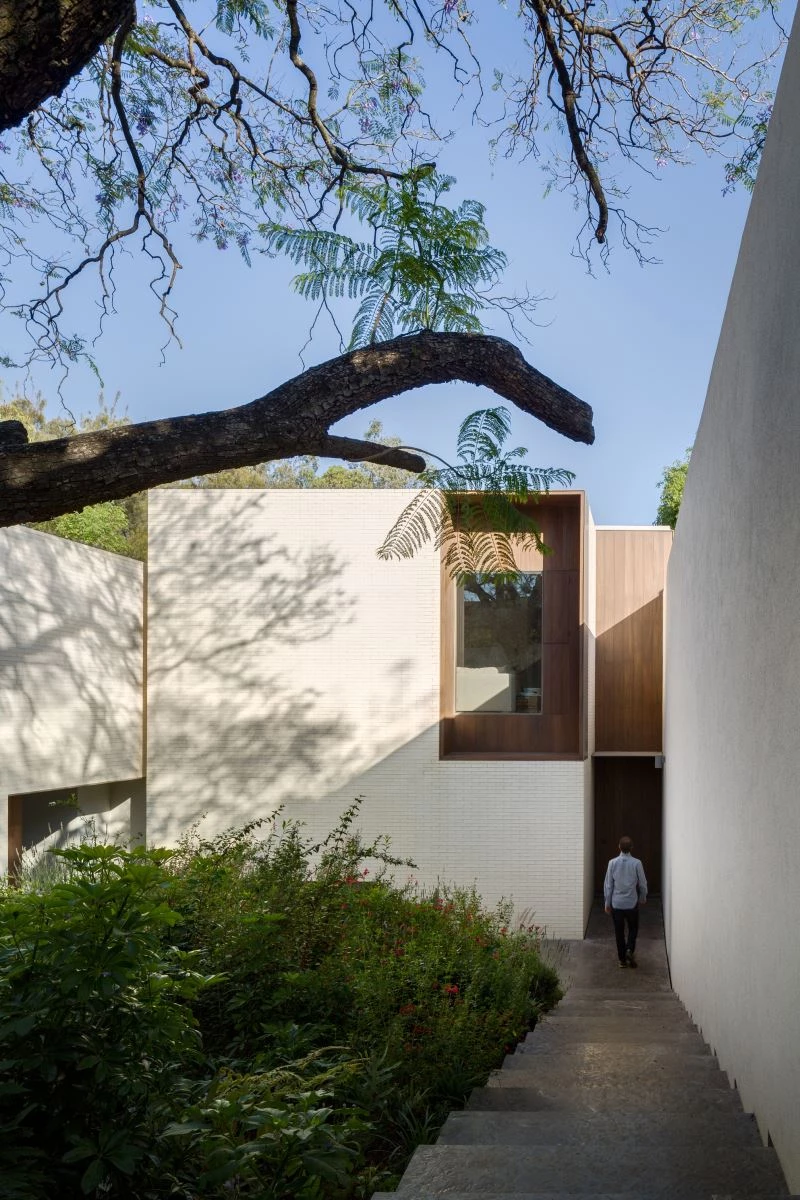 Manuel Cervantes EstudioA work of the Mexican firm Manuel Cervantes Estudio, this residence seeks to optimize light and engagement with the outdoors. Wrapped in a ceramic skin, the composition of interlocking volumes adapts to the slope of the site, diluting the boundaries between inside and out. Access is mainly through an almost entirely blind construction entered at ground level, respecting the different grades of the terrain. The program comprises three volumes on the lower floor, which harbor shared zones, the kitchen, and a study. Upstairs, along a corridor, are the bedrooms.