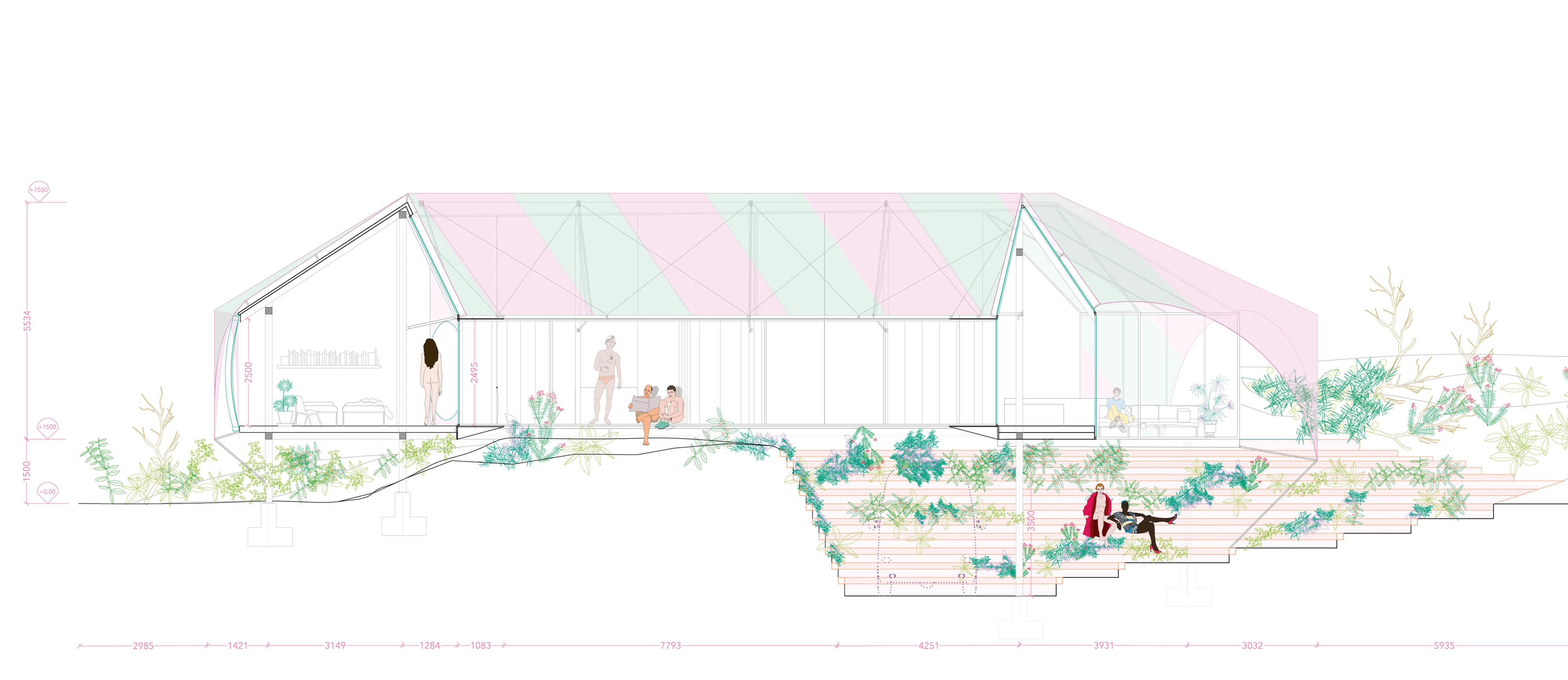 Elevated on a steel structure and wrapped in planes of glass, refrigerated panels, and polycarbonate skylights, the house is organized around an elliptical crown of tractioned marble that invites to observe domestic everyday life... [+]