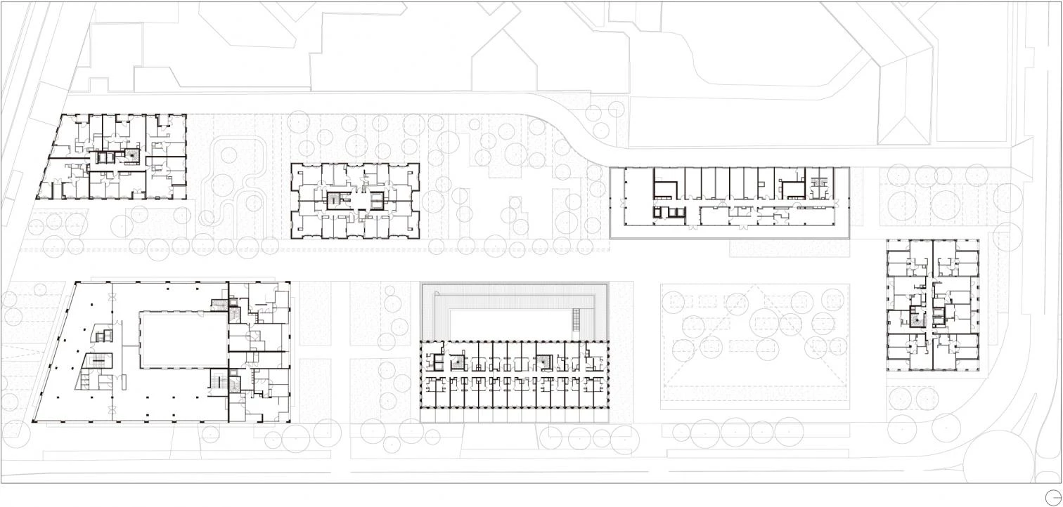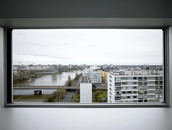 The plot is divided into a system of longitudinal bands arranged along the north-south axis, with new paths that highlight the relationship between the site’s core and the river. Interior spaces formed by the construction of the six buildings emerge in the form of squares, terraces, and gardens. Though the parcel is private, all the outdoor spaces are open to the city. This neighborhood has become fully pedestrian and is traversed by a central avenue. It is the spinal column of the block and leads to the heart of the project, a wide square in front of the tower, renamed ‘360° View,’ where
