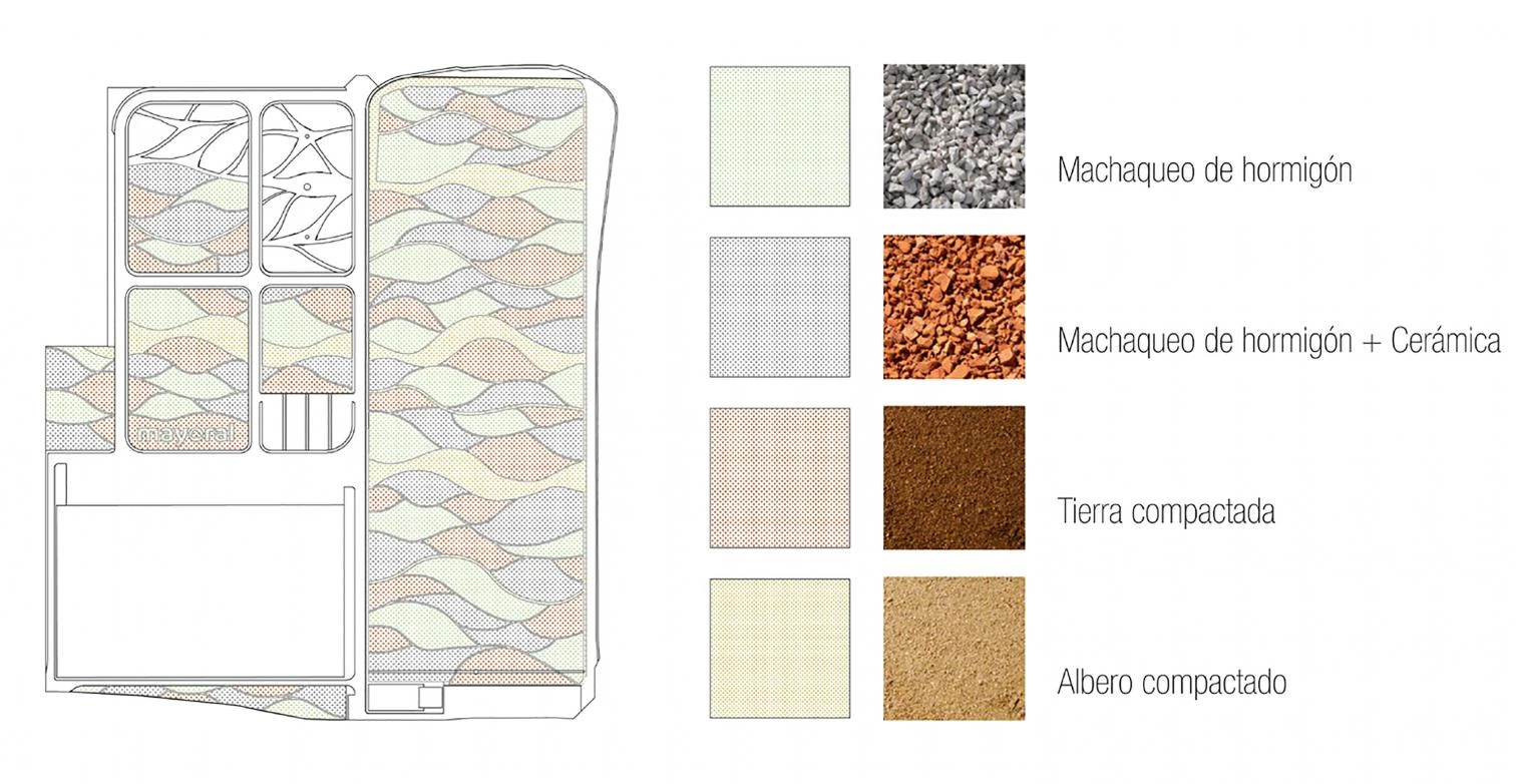 The plans for the rest of the plot involve an economical landscaping project covering more than 10 hectares, foreseeing that those spaces will be occupied by future constructions. This is achieved using recycled materials from the demolition of the buildings in the ensemble, placed according to the wool fabric structure, creating a pattern that organizes the exteriors.