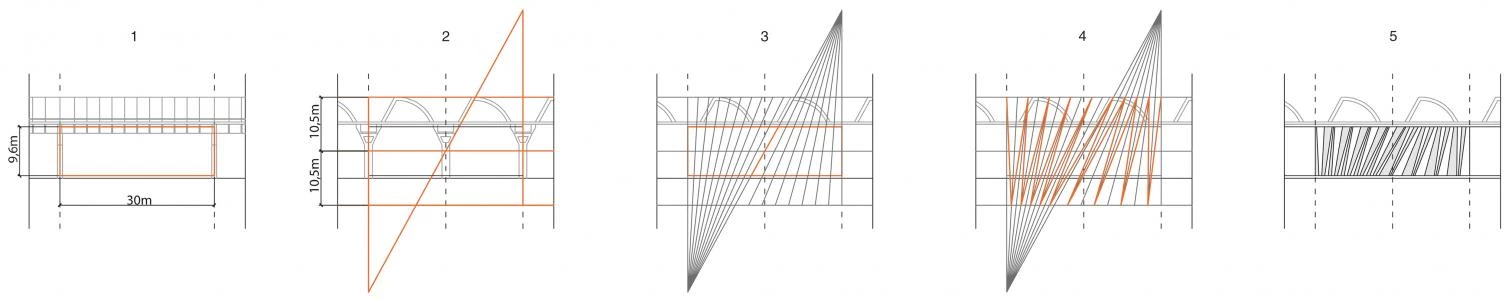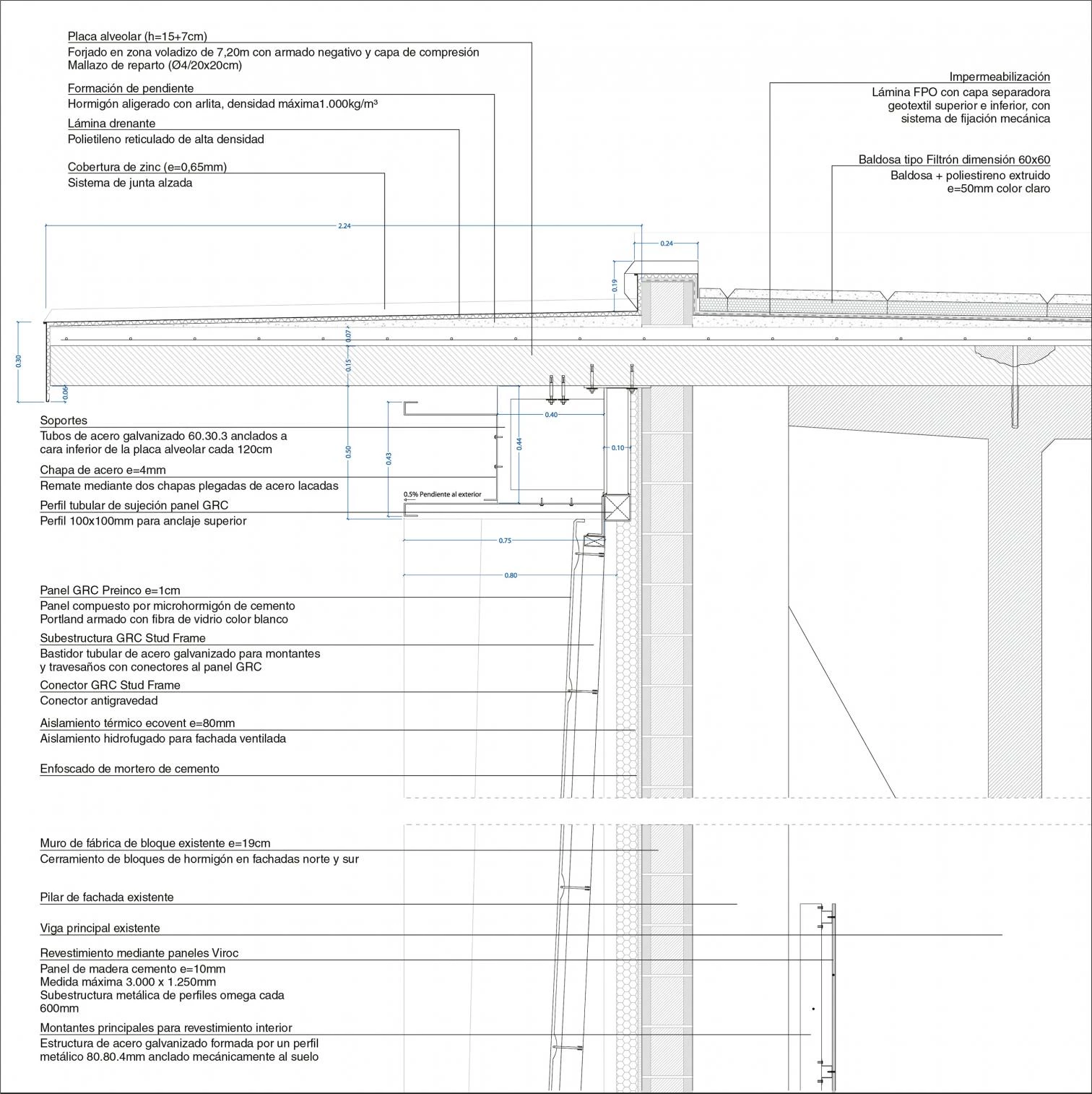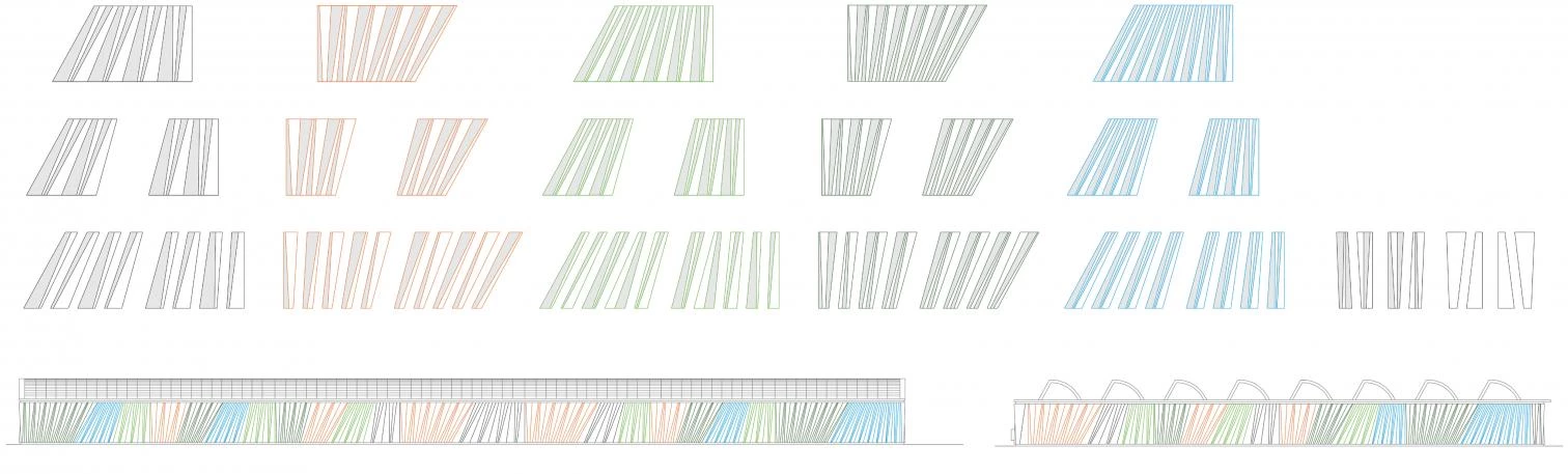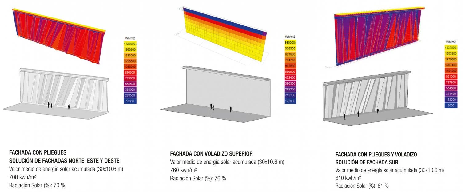 The main challenge was to integrate the three objectives, and this is how the design strategy emerges, consisting in the creation of a textile-like solar protection system as guideline for the final form: a ‘dress to protect the building from the sun.’ By using the largest GRC panels manufactured in Spain it is possible to create a new facade, like a pleated skirt that reduces solar radiation by 39%. The proportions of the cross section are used to integrate the folds in the building, so that the scale and form of the panels emerge from a geometric process of modulation of the existing structure, using the slope of the sawtooth roof as the system’s main direction.