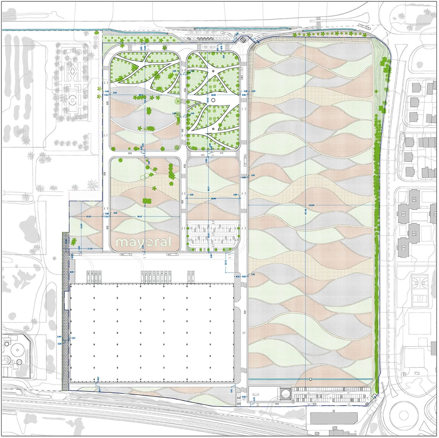 The textile inspiration is present both in the new facade of GRC panels covering the old shed and in the landscape design for the rest of the site, which is prepared to welcome new buildings of the company.
