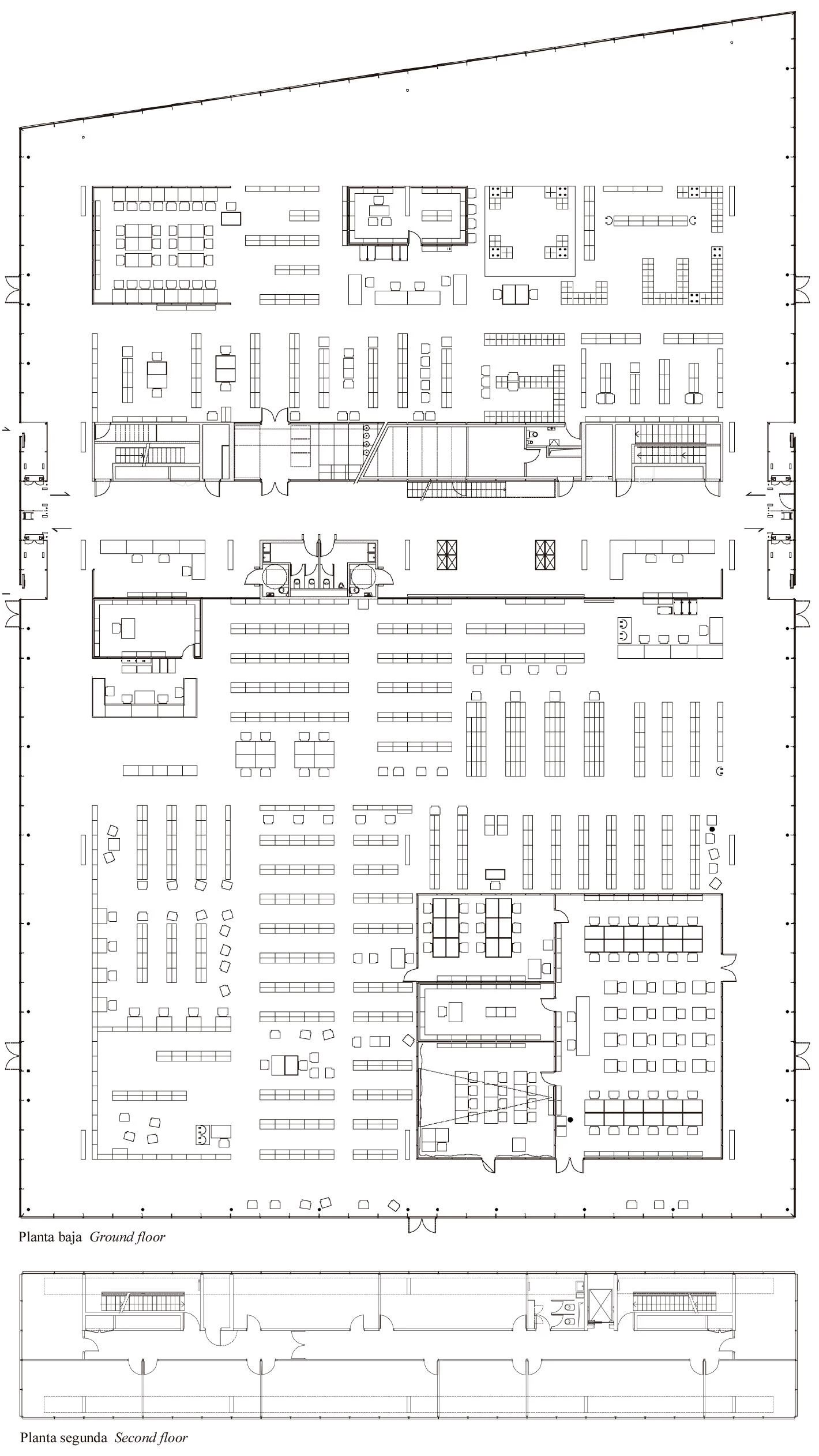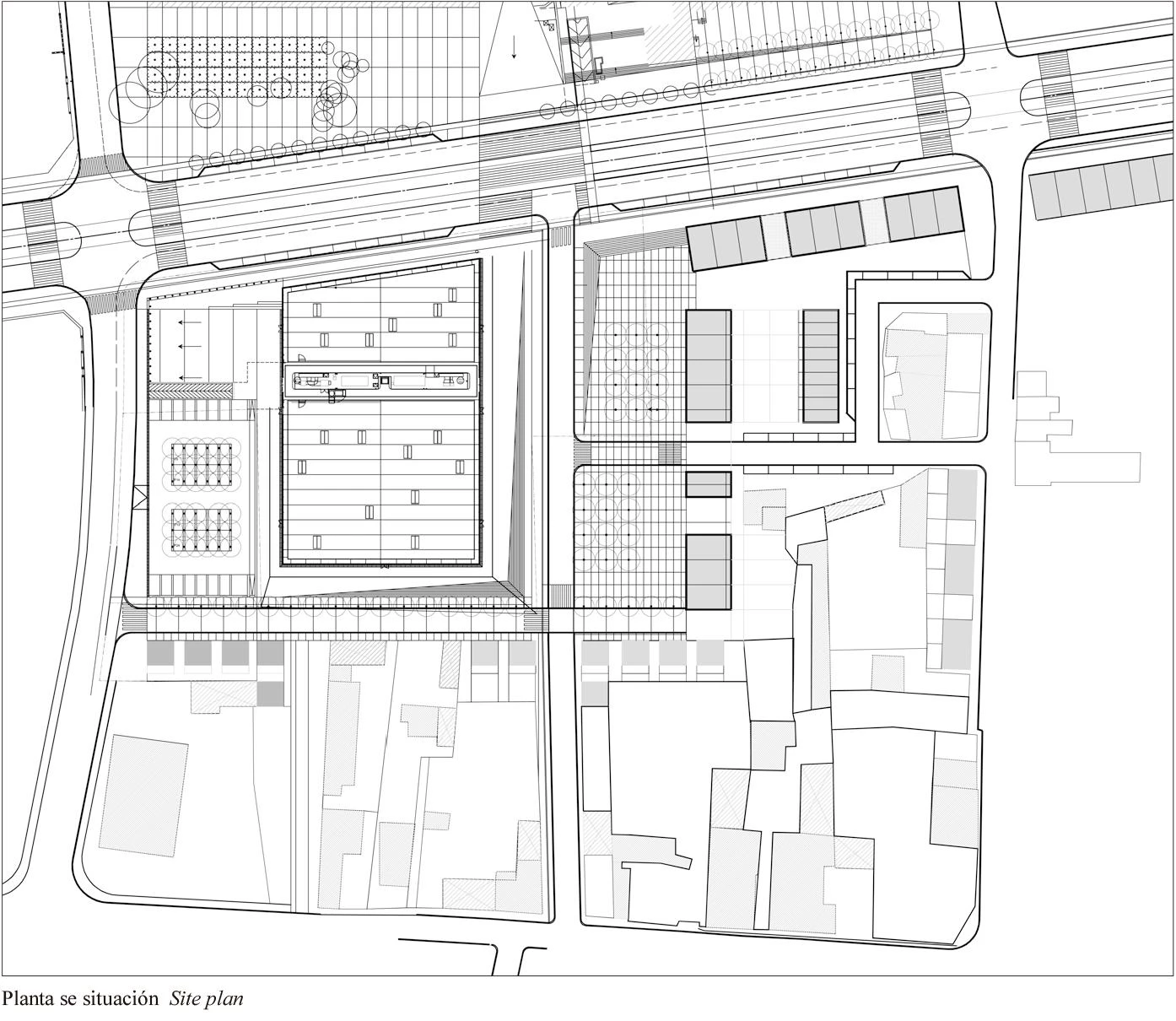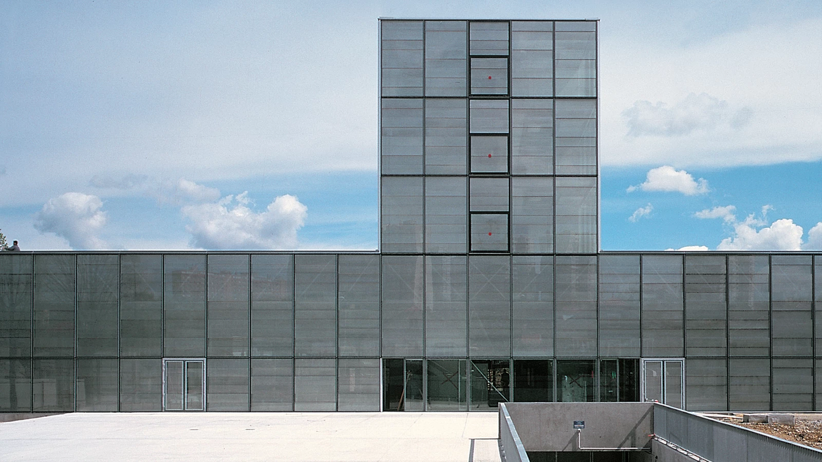 The economy of the scheme resides in its simplicity; the building is made up of a single ground floor for the Media Library and a small building for the services. At the heart of this assemblage, we find the entrance hall in the form of an urban passageway between the square (to the west) and the meadow (to the east). From this space we can get to the offices located in the small building placed on the roof. This roof is pierced by different overhead openings, which bring daylight to the center of the building.